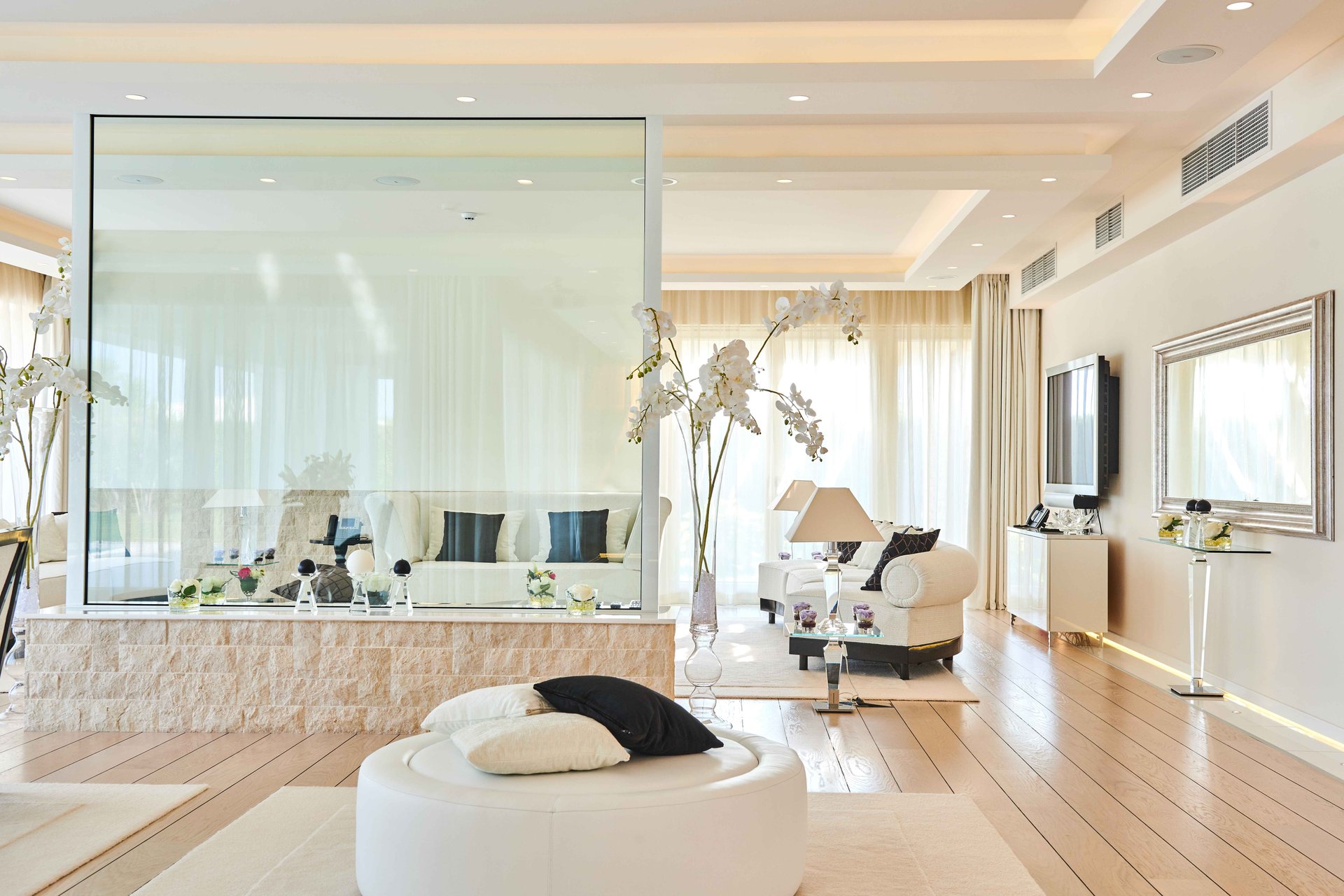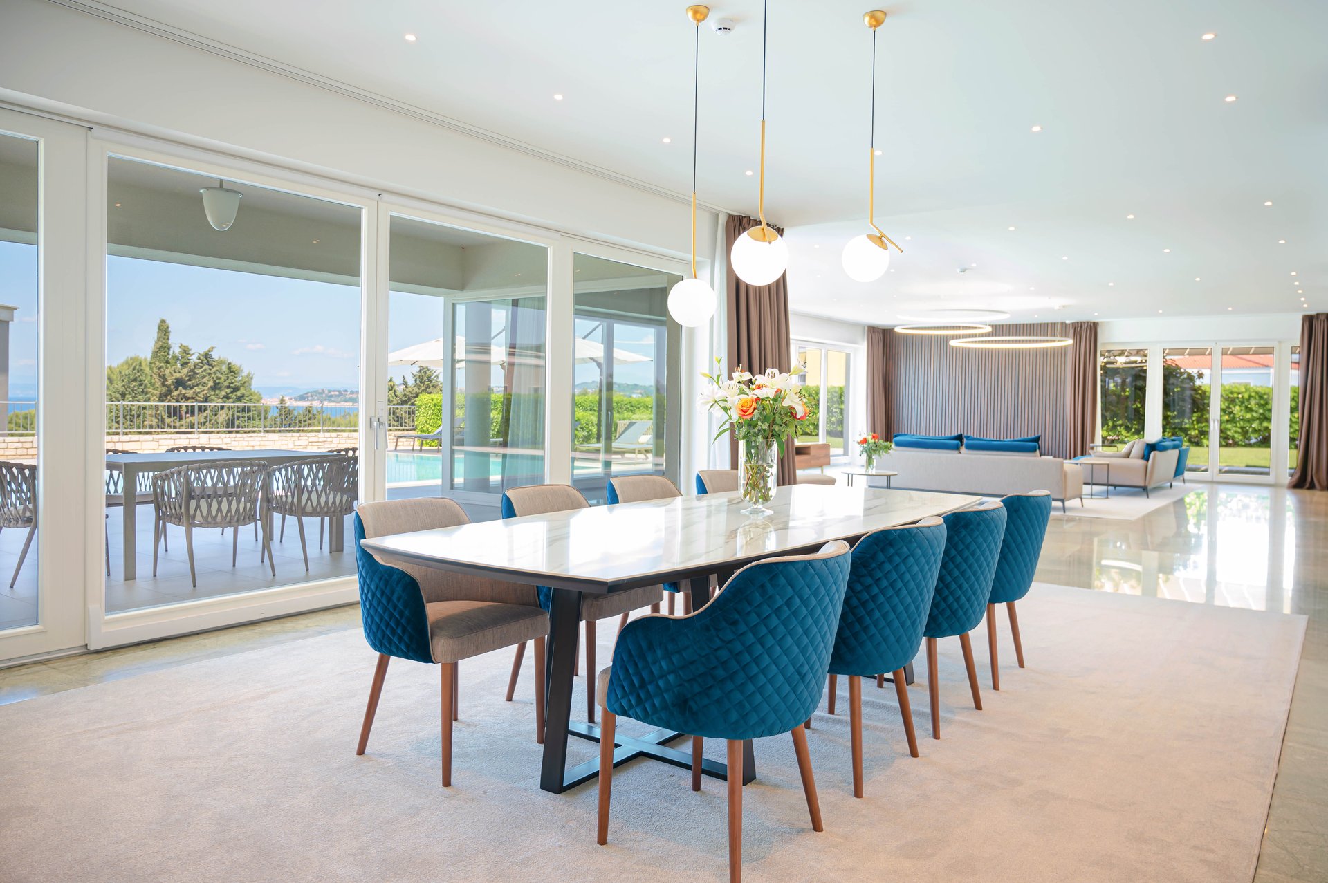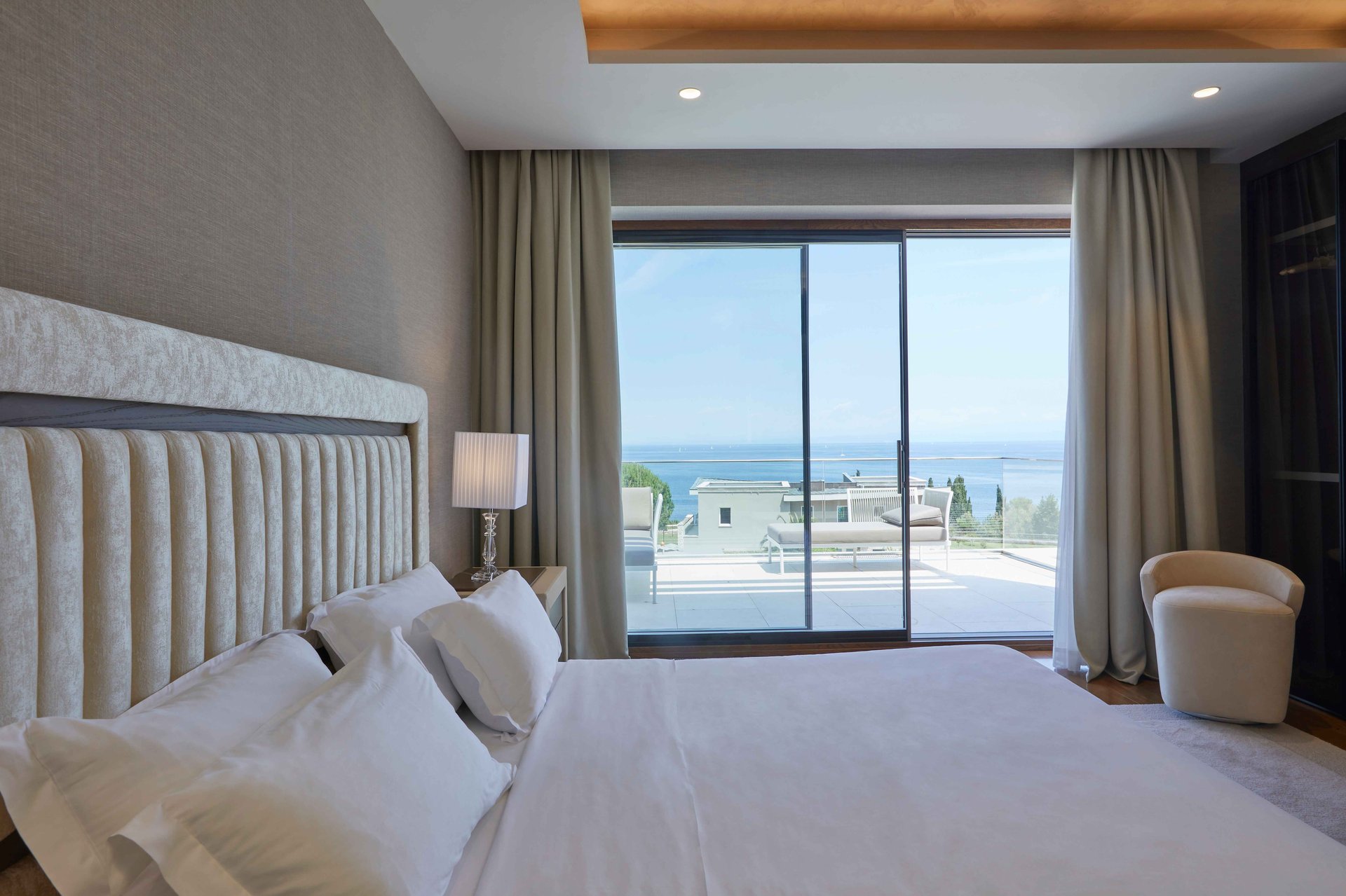 Each villa presents three exquisitely designed bedrooms, each with its own terrace and stunning views of the Adriatic coastline, offering a serene and luxurious retreat, perfect for relaxation after a day of exploring or unwinding in privacy. Additionally, the villa includes two staff apartments, each featuring a bedroom and bathroom, ensuring your stay is supported by the highest level of comfort and convenience.