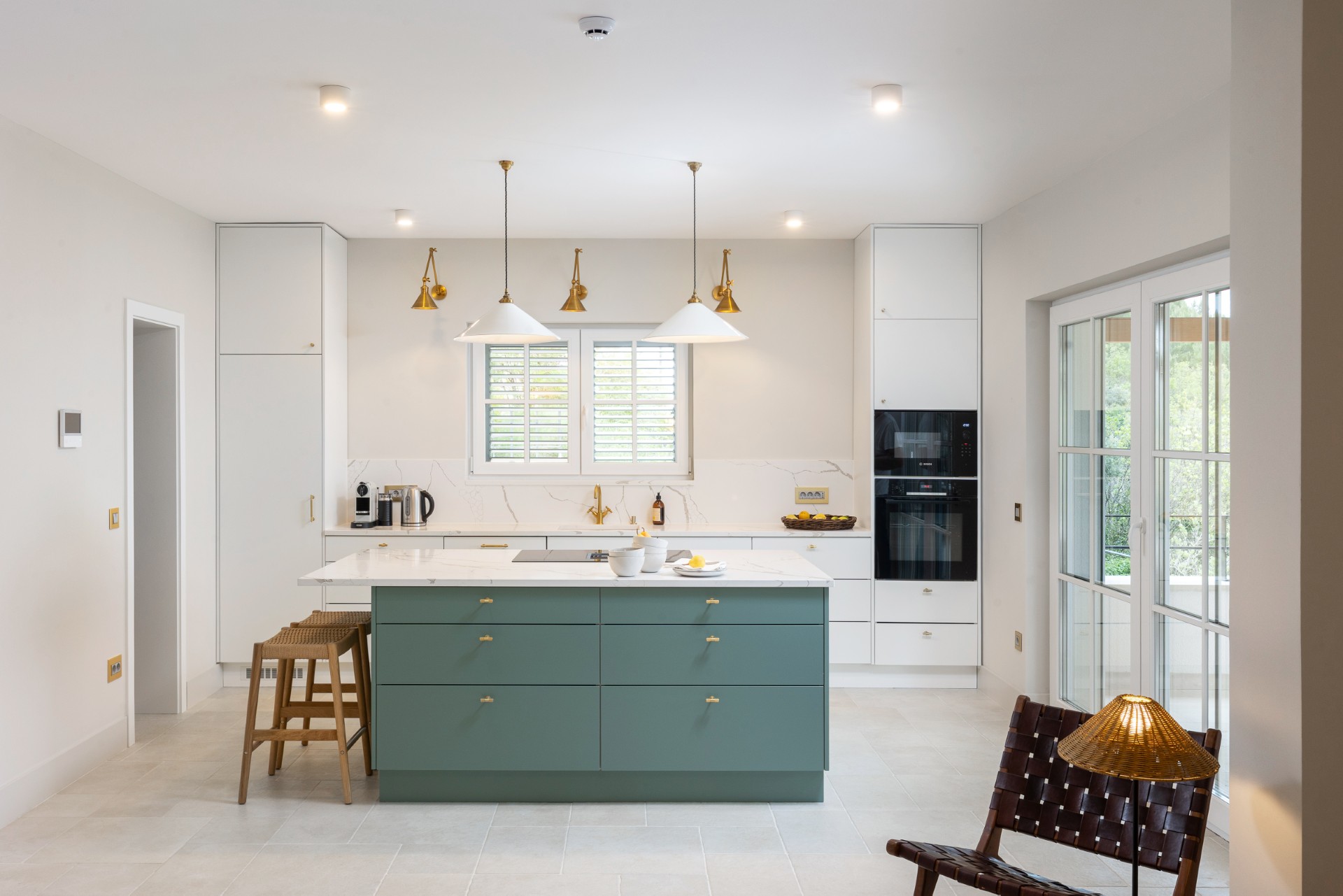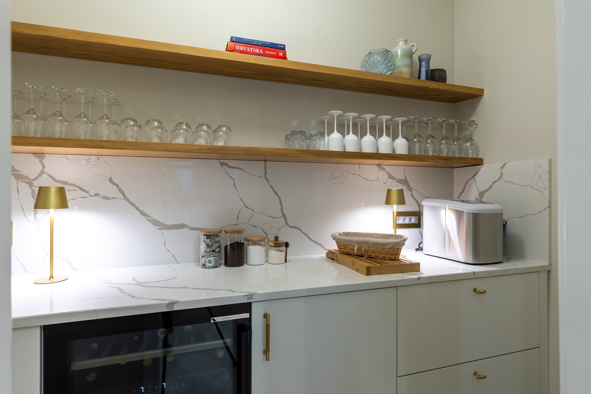 At the heart of the home lies an open-concept living area, where a fully equipped designer kitchen with premium appliances flows into a spacious dining area for eight and a sophisticated lounge space. Two wine coolers, curated tableware, and refined finishes create an atmosphere perfect for long Mediterranean dinners and relaxed evenings indoors.