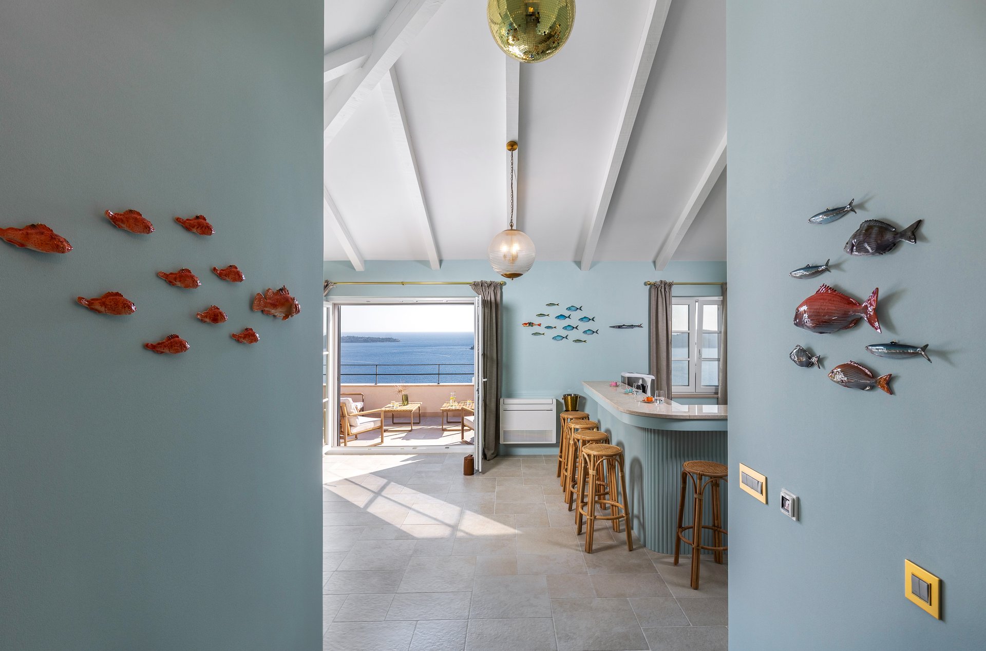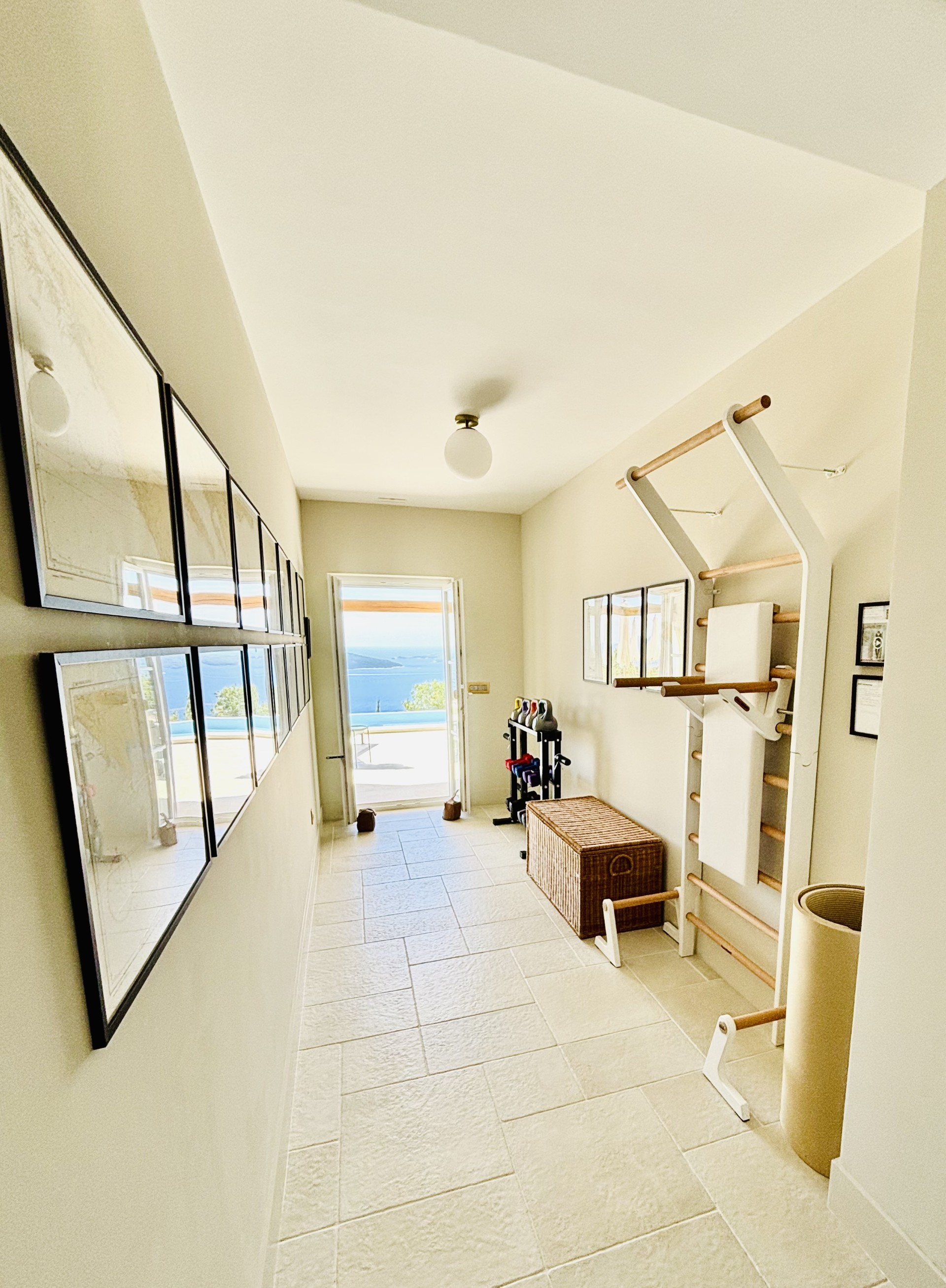 Lower level: Two sea-view en-suite bedrooms with terrace access, wine cellar, and laundry room.