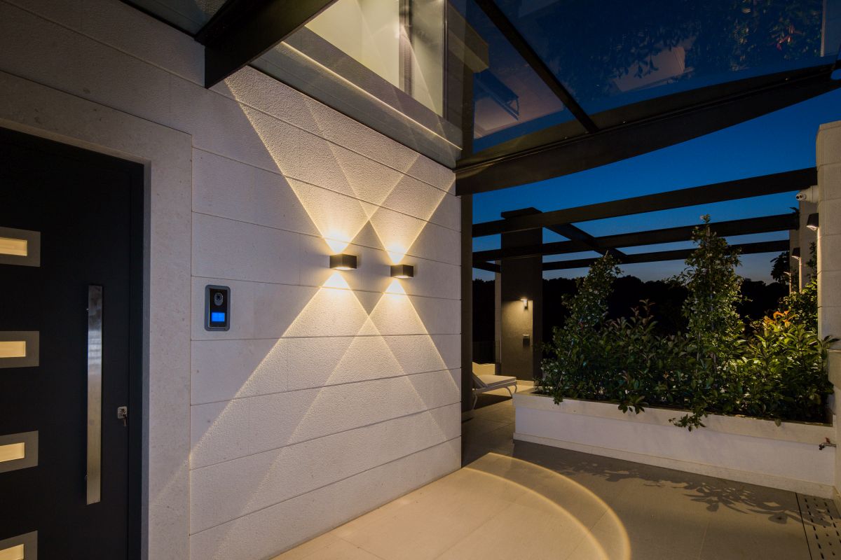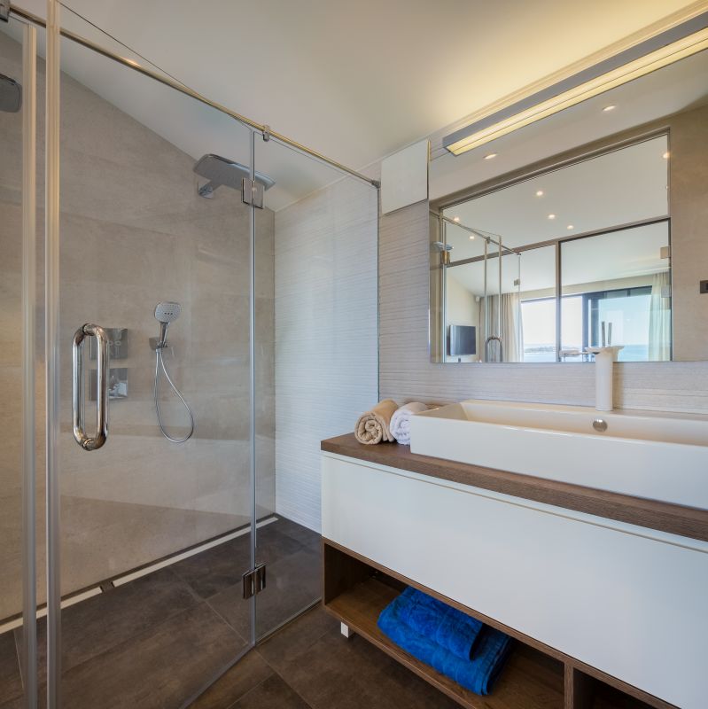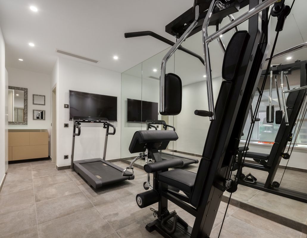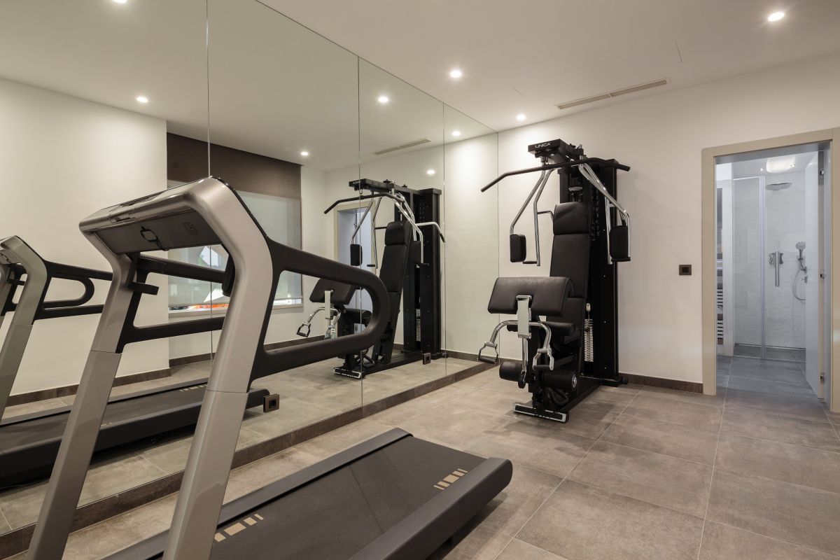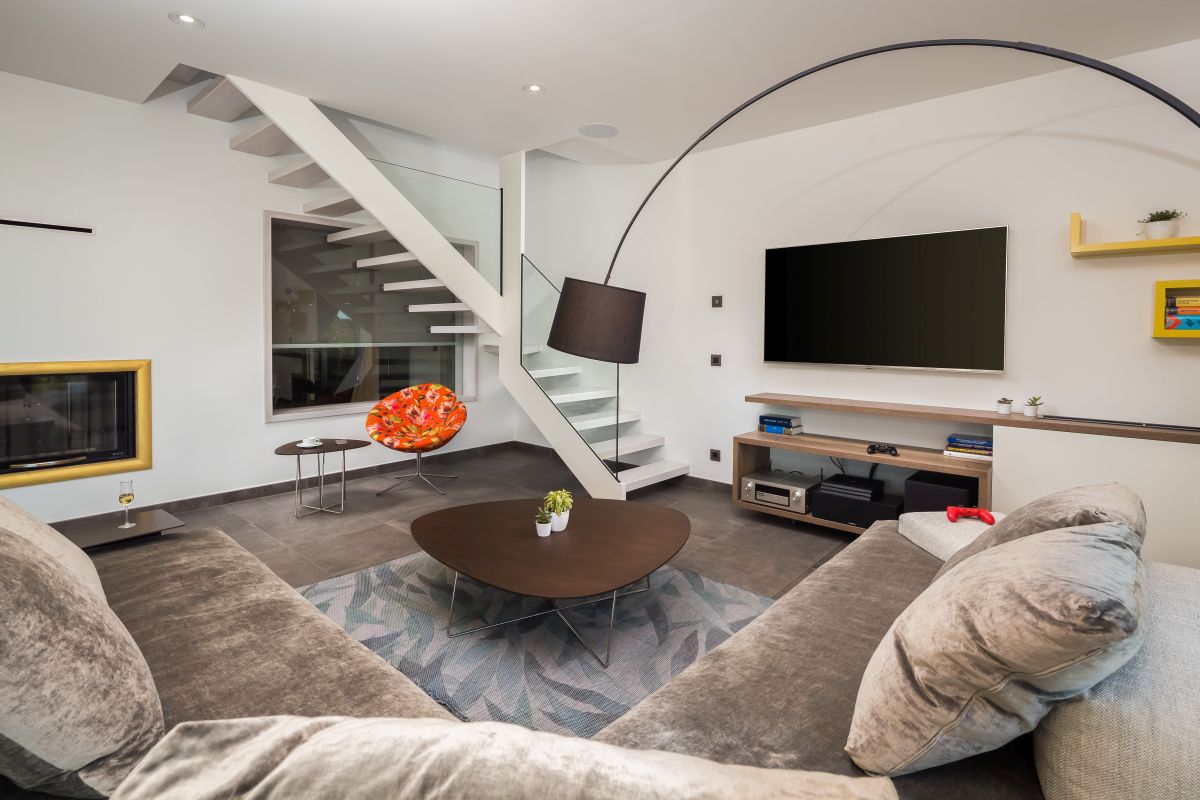 The bright and elegant living room and sitting area are exquisitely furnished with designer furniture, lighting and carpets. Both have access to the terrace and the swimming pool and overlook the sea. There is a Jacuzzi bath in the living room extension. Guests can also enjoy the fully equipped gym and modern sauna.