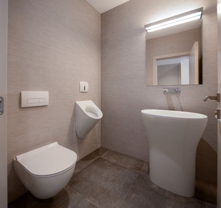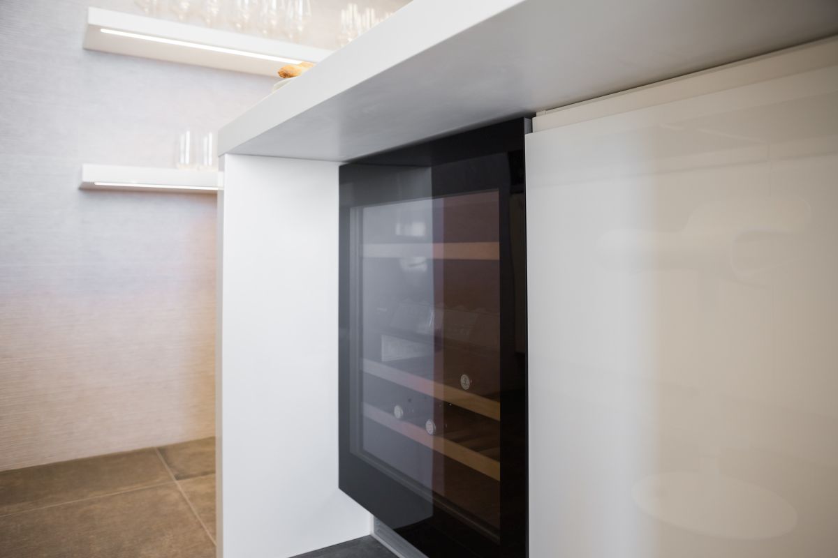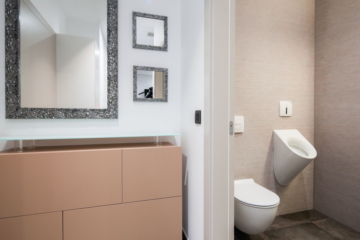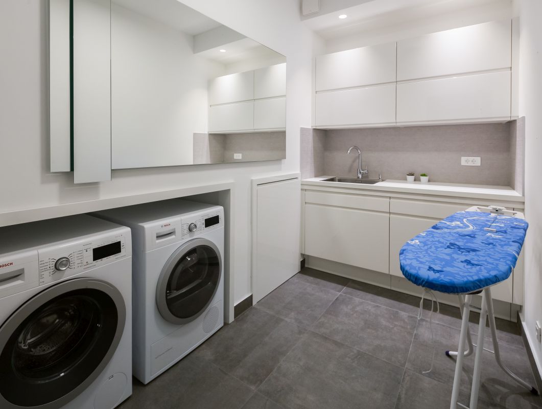The bright and elegant living room and sitting area are exquisitely furnished with designer furniture, lighting and carpets. Both have access to the terrace and the swimming pool and overlook the sea. There is a Jacuzzi bath in the living room extension. Guests can also enjoy the fully equipped gym and modern sauna.