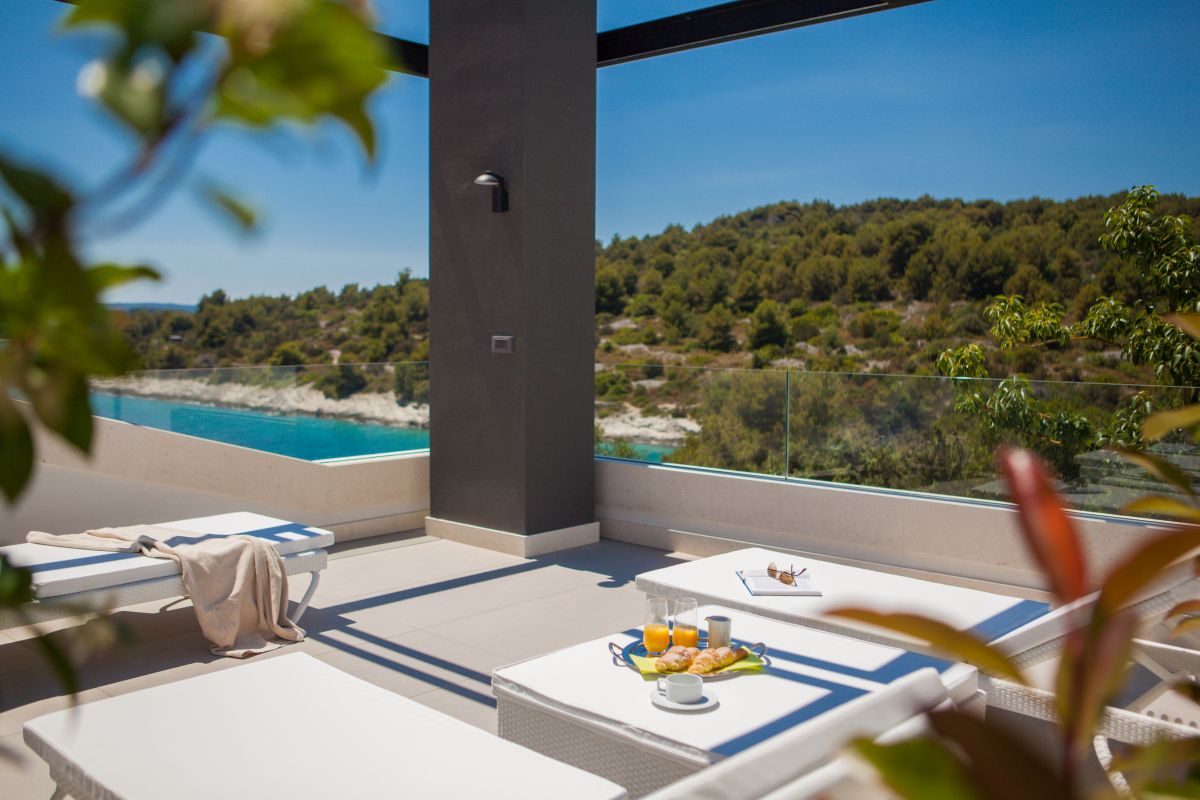 The property has a private entrance and a parking area for 5 vehicles and is situated just 30 meters from the small beach. The grounds at this stunning villa feature a private infinity swimming pool, children’s playground, a garden and a shaded pergola. The terrace area surrounding the pool and the upper lounge terrace are equipped with luxurious and comfortable sunbathing loungers, LCD TV and sound system. You will also find a lovely dining set for ten and a barbeque.