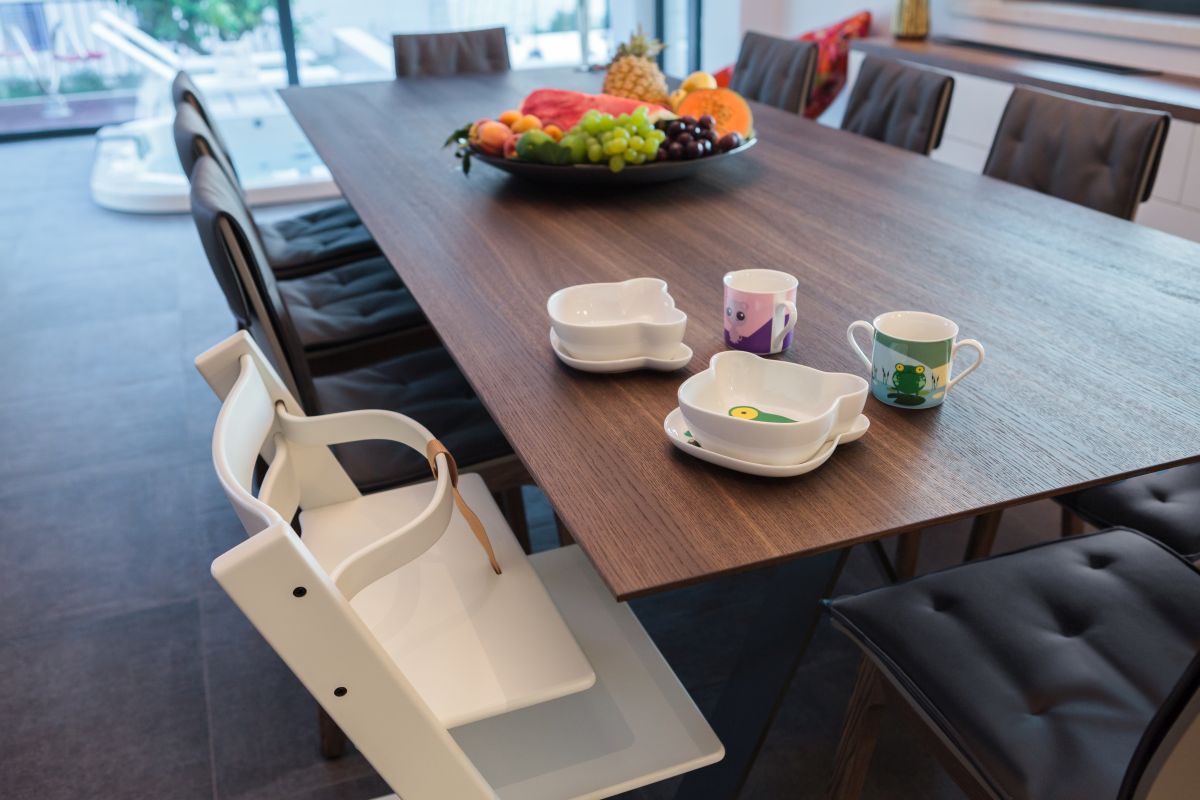 The open plan formal dining space connects with a modern, very well equipped kitchen, an outdoor patio and the barbecue area. The large outdoor dining table by the swimming pool is perfect for all day sea breeze dining.