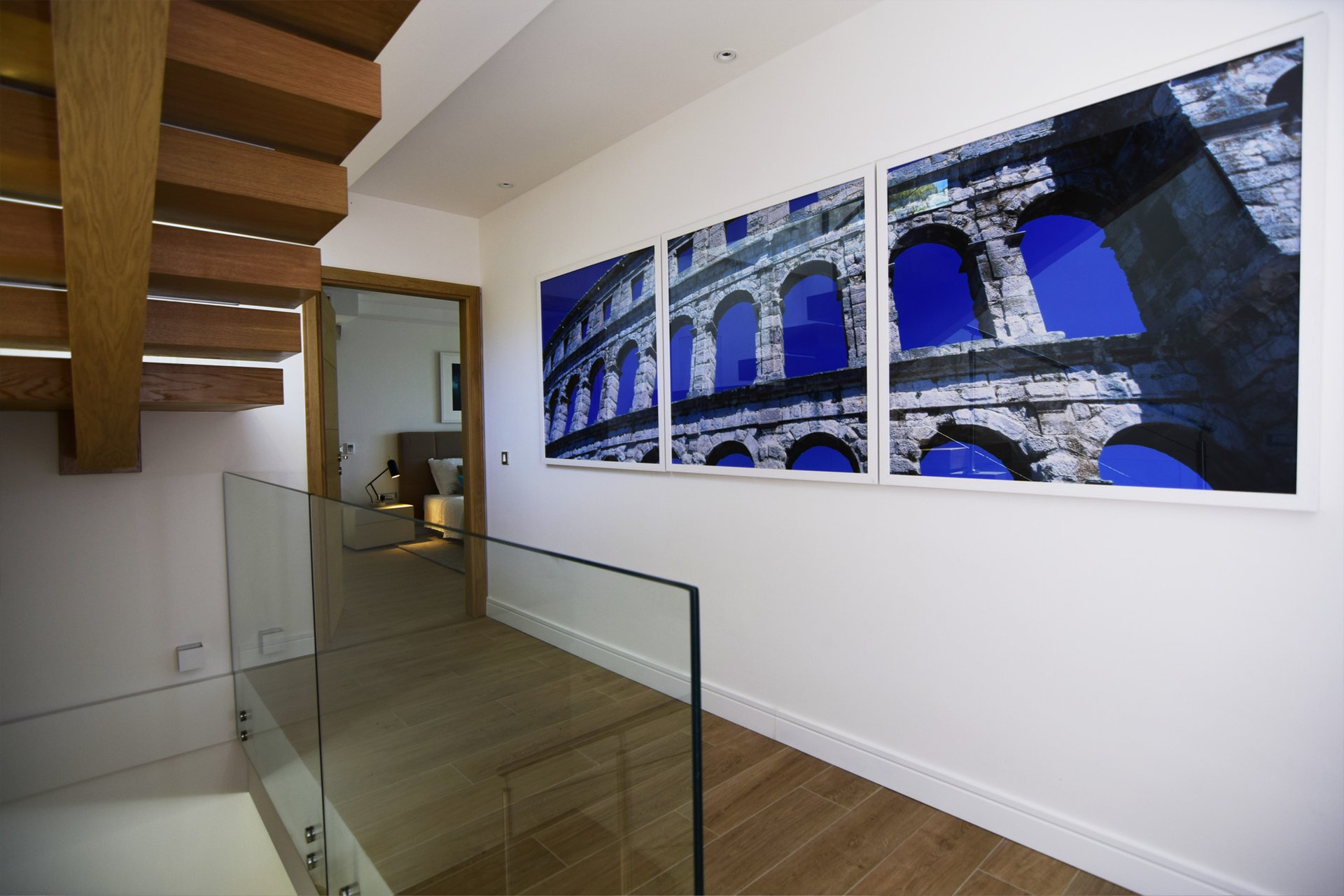 From the main terrace, there is an entrance to the ground floor of the villa. Here, you will find a spacious, luxuriously decorated modern living room, two fully equipped kitchens, toilet, and a laundry room. From the living area, there is an entrance to the spa area with a gym, infrared sauna, and a bathroom. You will also be able to explore all the secrets of Dalmatian wines in the private wine cellar. On the first floor, you will find three very spacious and luxuriously decorated bedrooms, each with its own en suite bathroom (Room 1, Room 2, and Room 3). All rooms are south-oriented and have a magnificent sea view.