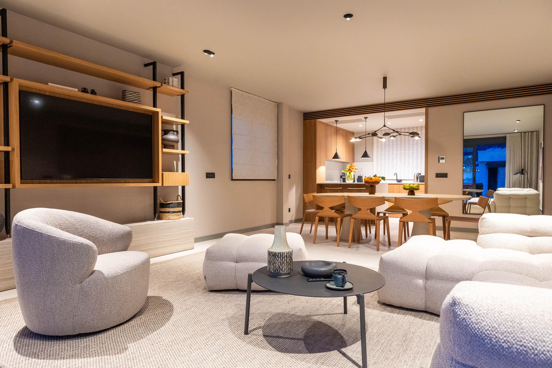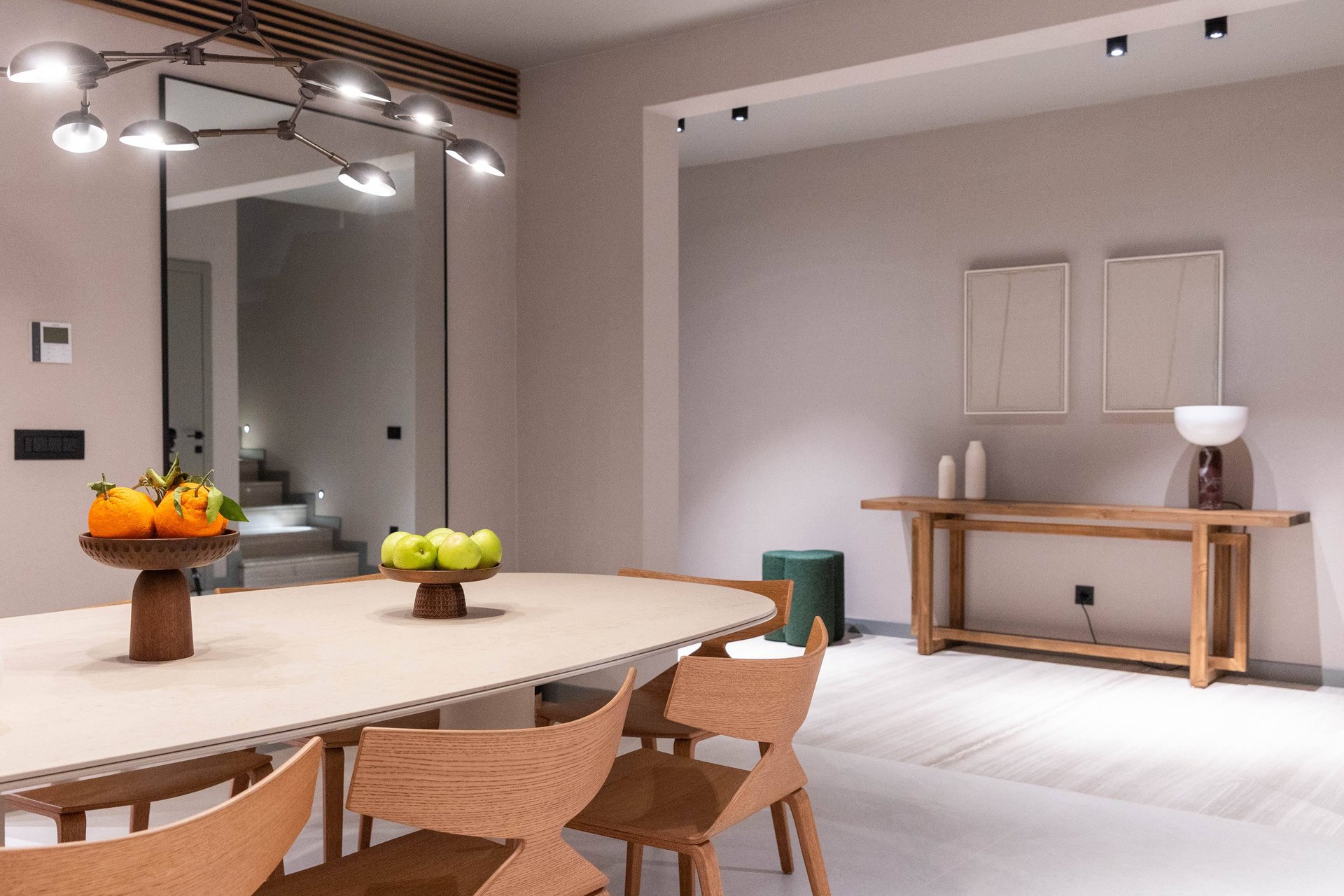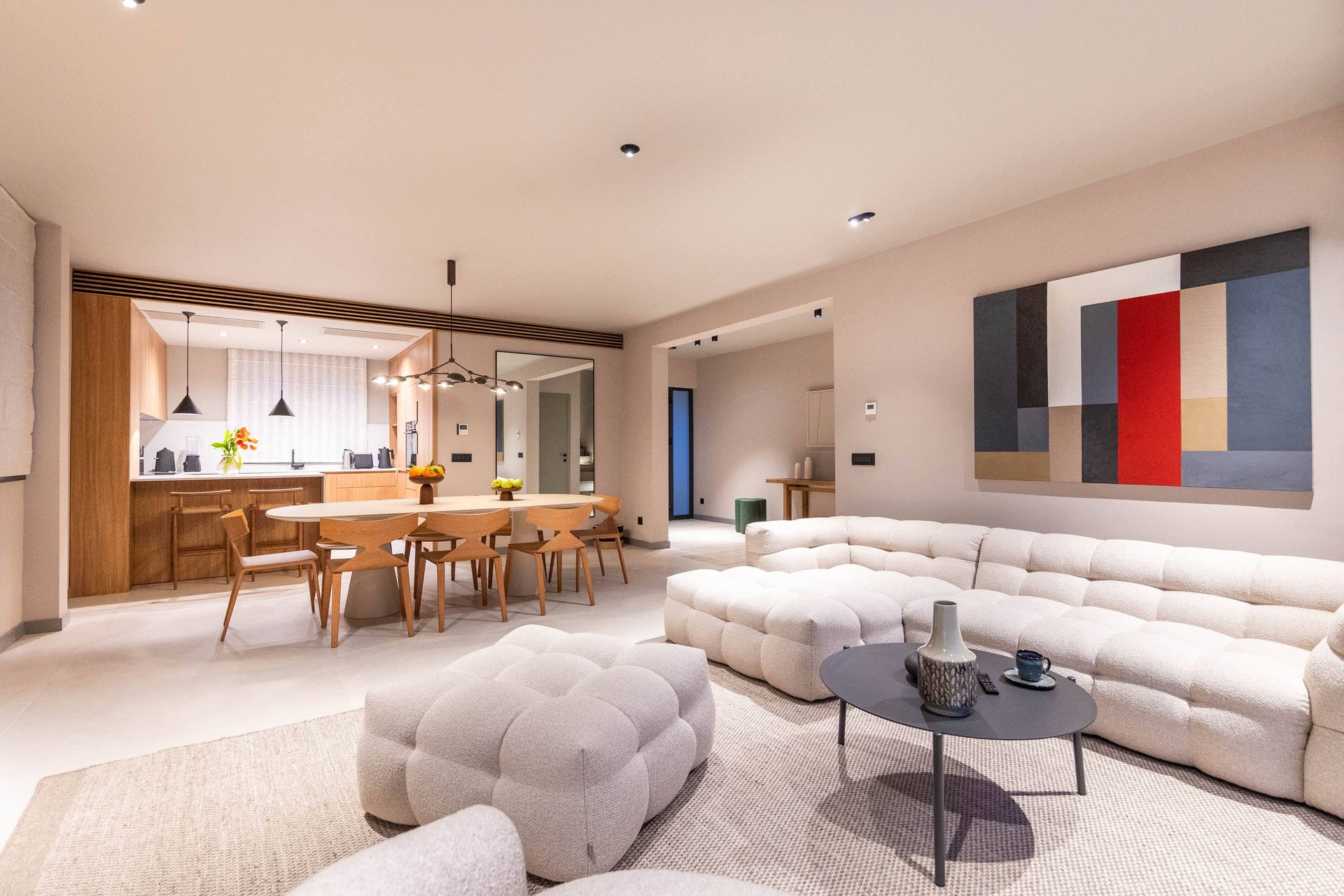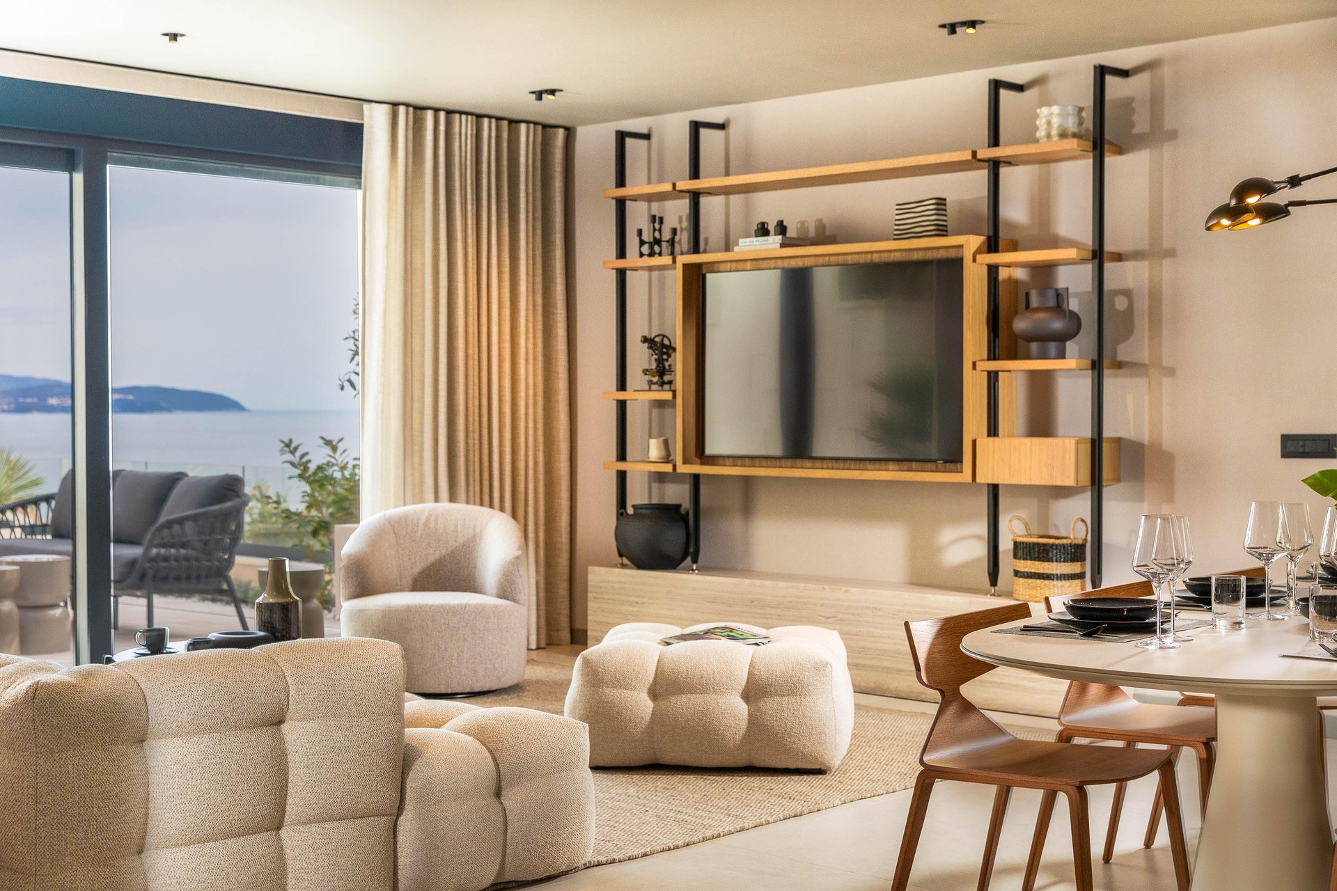 Inside, the villa continues to impress with its airy, light-filled design. Large glass walls allow natural sunlight to flood the interiors and ensure that the sea is never out of sight. The main living space is both sophisticated and inviting, offering the ideal place to unwind after a day of exploration. Decorated with a modern yet warm aesthetic, it reflects a perfect balance of elegance and functionality. The fully equipped kitchen is a culinary haven, complete with a refrigerator, freezer, oven, stove, dishwasher, coffee maker, smoothie blender, kitchen hood, and all the utensils needed for preparing gourmet meals or simple family dinners. A stylish dining table for eight guests adds to the villa's inviting atmosphere, whether you’re enjoying a leisurely breakfast or a candlelit dinner.