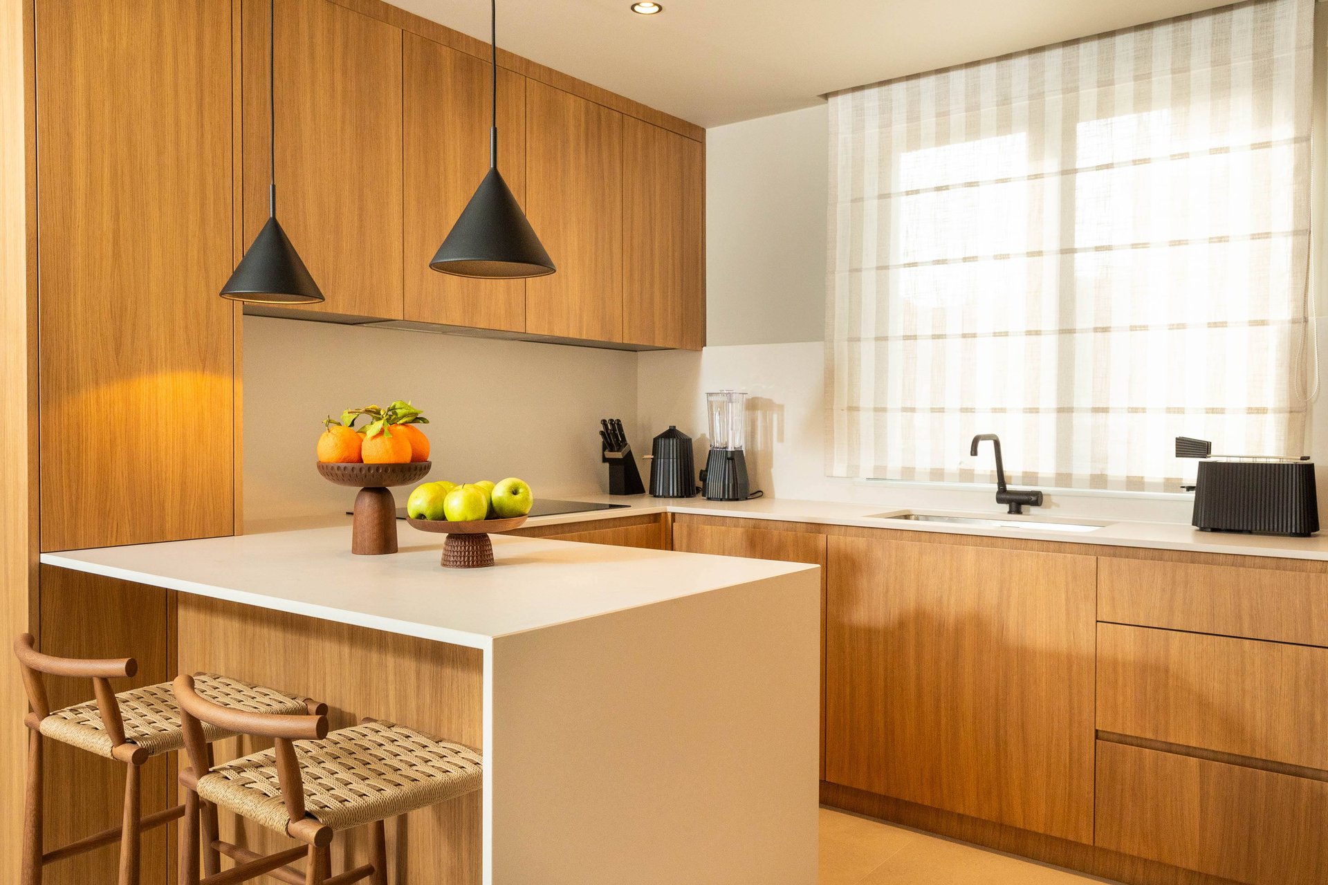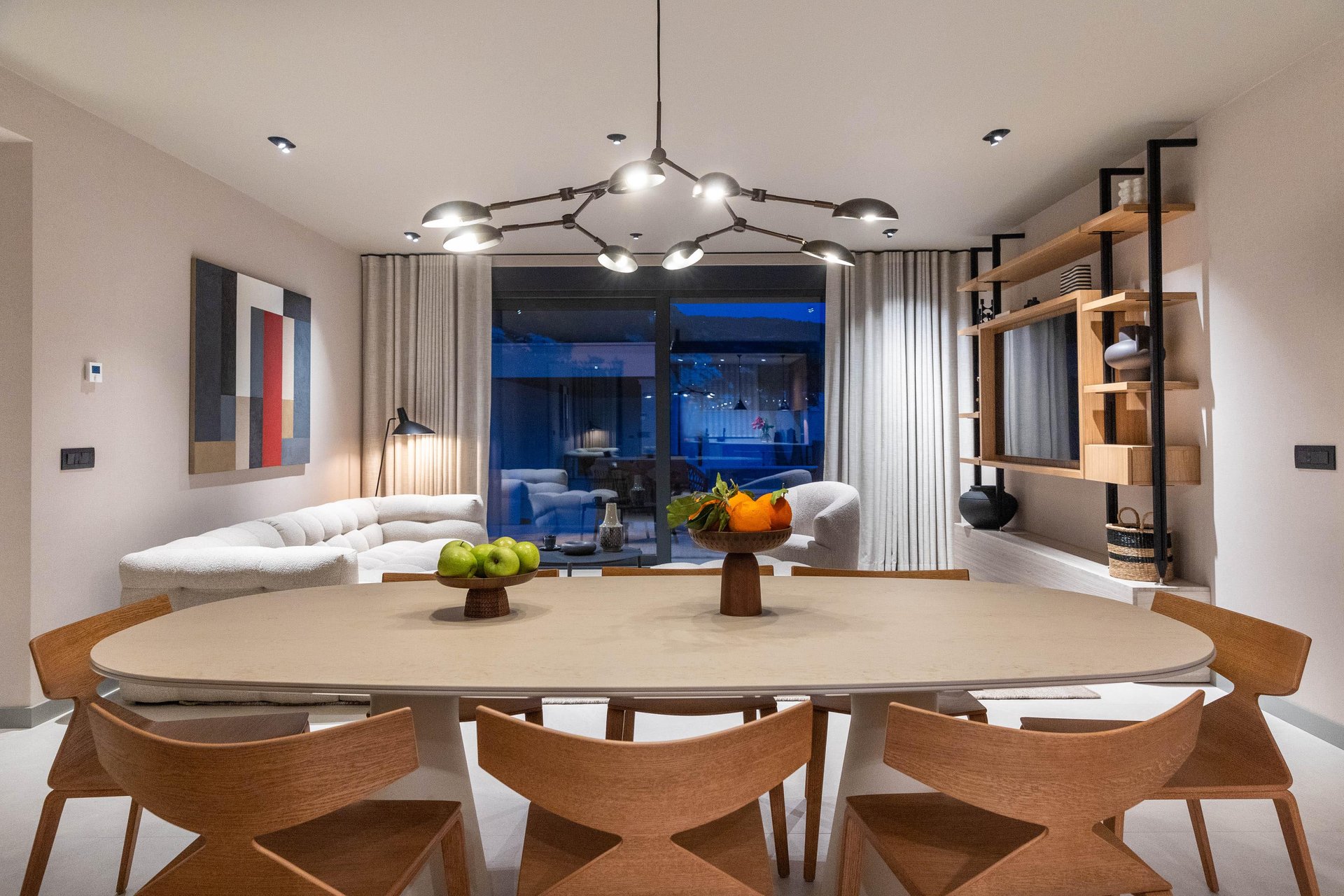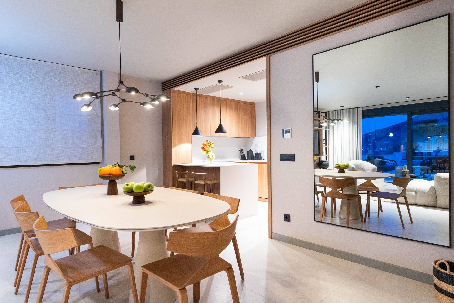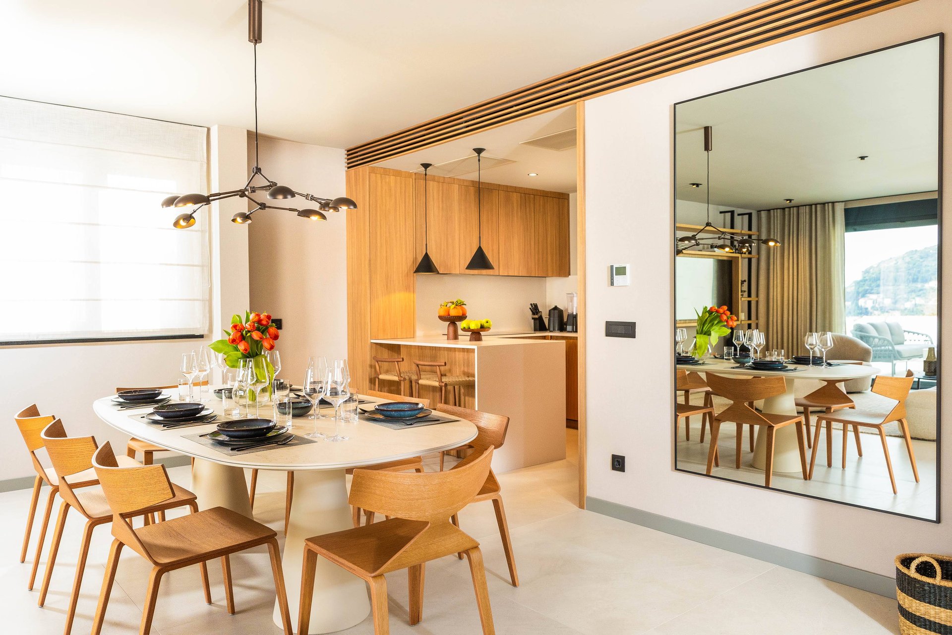 Inside, the villa continues to impress with its airy, light-filled design. Large glass walls allow natural sunlight to flood the interiors and ensure that the sea is never out of sight. The main living space is both sophisticated and inviting, offering the ideal place to unwind after a day of exploration. Decorated with a modern yet warm aesthetic, it reflects a perfect balance of elegance and functionality. The fully equipped kitchen is a culinary haven, complete with a refrigerator, freezer, oven, stove, dishwasher, coffee maker, smoothie blender, kitchen hood, and all the utensils needed for preparing gourmet meals or simple family dinners. A stylish dining table for eight guests adds to the villa's inviting atmosphere, whether you’re enjoying a leisurely breakfast or a candlelit dinner.