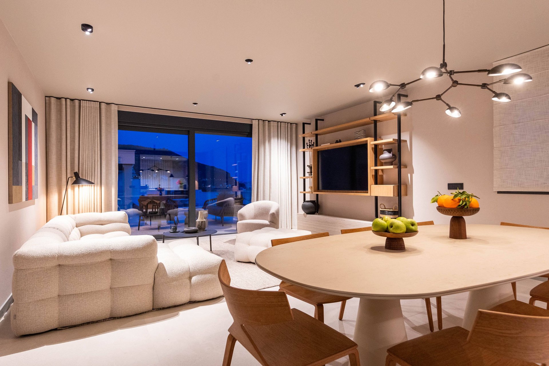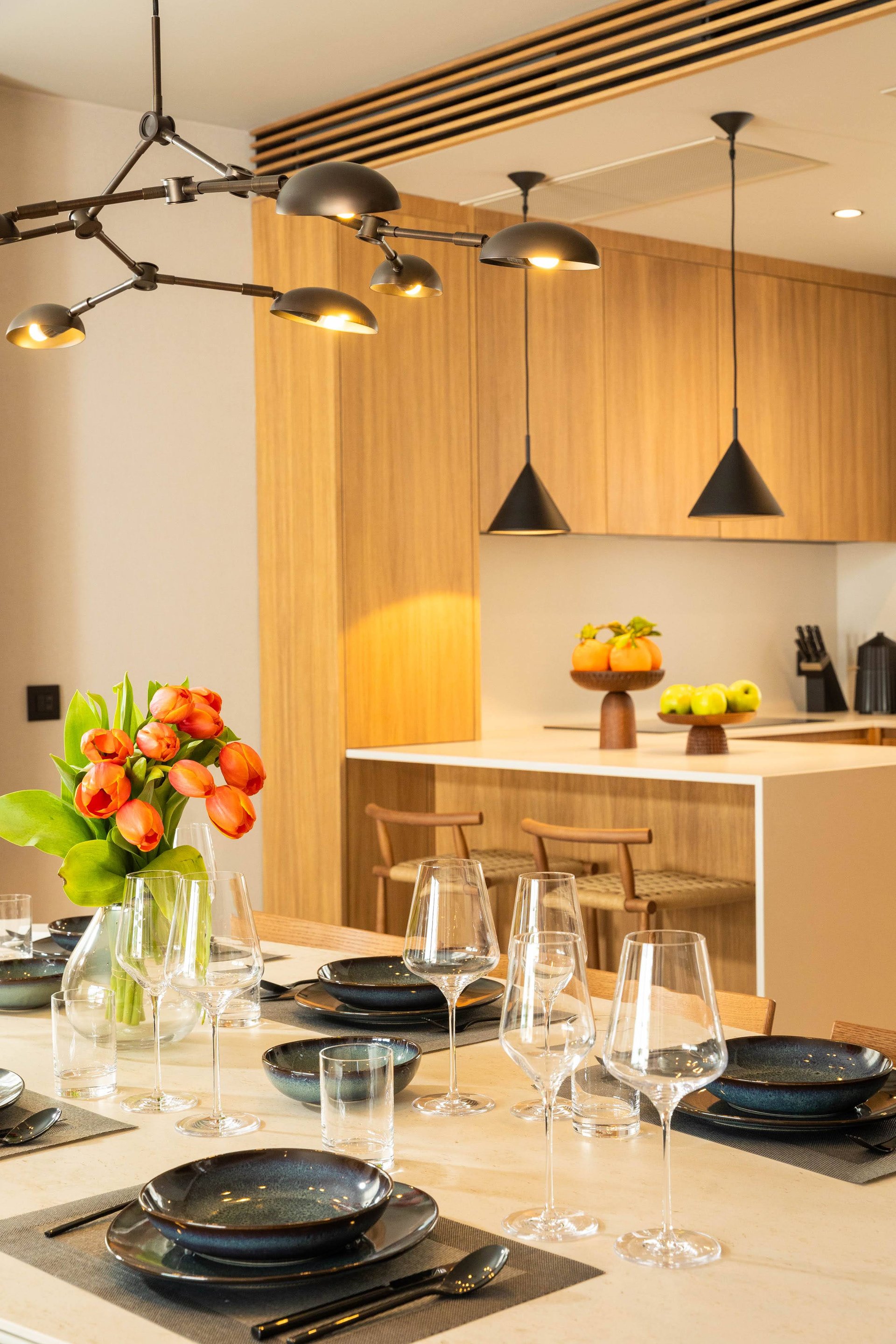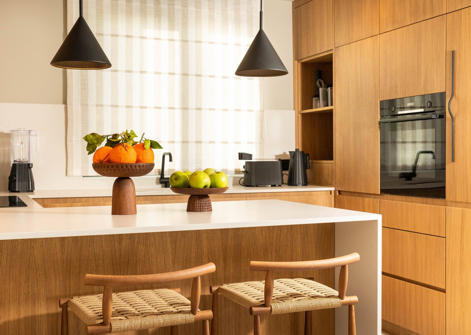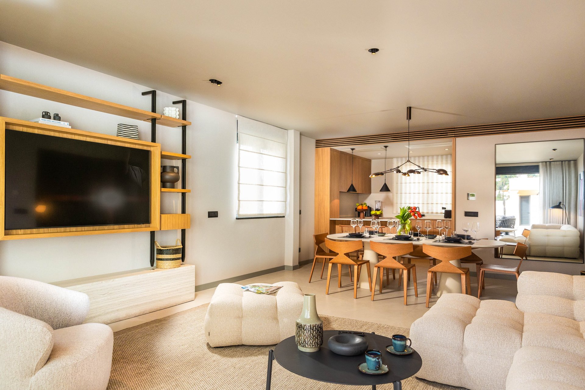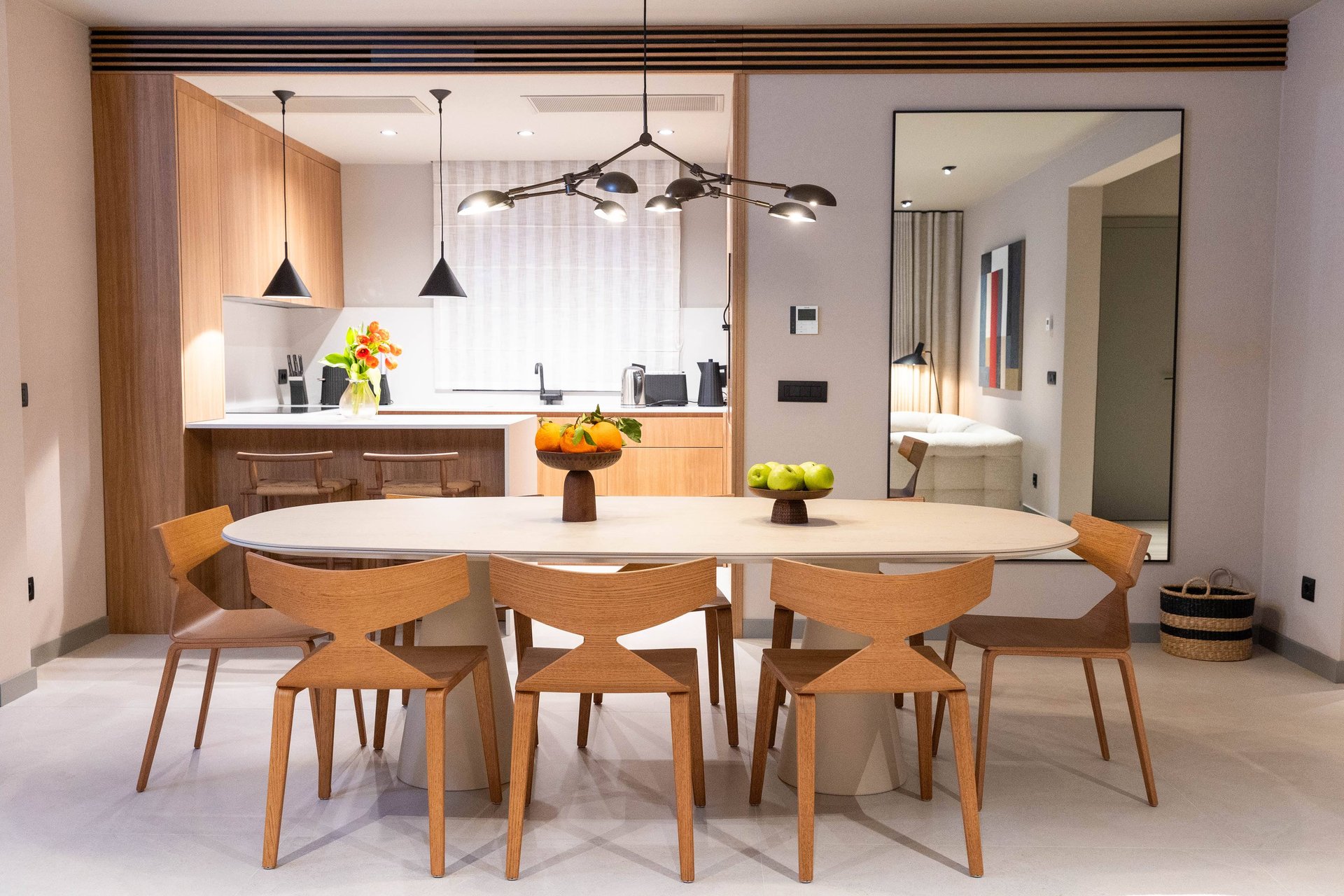 Inside, the villa continues to impress with its airy, light-filled design. Large glass walls allow natural sunlight to flood the interiors and ensure that the sea is never out of sight. The main living space is both sophisticated and inviting, offering the ideal place to unwind after a day of exploration. Decorated with a modern yet warm aesthetic, it reflects a perfect balance of elegance and functionality. The fully equipped kitchen is a culinary haven, complete with a refrigerator, freezer, oven, stove, dishwasher, coffee maker, smoothie blender, kitchen hood, and all the utensils needed for preparing gourmet meals or simple family dinners. A stylish dining table for eight guests adds to the villa's inviting atmosphere, whether you’re enjoying a leisurely breakfast or a candlelit dinner.