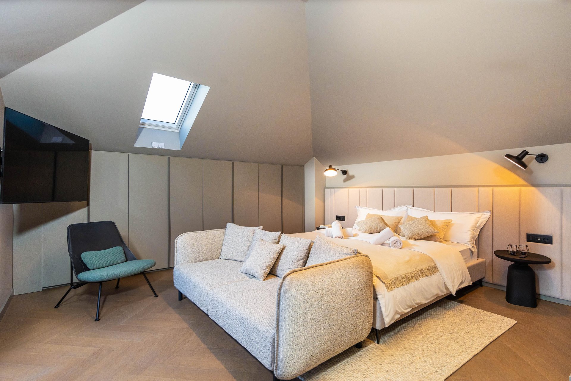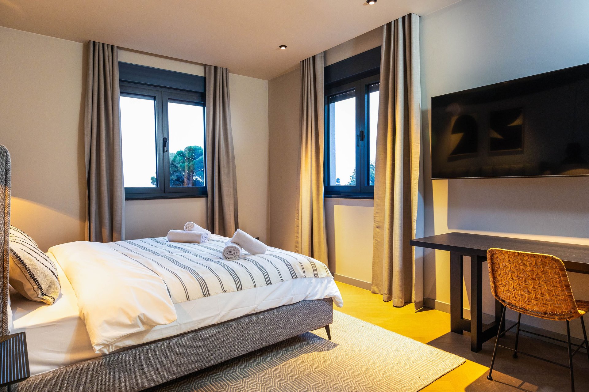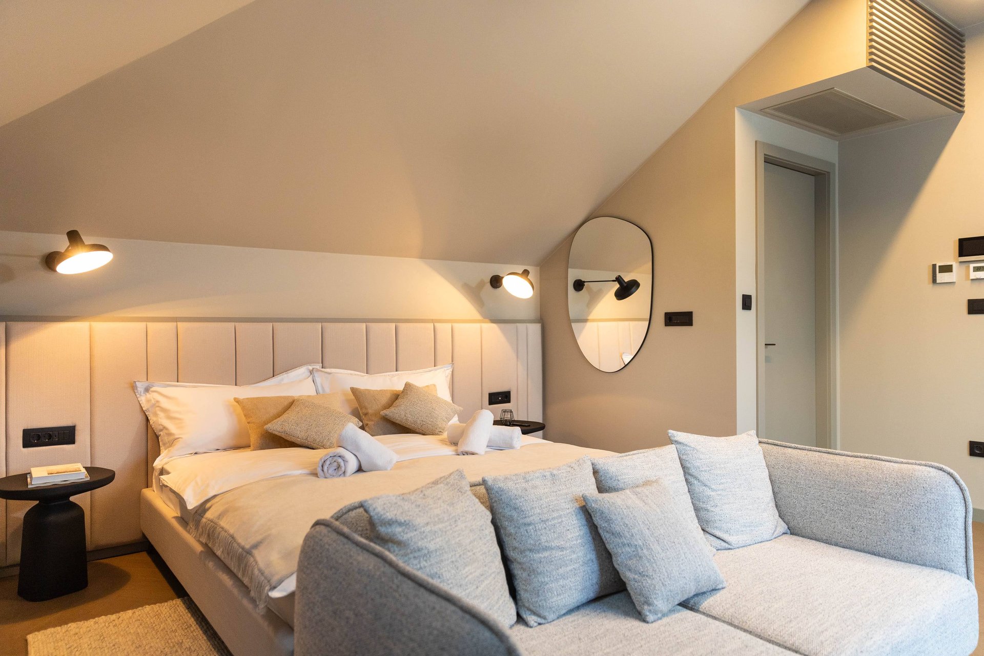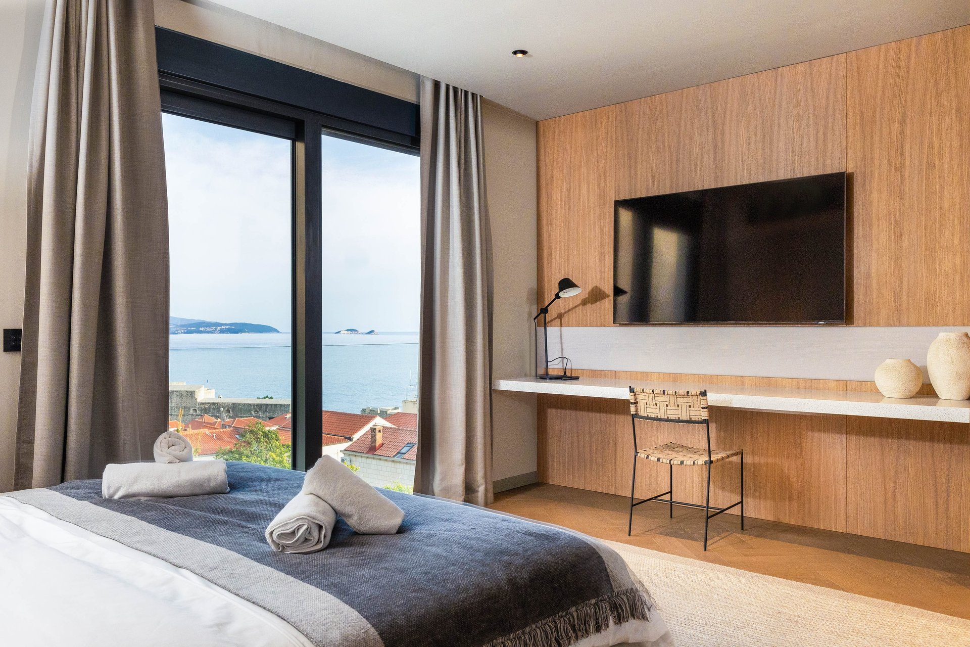 Spread across the ground floor and two upper levels, Villa Gradina offers a thoughtful layout that ensures privacy and comfort for all guests. It features three beautifully appointed bedrooms, each with a plush double bed, Smart TV, and its own ensuite bathroom. Two of the bedrooms are located on the first floor, while the master suite occupies the top floor, offering the most exclusive experience. This luxurious bedroom not only comes with its own private balcony that overlooks the sea, but also a private sauna, creating an intimate space for relaxation and rejuvenation. In addition to the ensuite bathrooms, the villa also includes two more bathrooms—one located in the living area on the ground floor, and another in the private gym area, which is located on a level below the main living space. The gym is fully equipped and ideal for those who want to maintain their fitness routine while traveling.