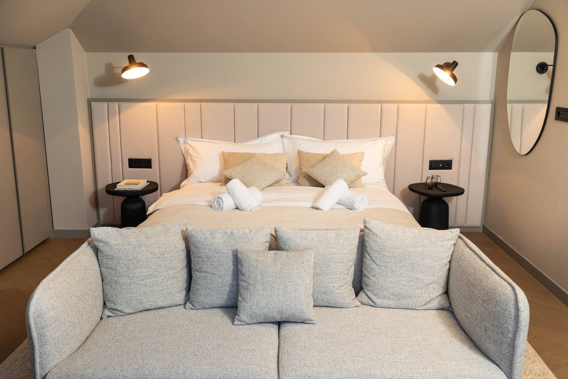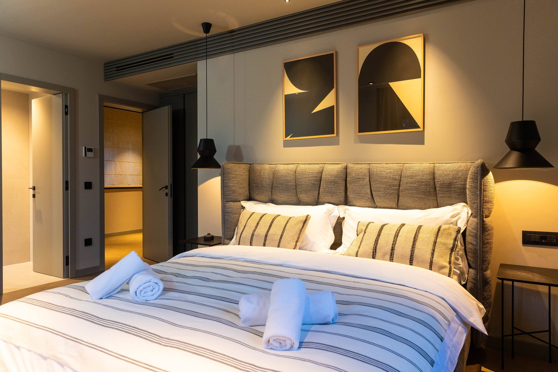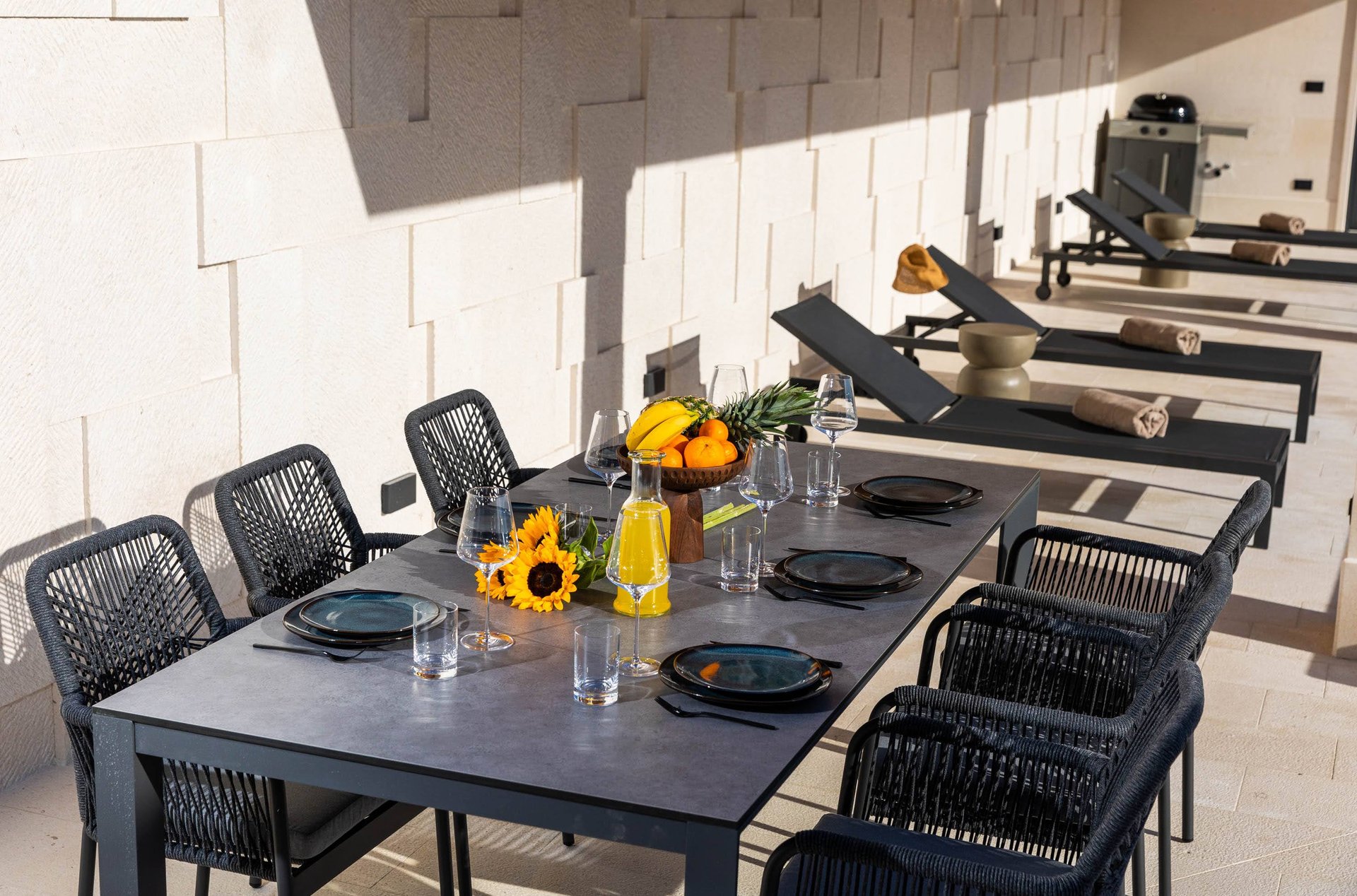 Spread across the ground floor and two upper levels, Villa Gradina offers a thoughtful layout that ensures privacy and comfort for all guests. It features three beautifully appointed bedrooms, each with a plush double bed, Smart TV, and its own ensuite bathroom. Two of the bedrooms are located on the first floor, while the master suite occupies the top floor, offering the most exclusive experience. This luxurious bedroom not only comes with its own private balcony that overlooks the sea, but also a private sauna, creating an intimate space for relaxation and rejuvenation. In addition to the ensuite bathrooms, the villa also includes two more bathrooms—one located in the living area on the ground floor, and another in the private gym area, which is located on a level below the main living space. The gym is fully equipped and ideal for those who want to maintain their fitness routine while traveling.