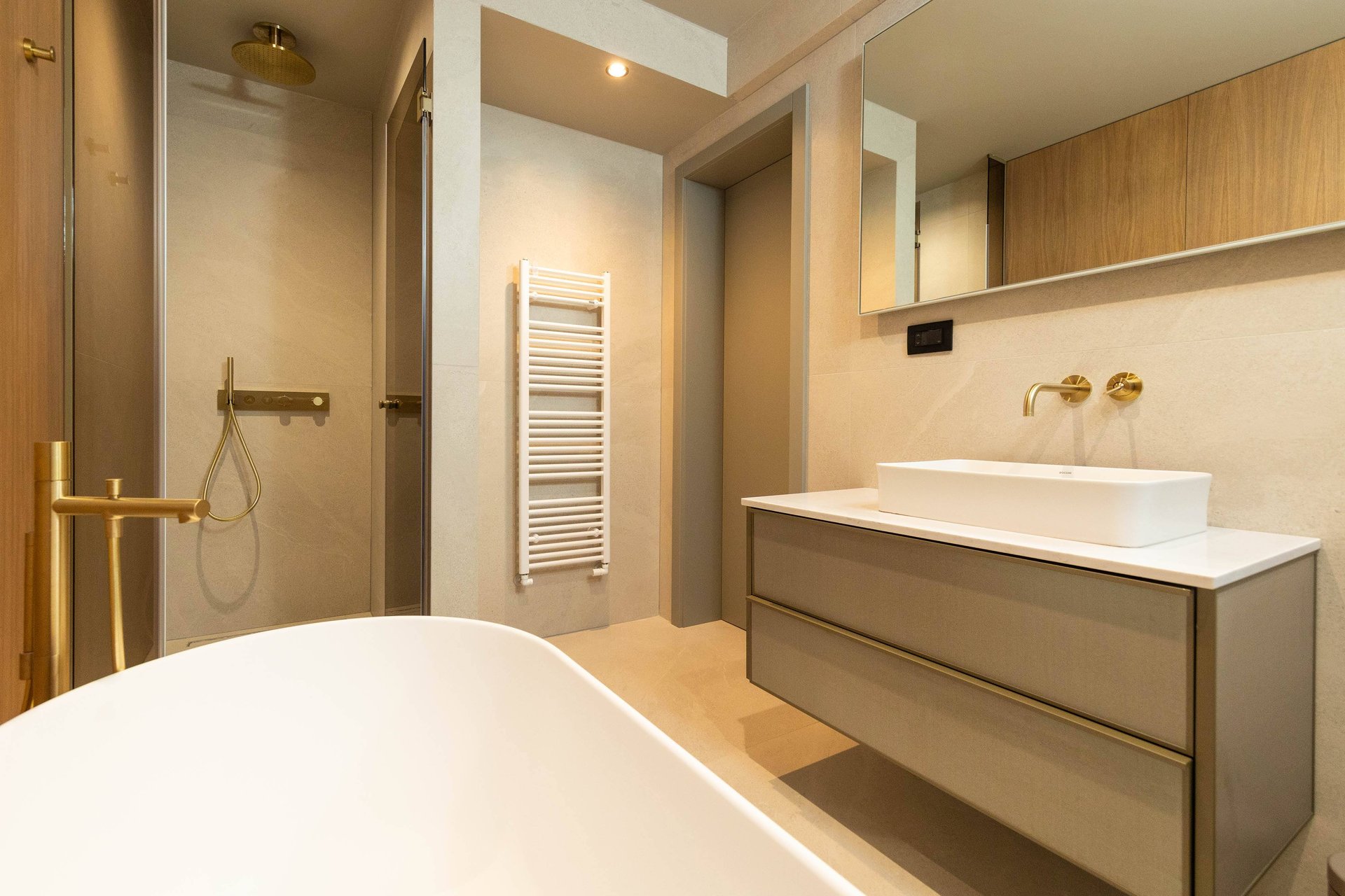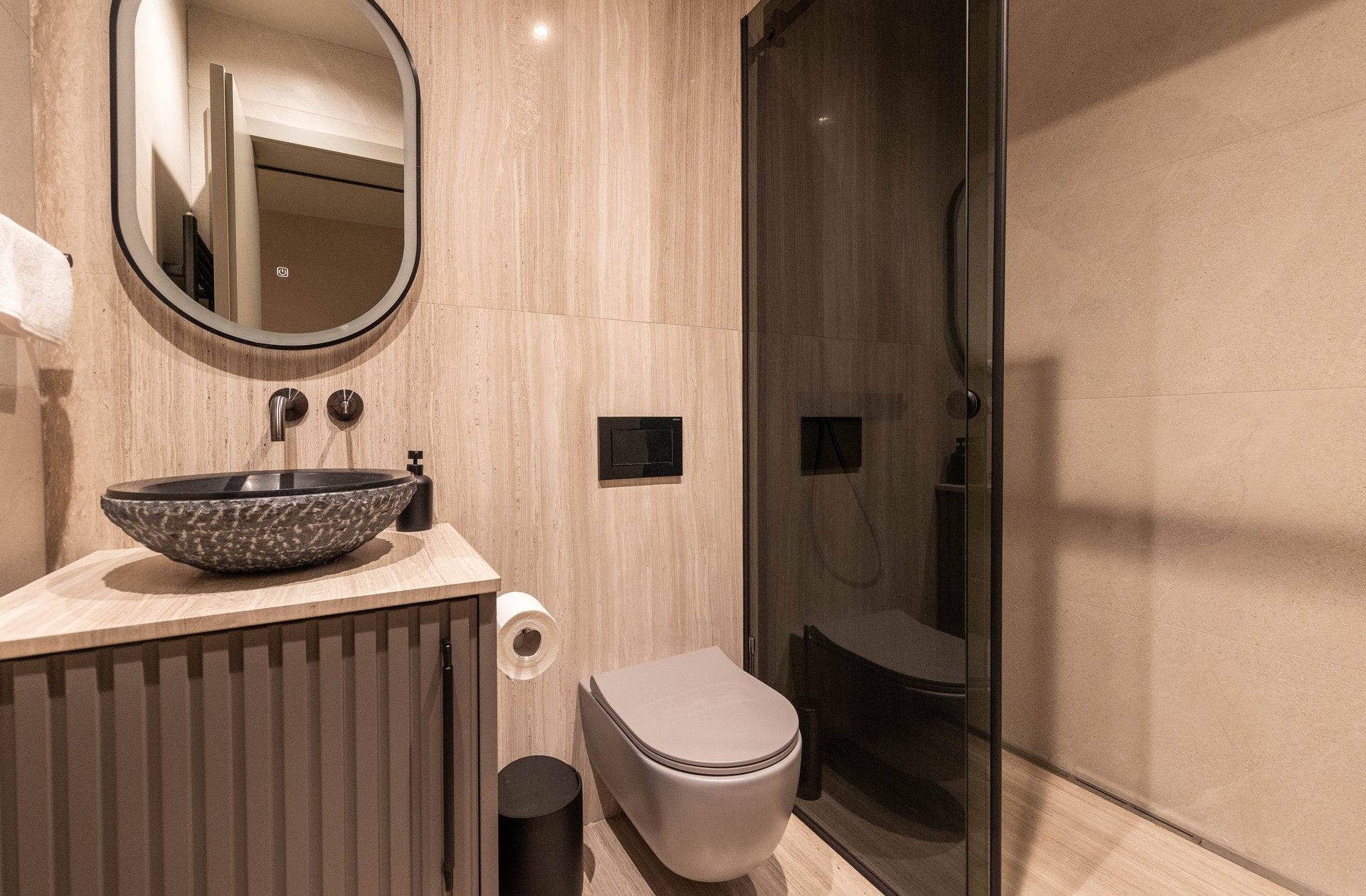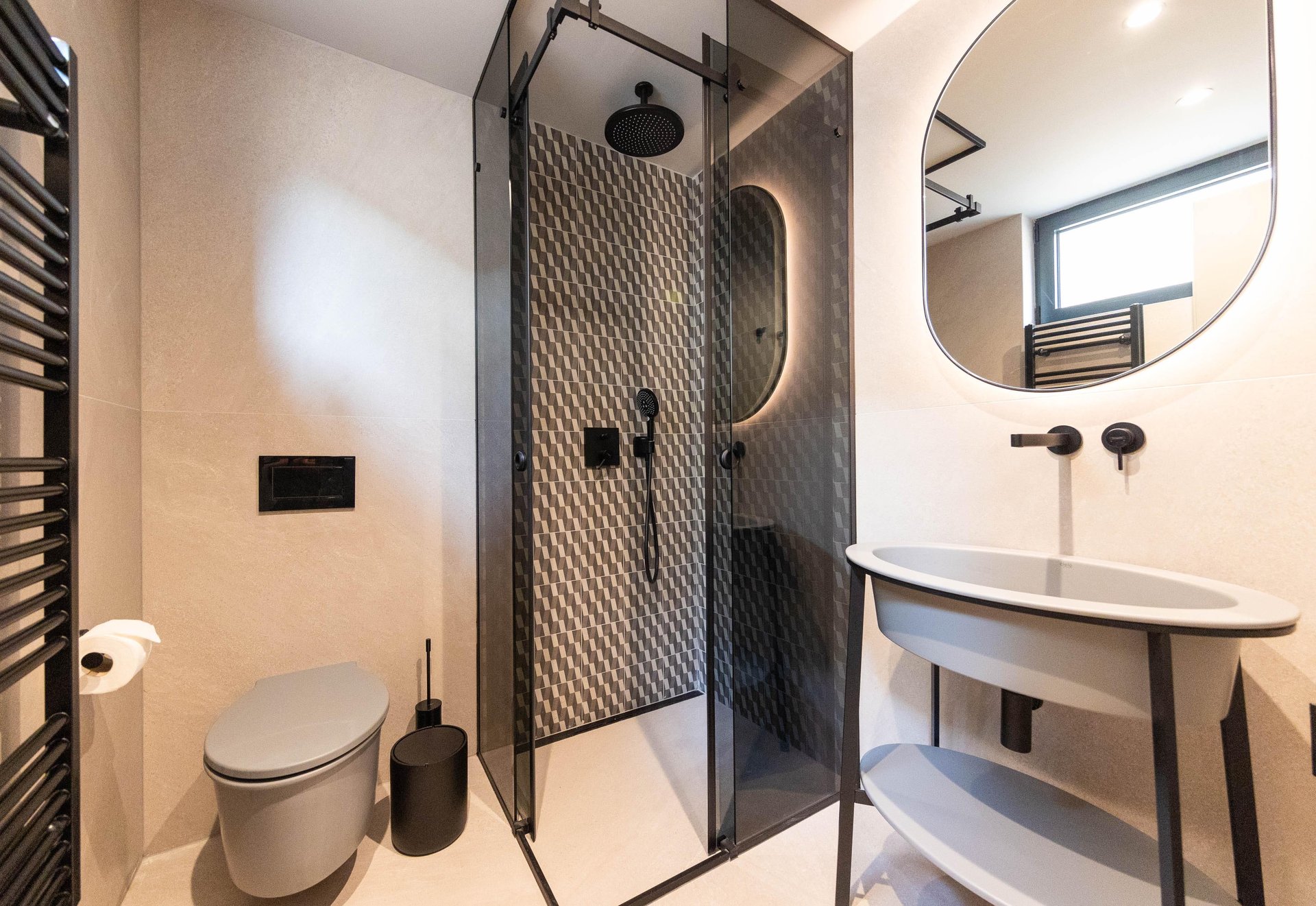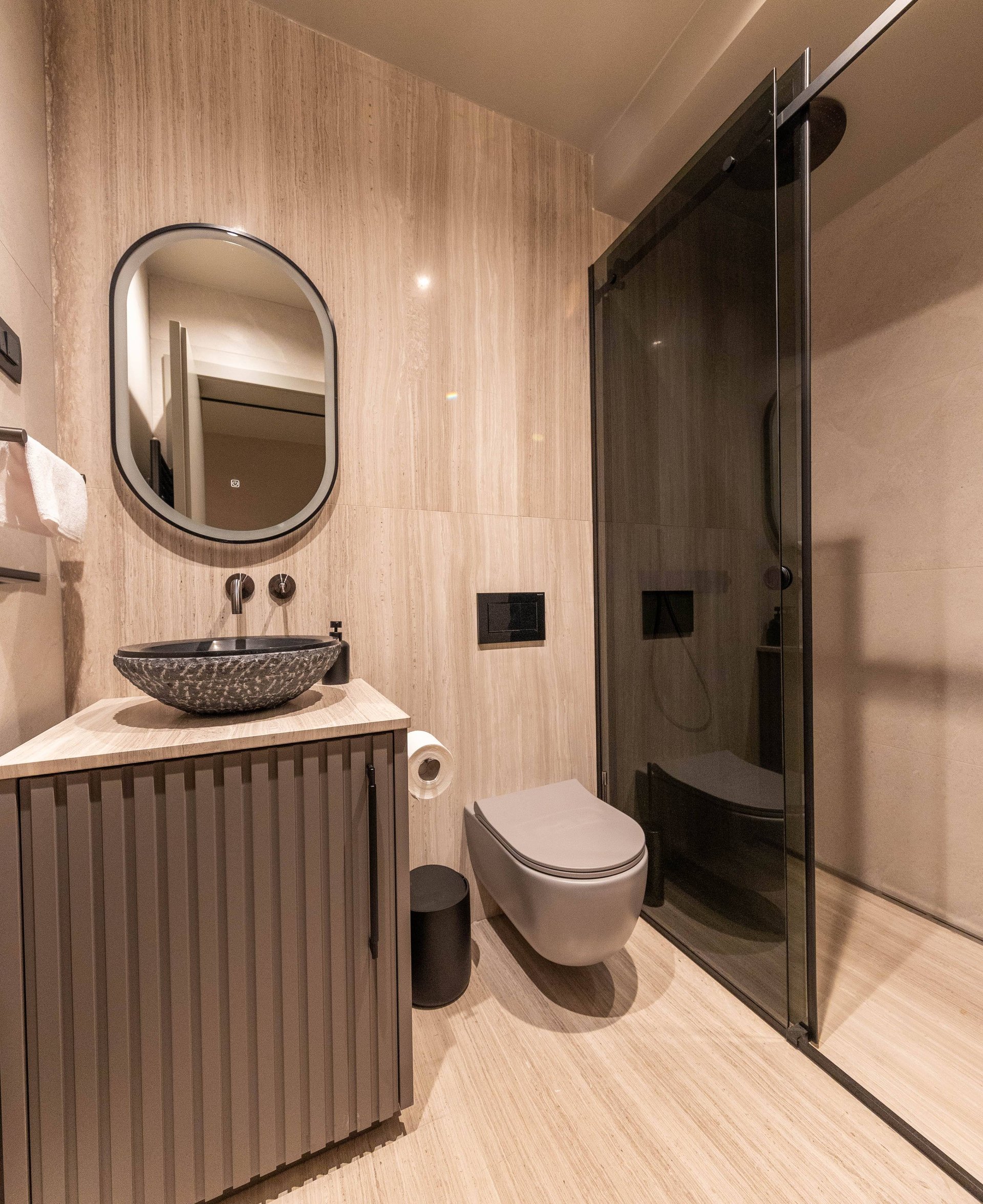 Spread across the ground floor and two upper levels, Villa Gradina offers a thoughtful layout that ensures privacy and comfort for all guests. It features three beautifully appointed bedrooms, each with a plush double bed, Smart TV, and its own ensuite bathroom. Two of the bedrooms are located on the first floor, while the master suite occupies the top floor, offering the most exclusive experience. This luxurious bedroom not only comes with its own private balcony that overlooks the sea, but also a private sauna, creating an intimate space for relaxation and rejuvenation. In addition to the ensuite bathrooms, the villa also includes two more bathrooms—one located in the living area on the ground floor, and another in the private gym area, which is located on a level below the main living space. The gym is fully equipped and ideal for those who want to maintain their fitness routine while traveling.