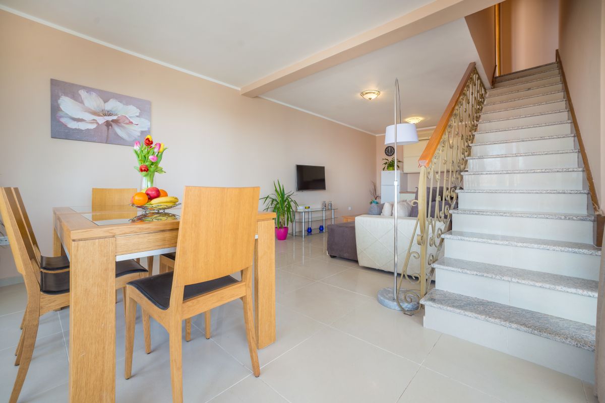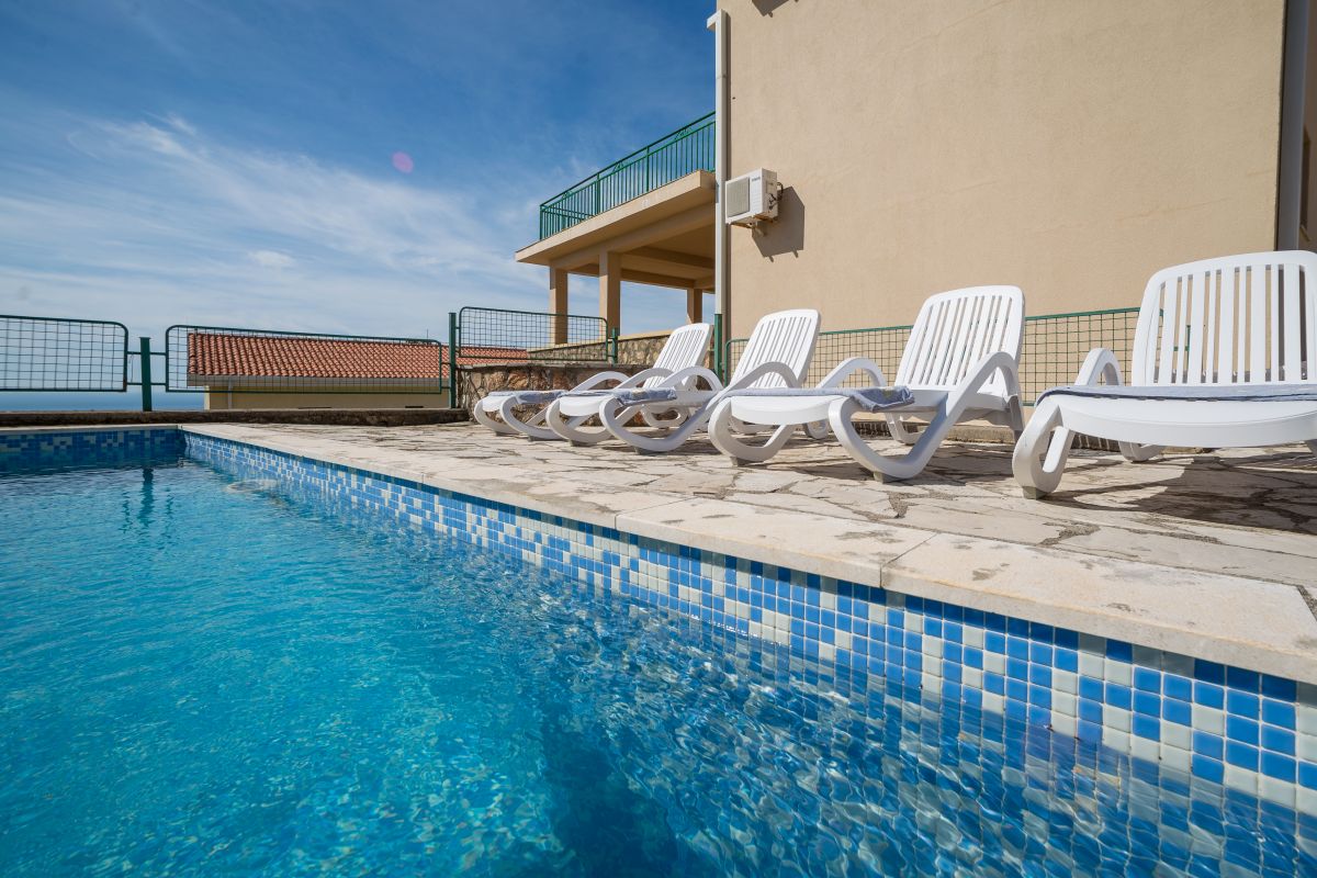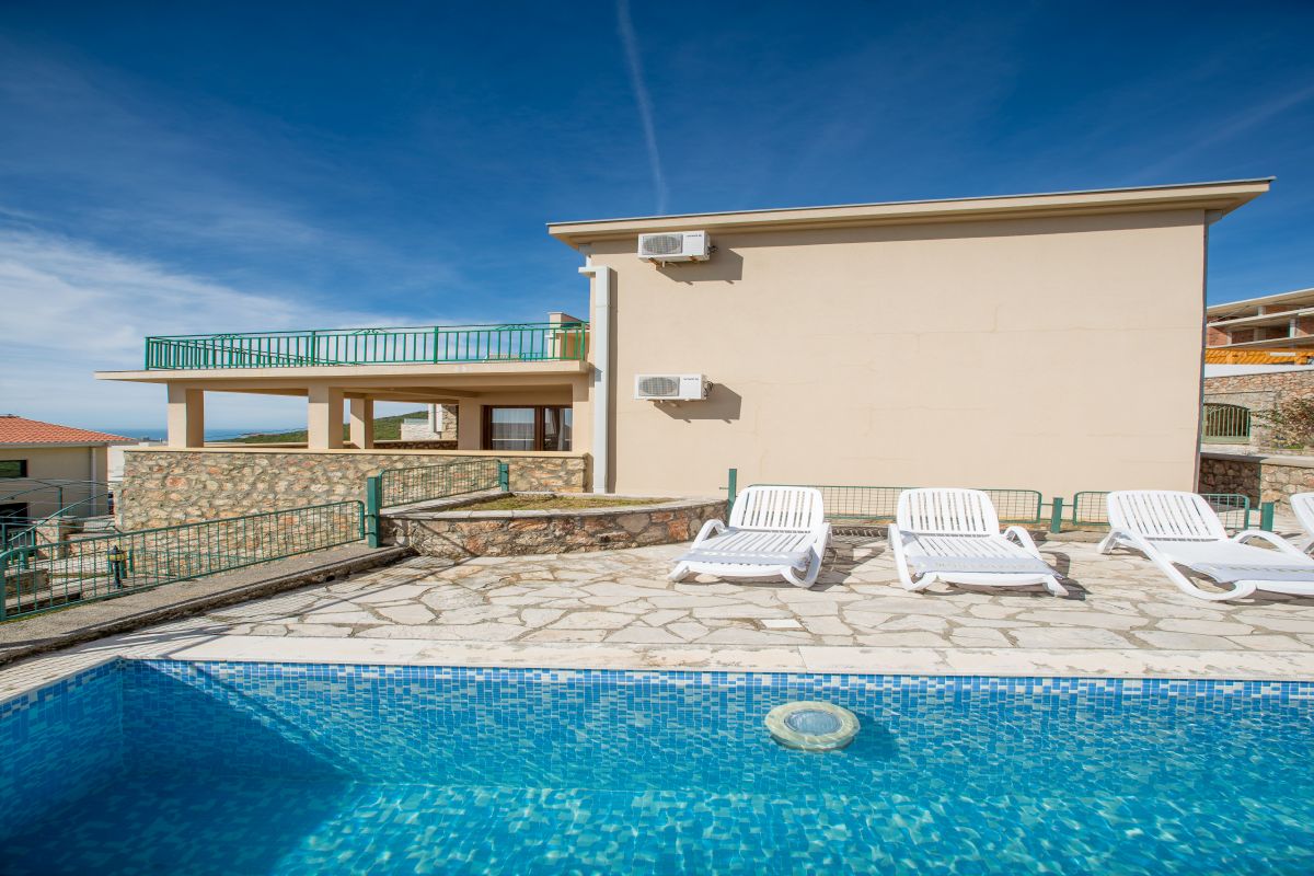 Ground level of property consists of two garages for 2 cars and parking also for 2 cars. Outside stairs leads on the first level of properties which consists of open plan living area with kitchen and dining area, one bedroom with double bed same for the both part of the villa which is in total 2 bedrooms and two bathrooms with a baths. Outside area consists of the yard with BBQ and pool area which enjoys lovely view over the sea.