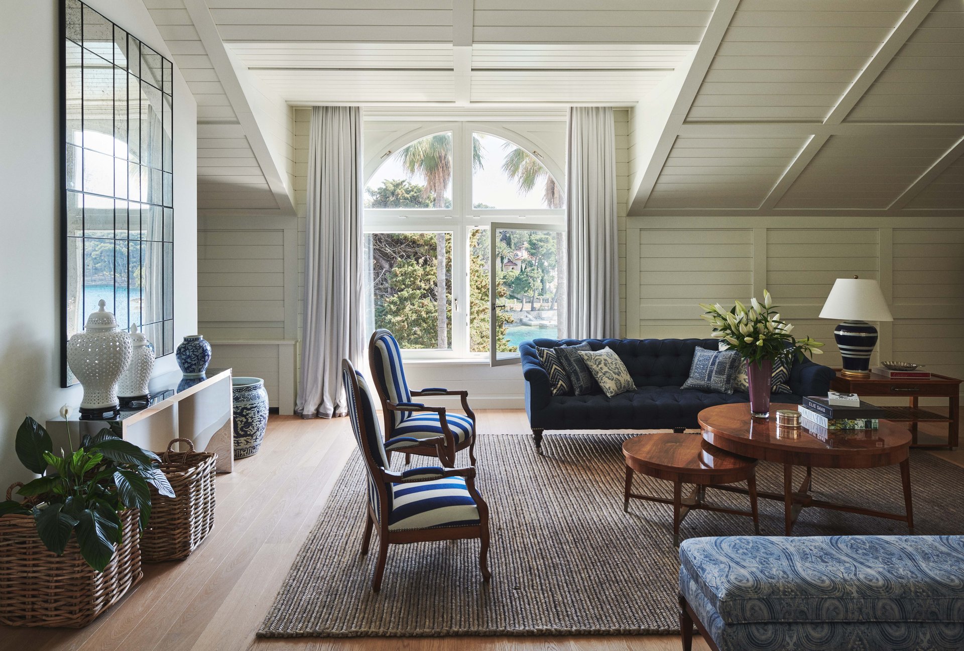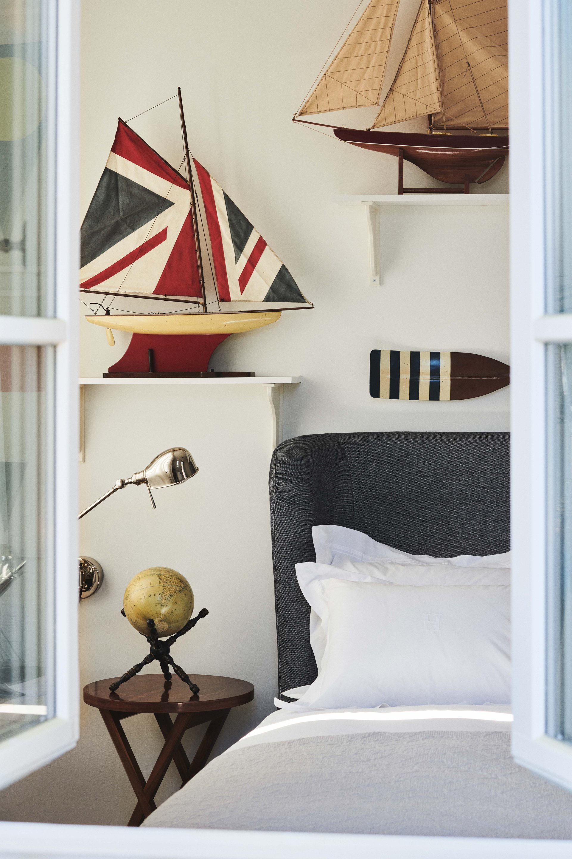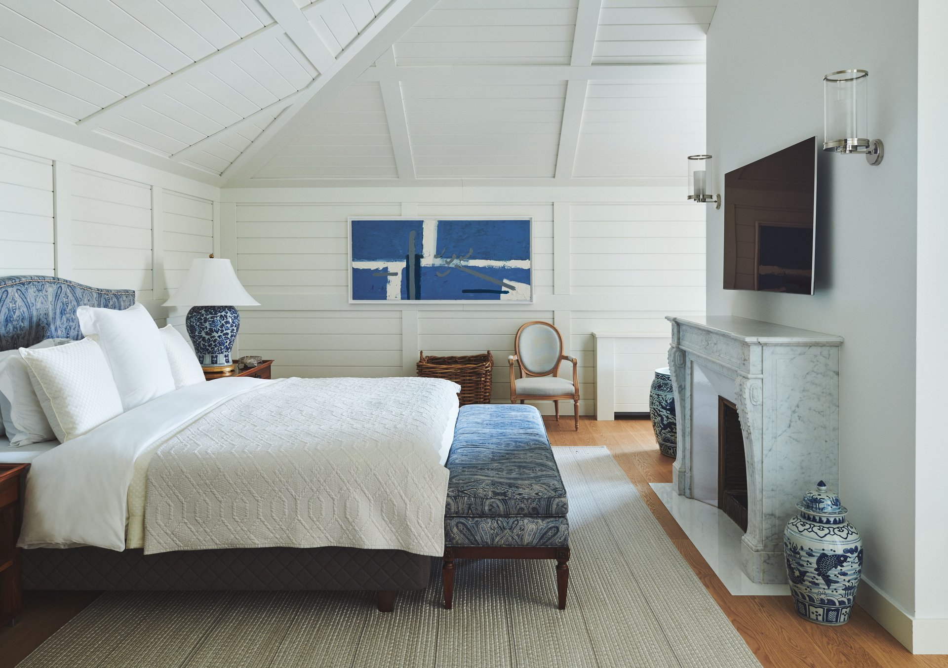 One of the most enchanting features of the villa is the attic-situated Master Bedroom. With its vaulted, beamed ceiling and crisp white wooden panelling, it evokes the cozy, nostalgic atmosphere of a vintage sailboat cabin. Here, you can enjoy both privacy and peace, making it a perfect retreat within this lavish home. The master suite is an oasis of comfort, with an inviting lounge area, a double bed, a fireplace, and a large dressing room, ensuring guests experience the height of relaxation. The luxurious en-suite bathroom includes a freestanding bathtub, offering a place to unwind while taking in the views of the sea and surrounding landscape.