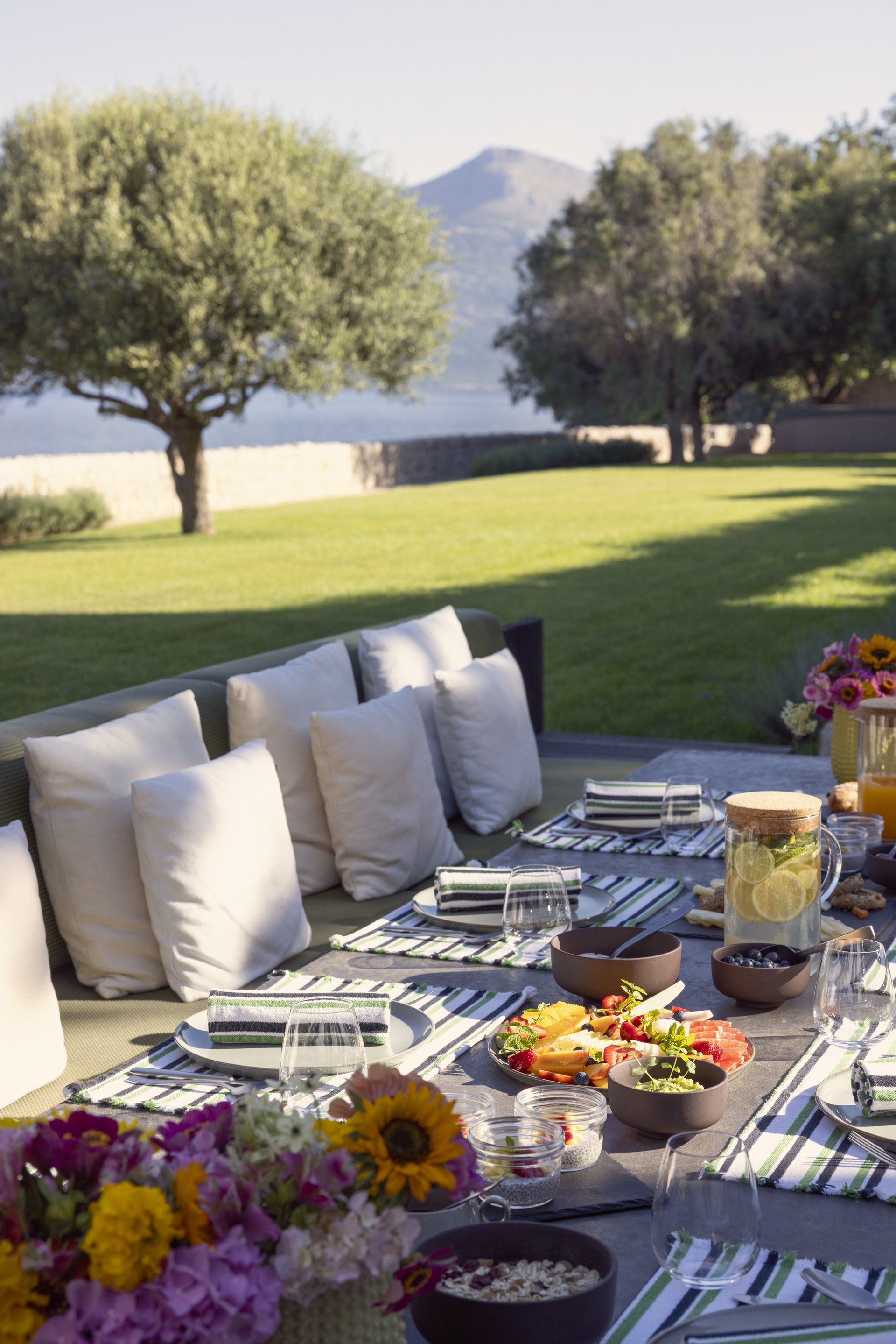 Outdoors, the villa boasts beautifully landscaped gardens, a large infinity pool with panoramic views, and several outdoor seating areas where guests can relax and enjoy the sun. The gardens are meticulously maintained, with olive trees, fragrant flowers, and Mediterranean plants, creating a peaceful and private atmosphere. There are also several alfresco dining areas, perfect for enjoying the local cuisine, while the views of the island’s coastline and crystal-clear waters provide a stunning backdrop.