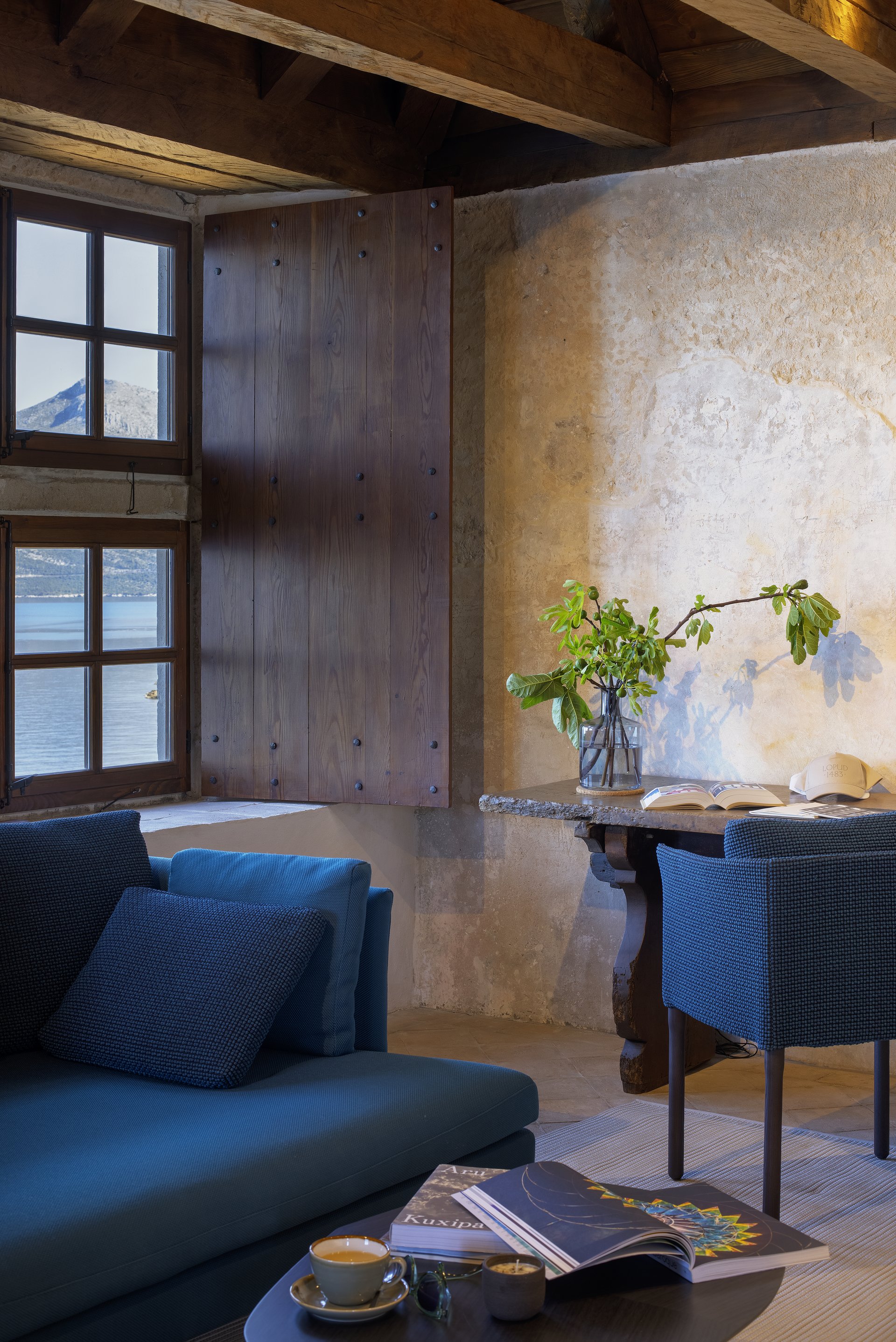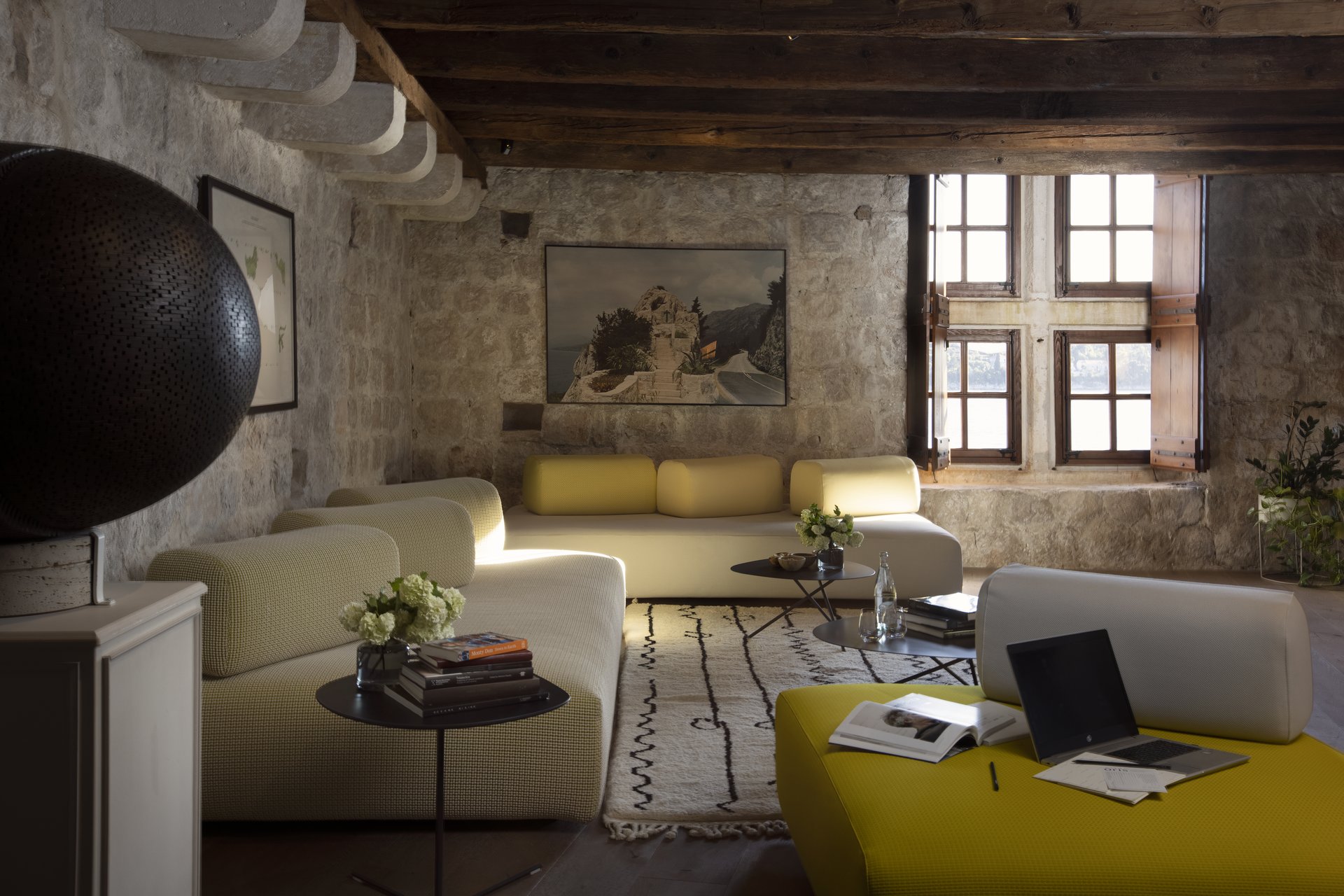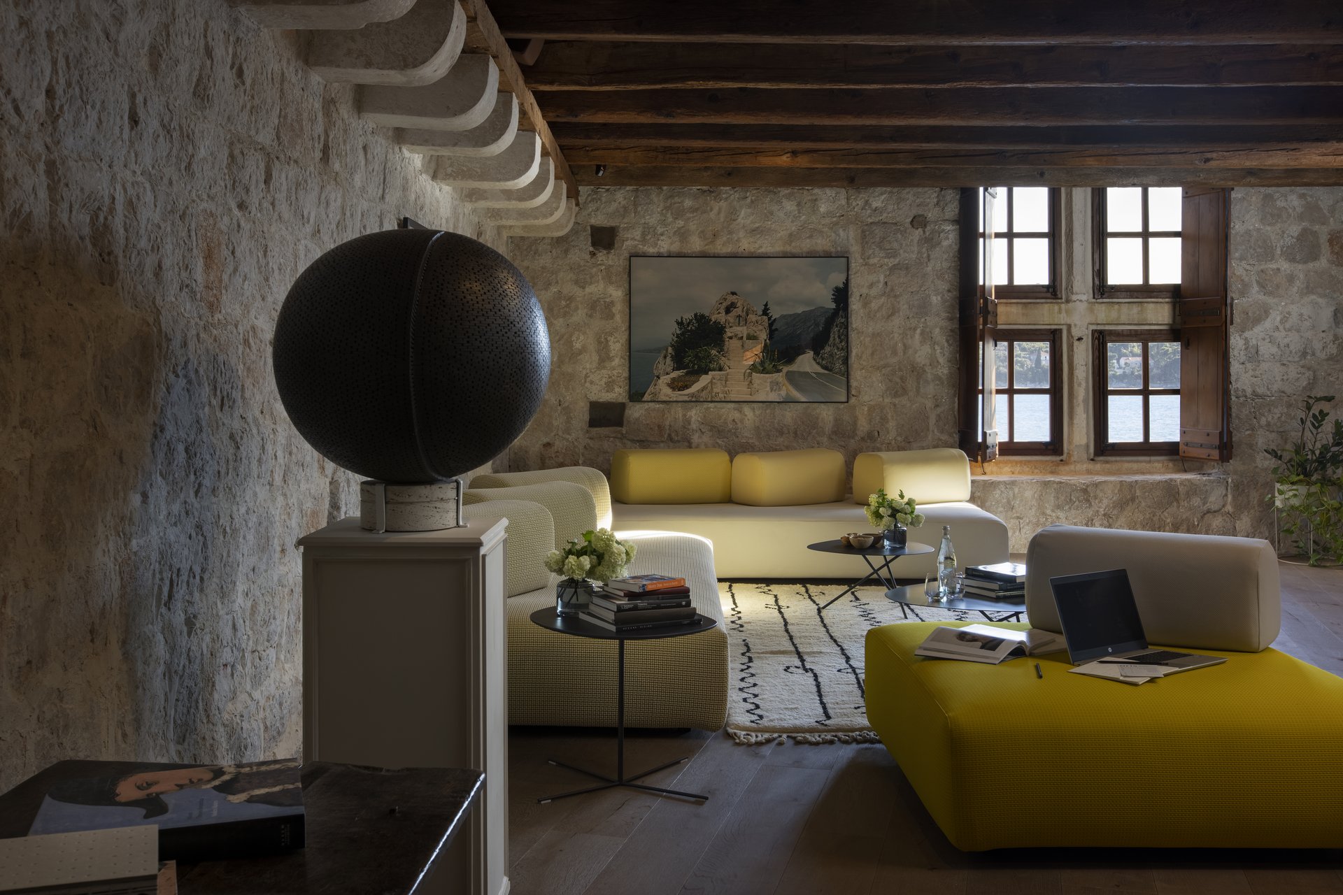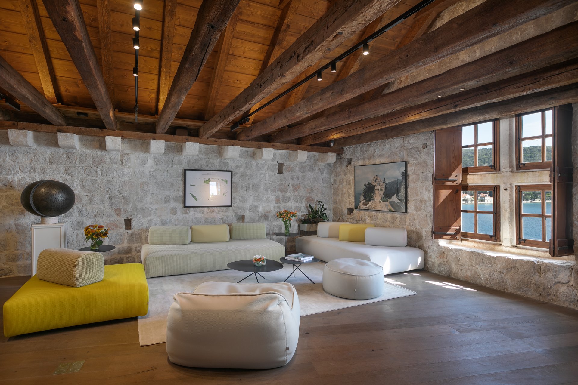 The layout of Villa Lopud 1483 spans over 2,000 square meters, featuring expansive living areas spread across multiple levels and wings. Each room is designed to provide maximum comfort and privacy, with spacious bedrooms, high ceilings, and large windows offering stunning views of the Adriatic Sea or the surrounding lush gardens. The interiors combine natural materials like wood, stone, and glass, creating a sense of calm and openness, while also celebrating the building's historic roots. The large stone fireplaces, elegant furniture, and curated contemporary art pieces contribute to the villa’s luxurious yet welcoming atmosphere.