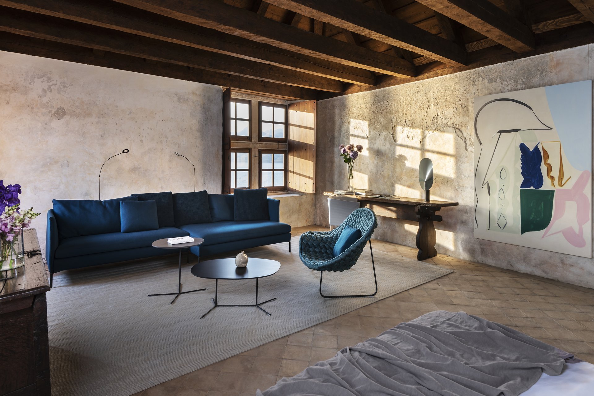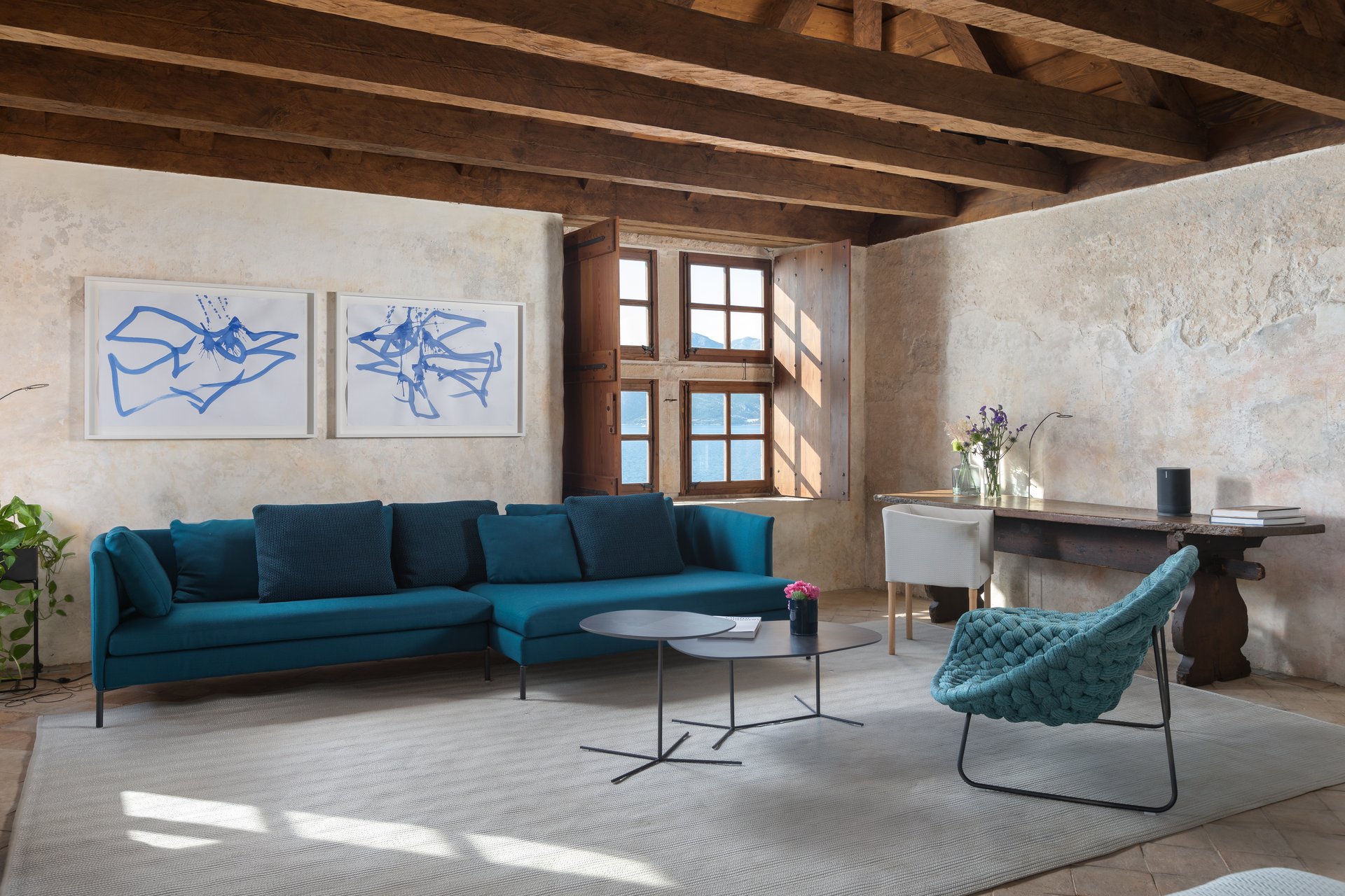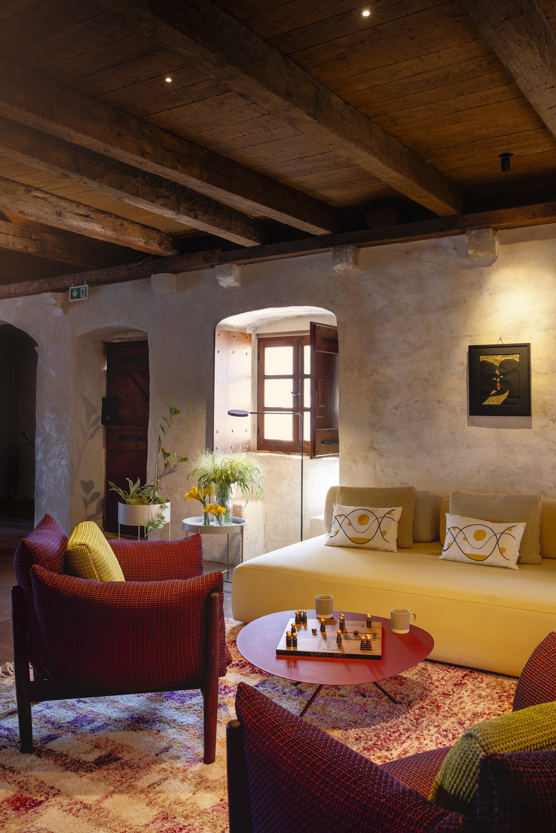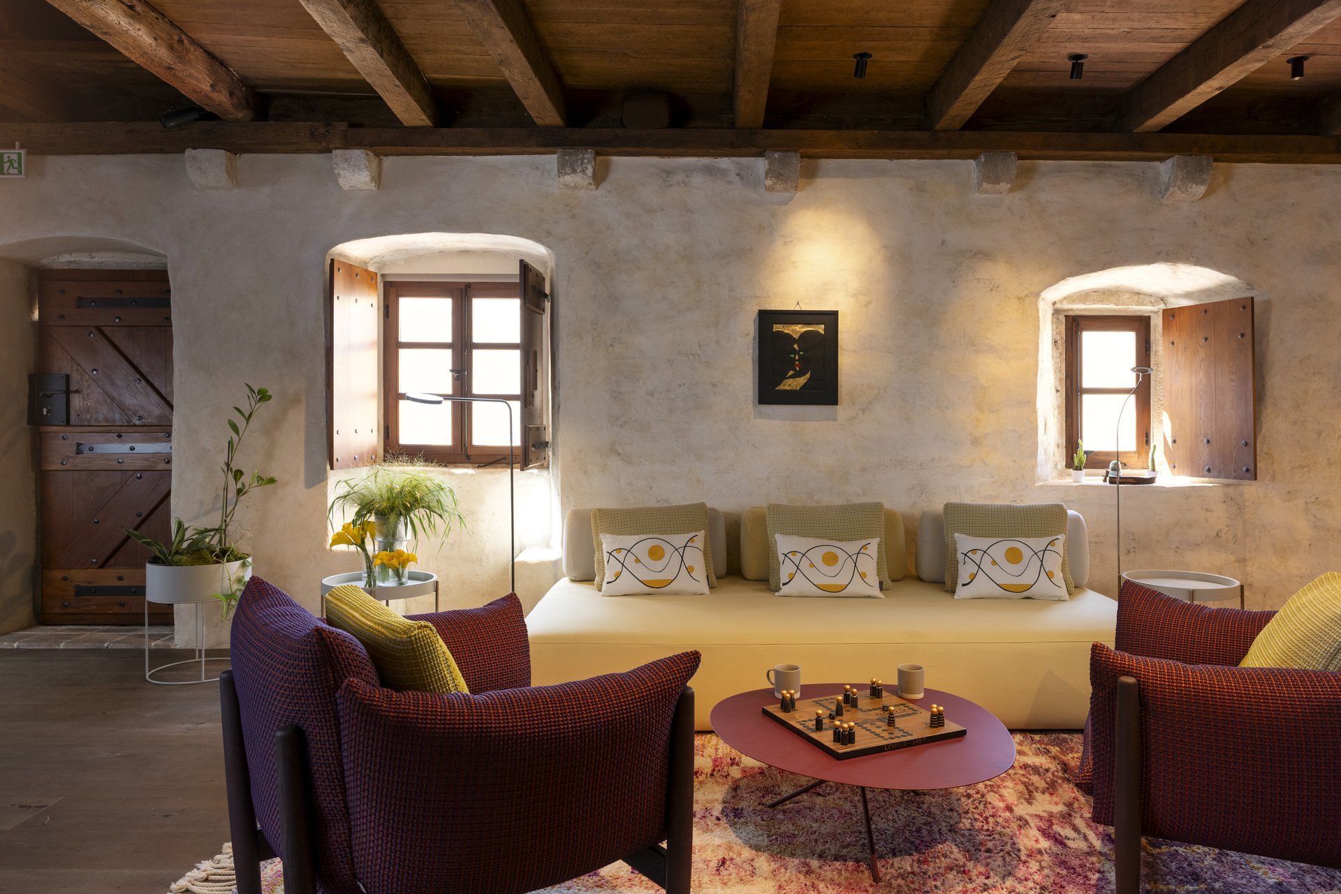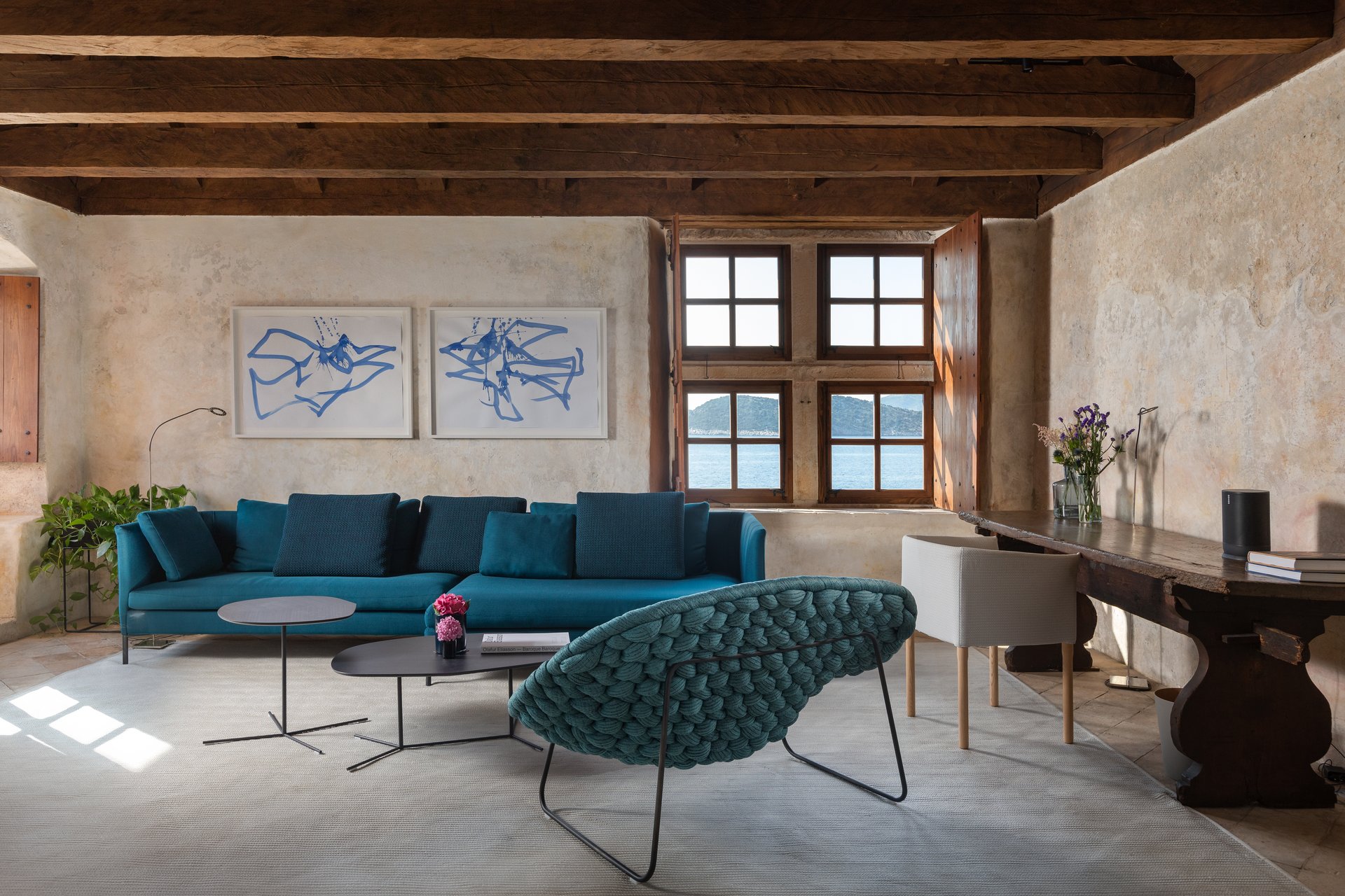 The layout of Villa Lopud 1483 spans over 2,000 square meters, featuring expansive living areas spread across multiple levels and wings. Each room is designed to provide maximum comfort and privacy, with spacious bedrooms, high ceilings, and large windows offering stunning views of the Adriatic Sea or the surrounding lush gardens. The interiors combine natural materials like wood, stone, and glass, creating a sense of calm and openness, while also celebrating the building's historic roots. The large stone fireplaces, elegant furniture, and curated contemporary art pieces contribute to the villa’s luxurious yet welcoming atmosphere.