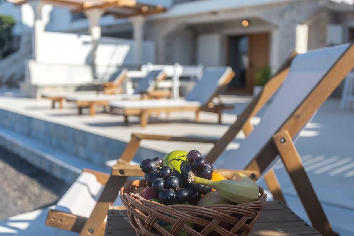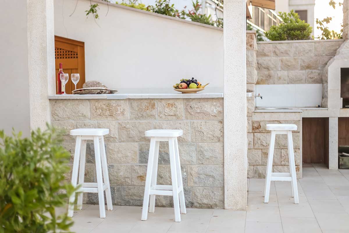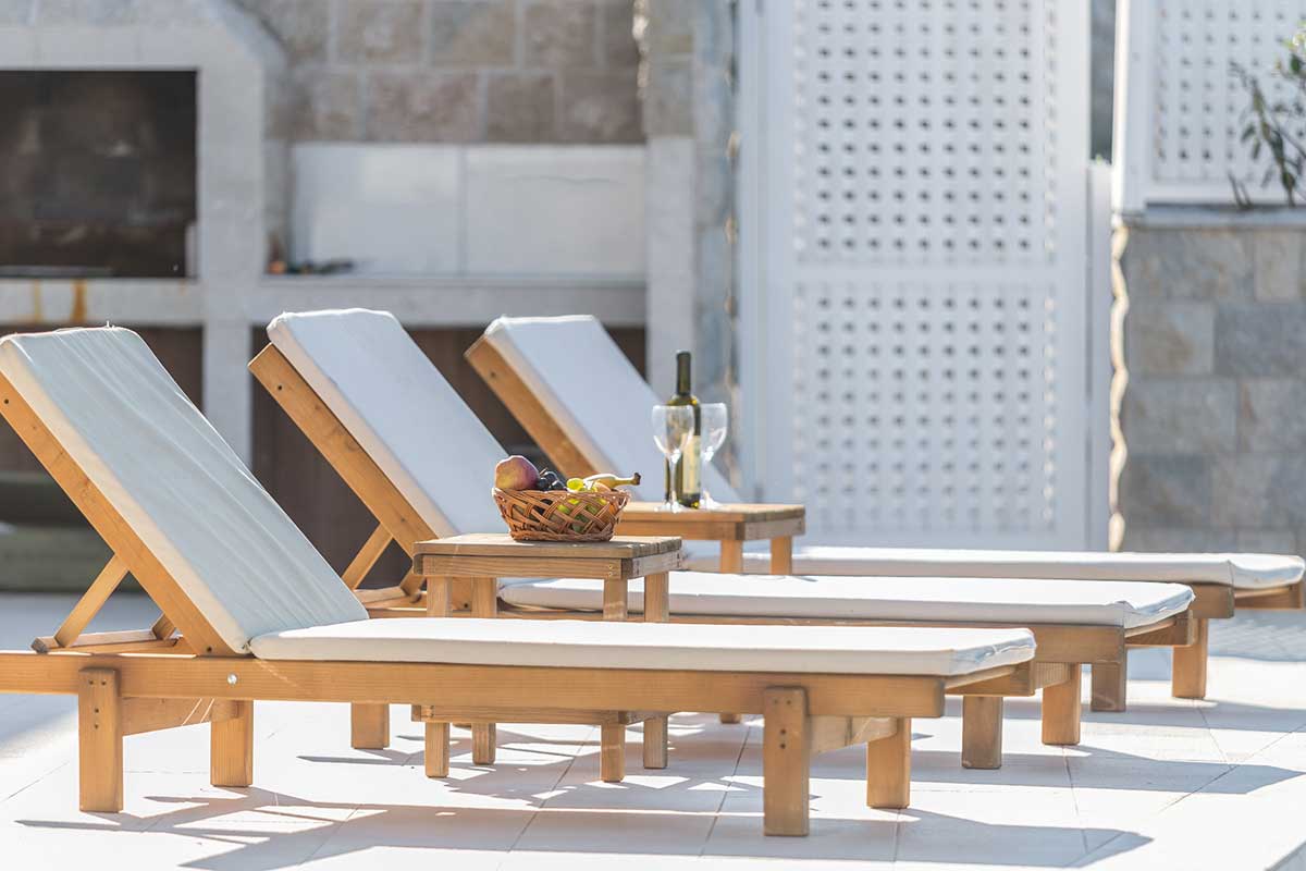The lounge atmosphere of the seafront simply lures one outside. The front terrace and pier comprise 90 square meters, arranged to host memorably good times. Open barbecue, terrace bar, canopied lounge, dining table for 12 persons, and beach chairs everywhere.
