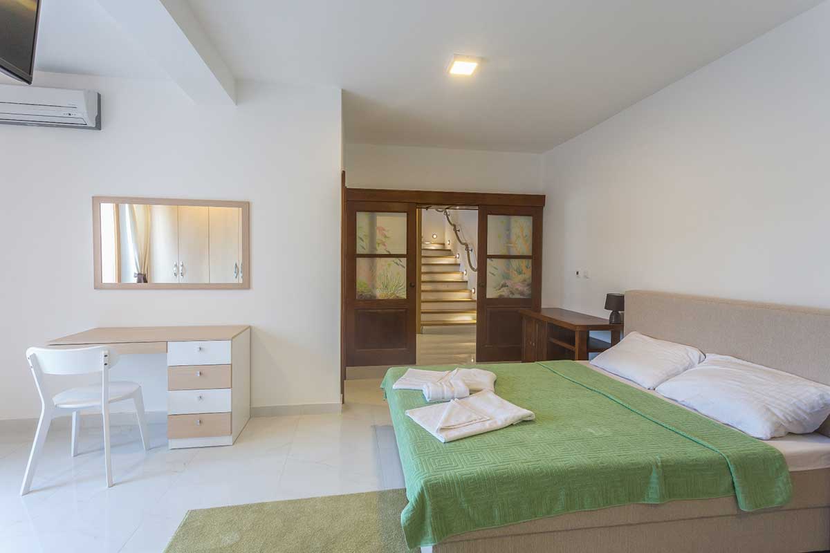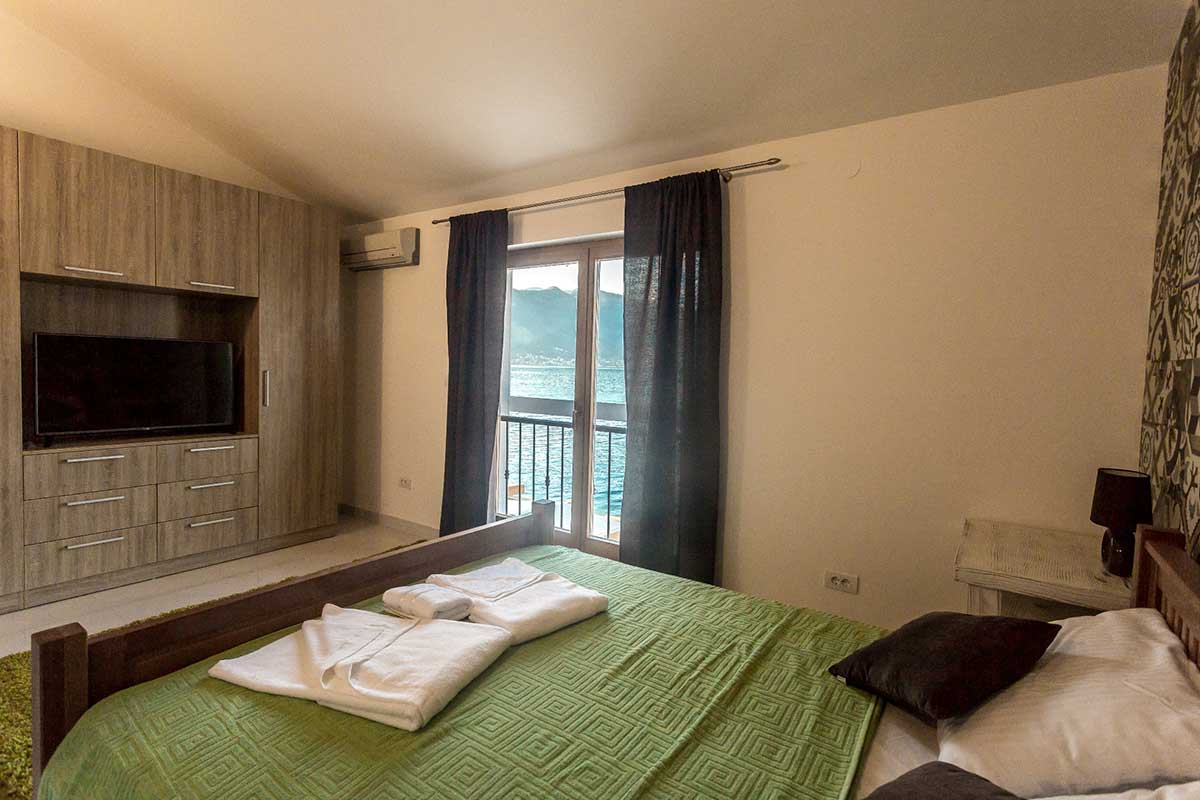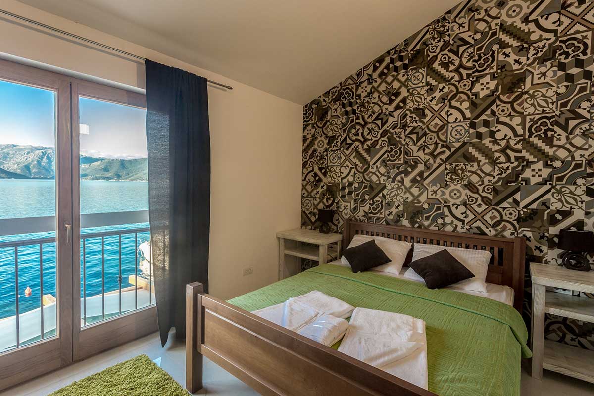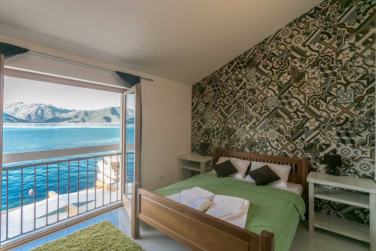 Up the staircase from the first floor, the Master bedroom comprises a double bed king size set against a mosaic-styled back wall, adding that tad bit of unique and unusual to the space. Large glass doors instead of windows fill this room with both natural light and beautiful imagery of the Sea and the Montenegrin coast.