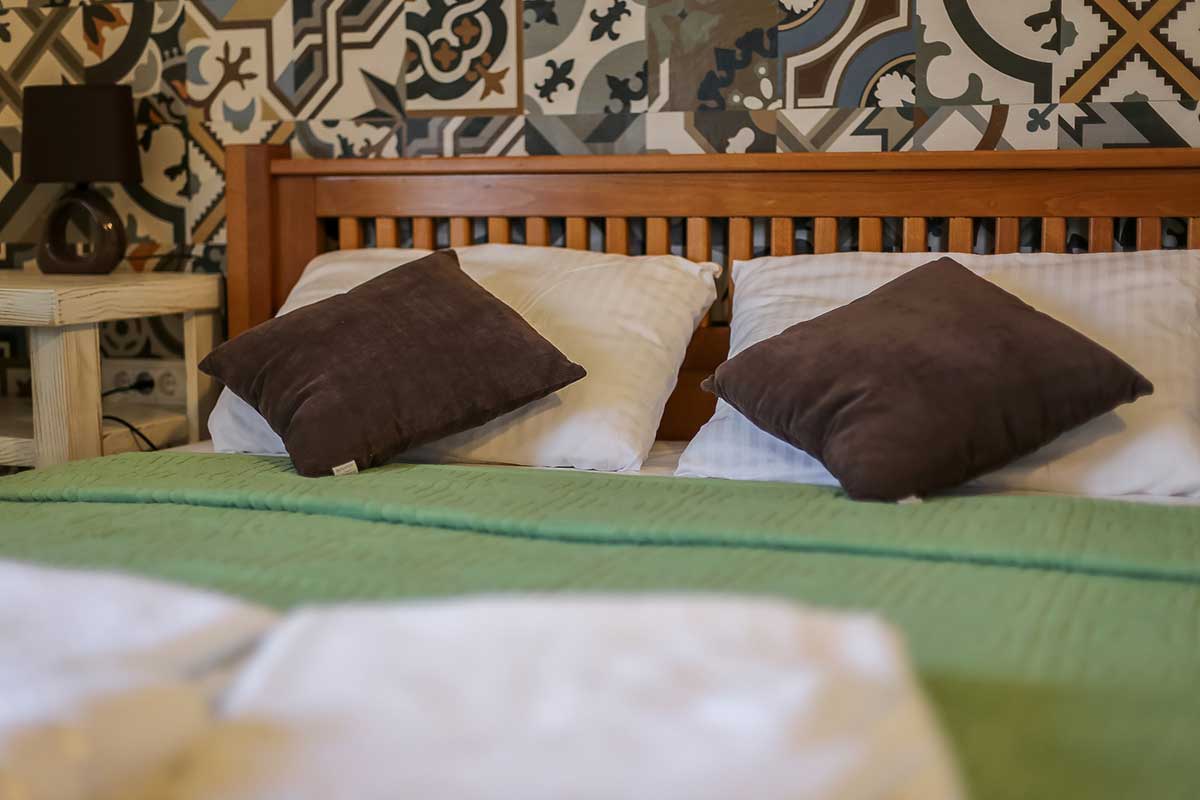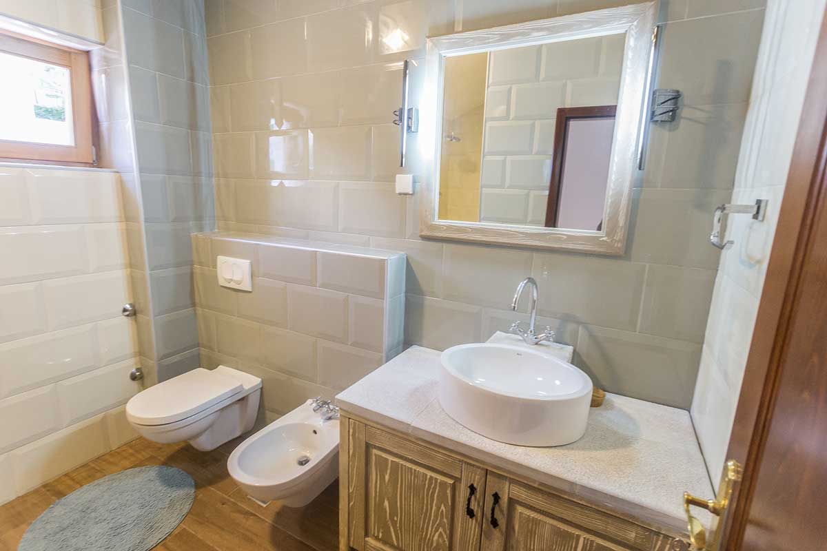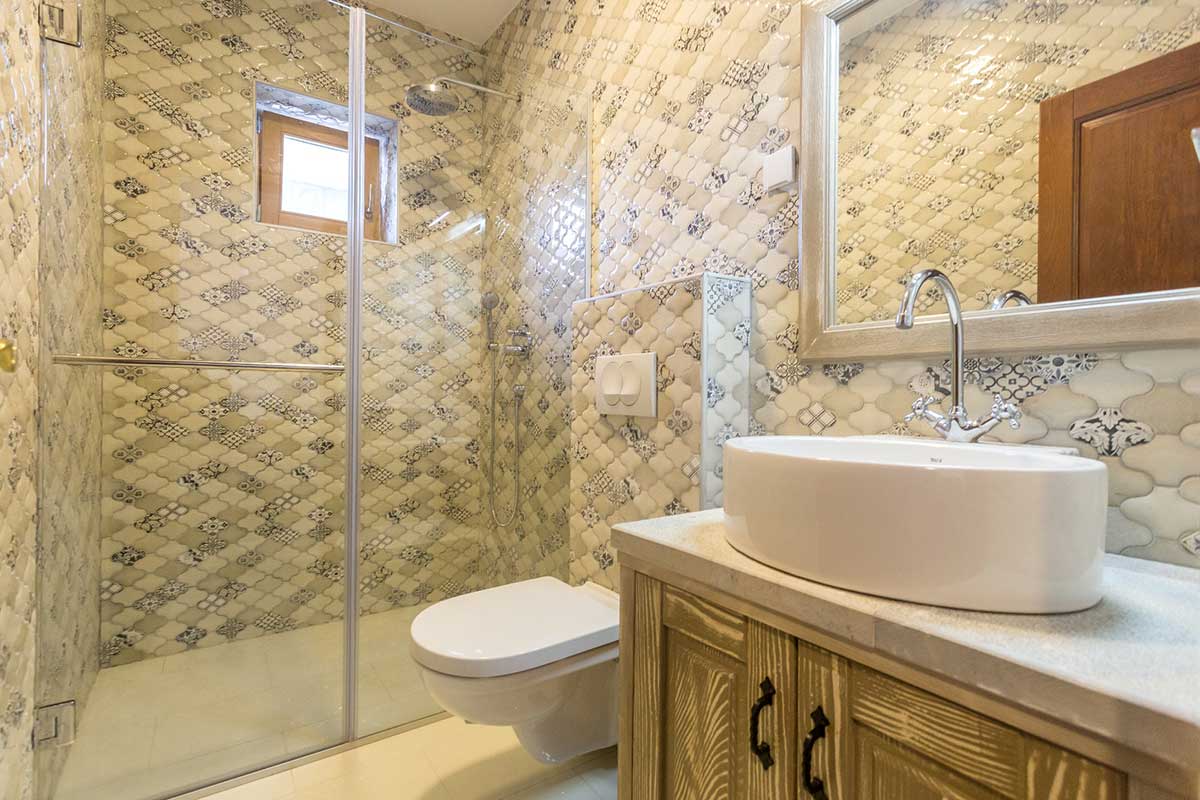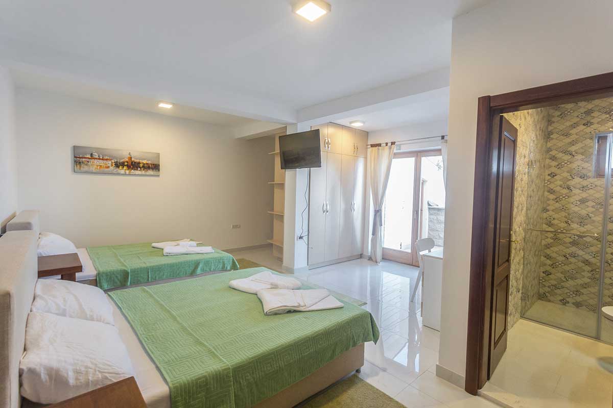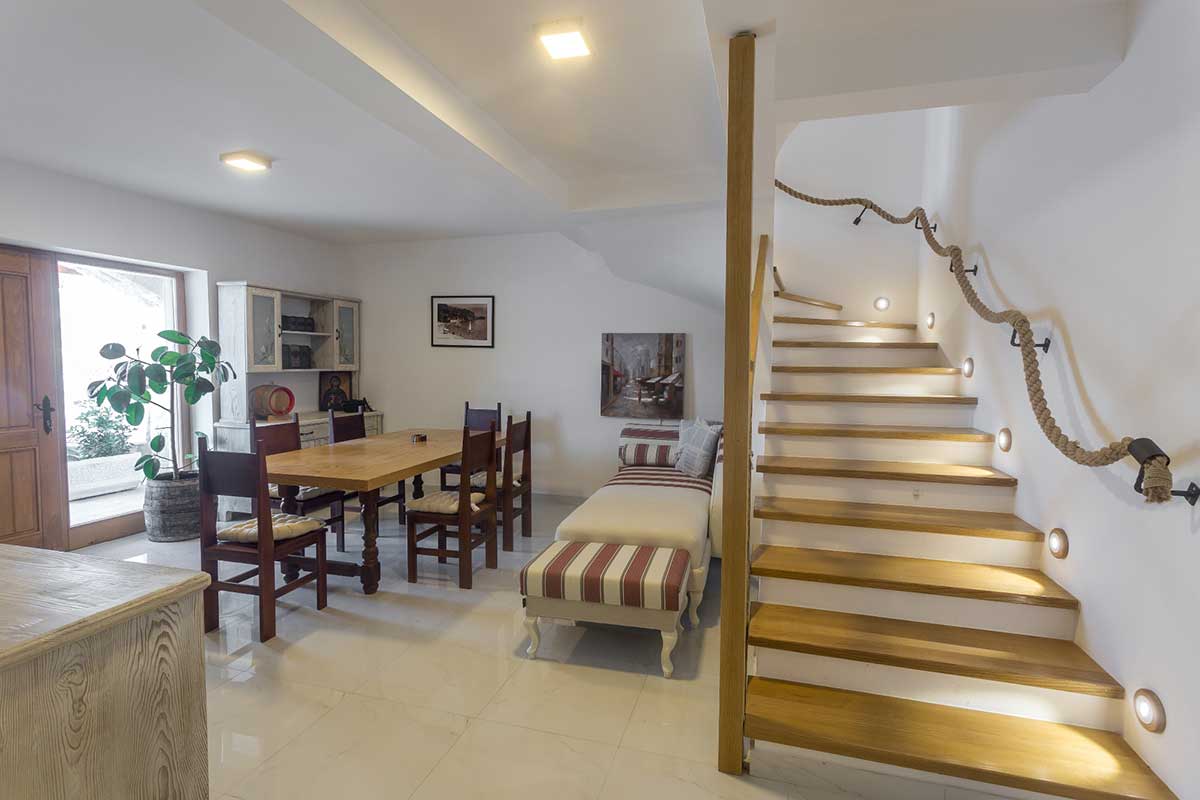 Up the staircase from the first floor, the Master bedroom comprises a double bed king size set against a mosaic-styled back wall, adding that tad bit of unique and unusual to the space. Large glass doors instead of windows fill this room with both natural light and beautiful imagery of the Sea and the Montenegrin coast.