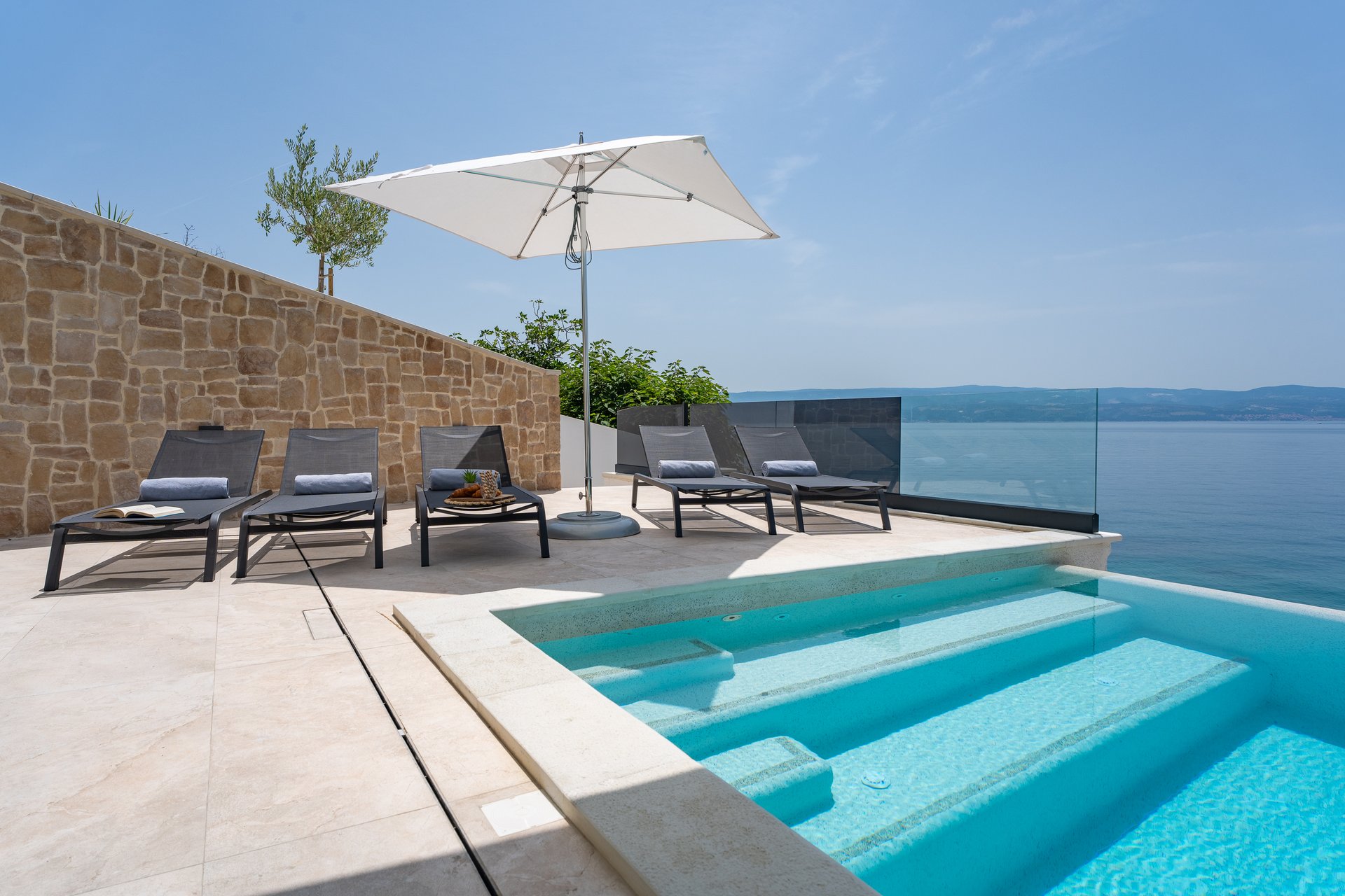 For guests who prefer swimming pool, villa features an infinity swimming pool with a spectacular view of the Adriatic sea. Each of the 5 bedrooms has a large double bed.