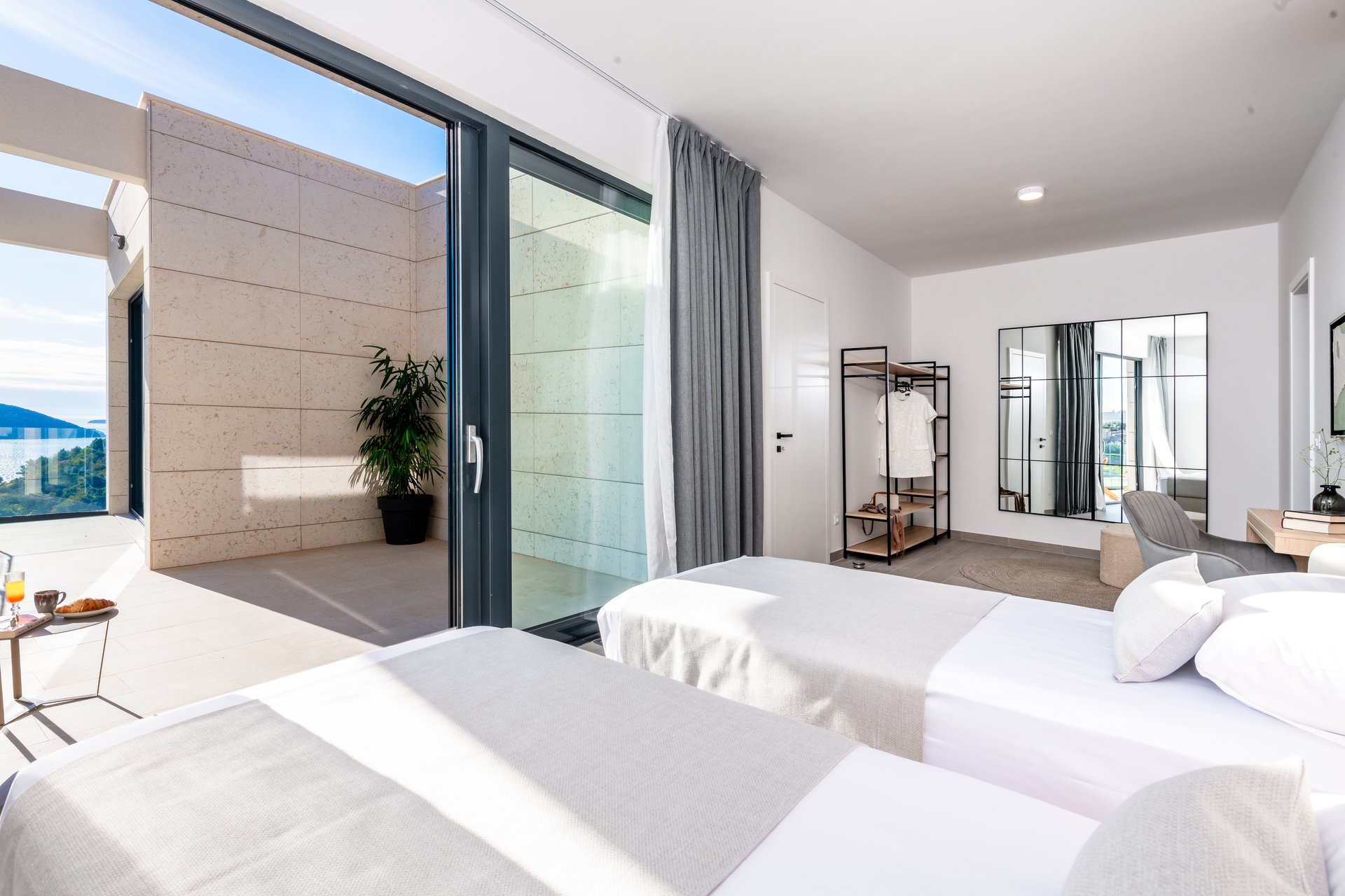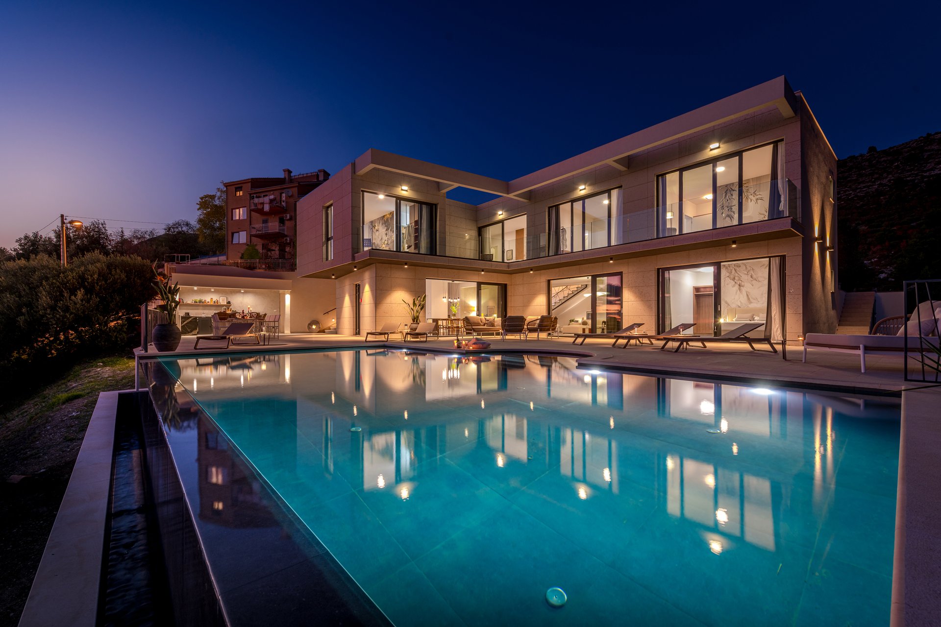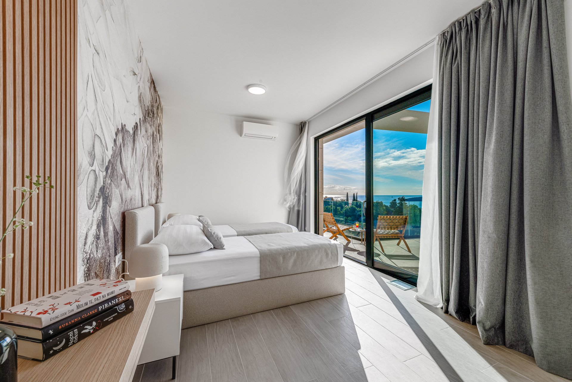 Set on an expansive 800 m² plot, with 290 m² of refined interior space, Villa NAVORA comfortably accommodates up to 10 guests. The villa is elegantly distributed across two floors, featuring five spacious bedrooms—one located on the ground floor, and four on the upper level. Each bedroom is designed with premium comfort in mind and furnished with a king-size bed (over 180 cm). One of the rooms also offers the flexibility to convert the bed into twin beds upon request.