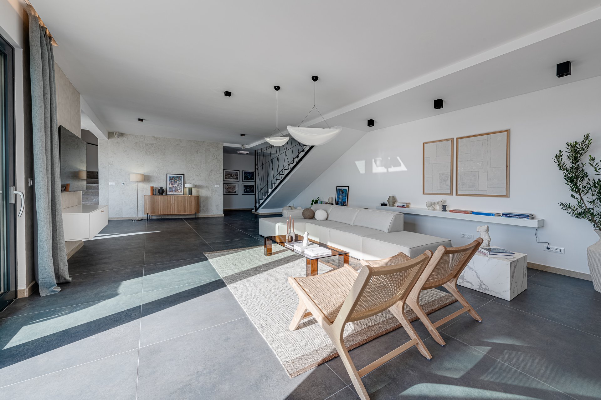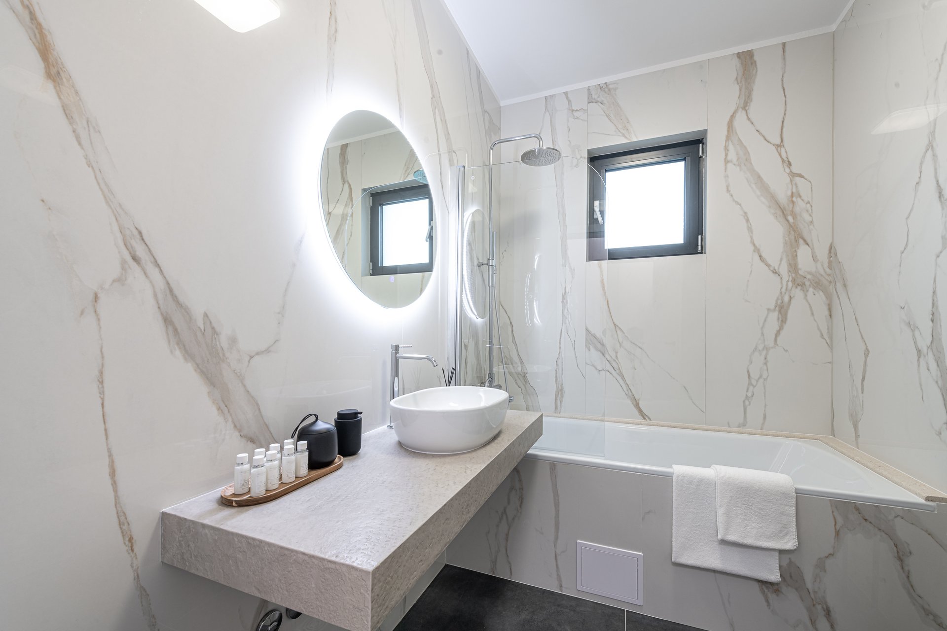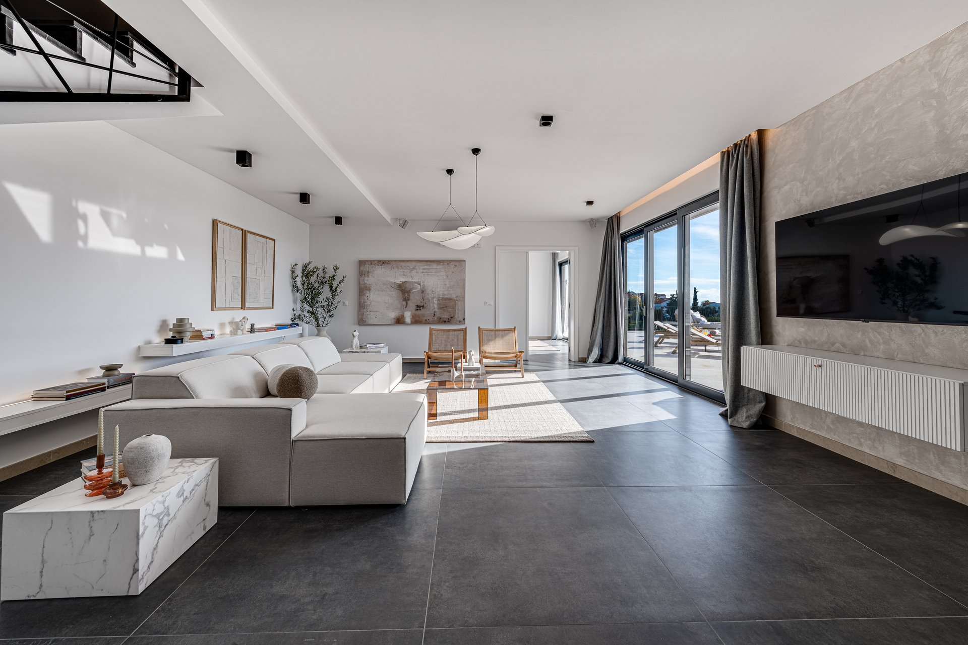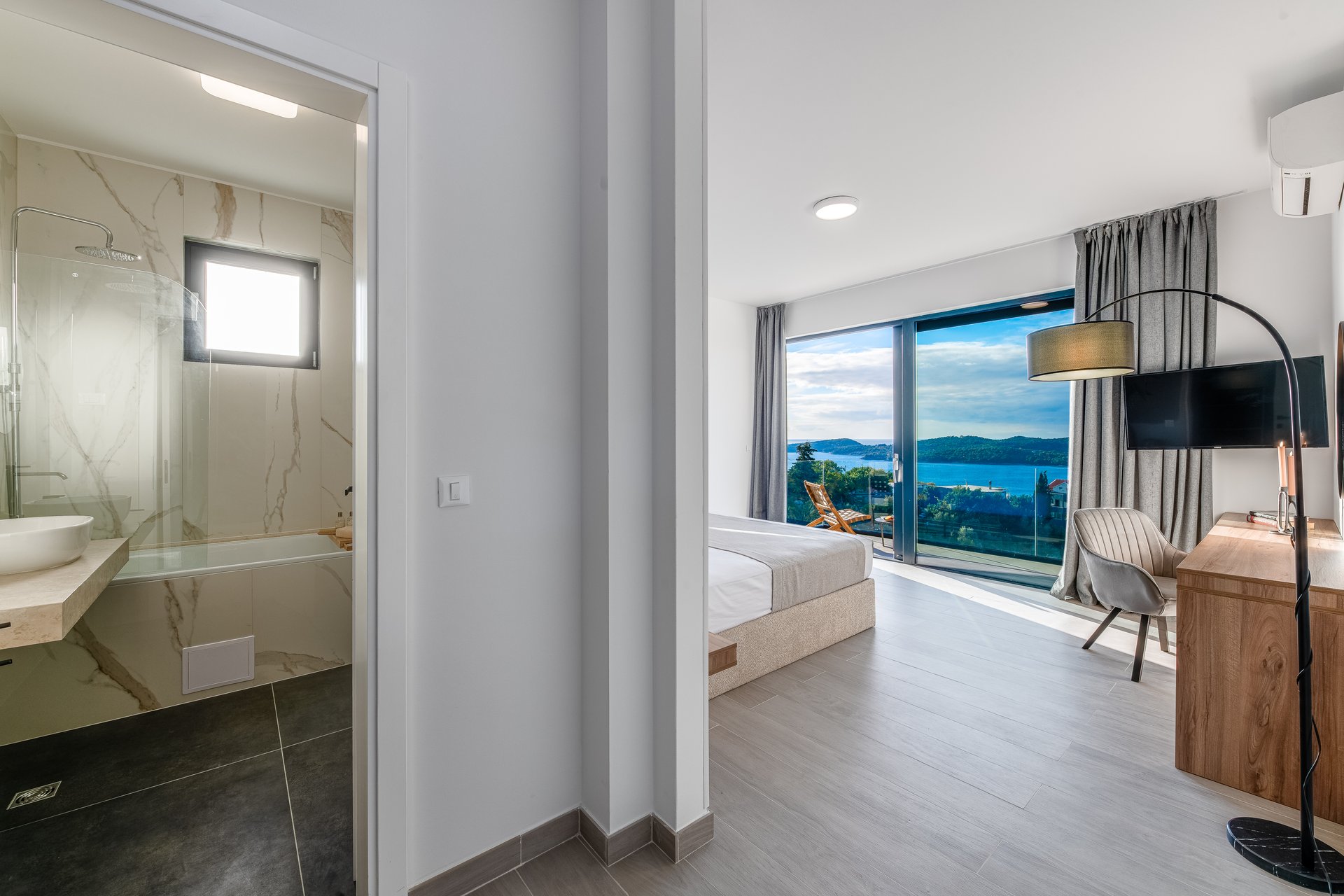 Set on an expansive 800 m² plot, with 290 m² of refined interior space, Villa NAVORA comfortably accommodates up to 10 guests. The villa is elegantly distributed across two floors, featuring five spacious bedrooms—one located on the ground floor, and four on the upper level. Each bedroom is designed with premium comfort in mind and furnished with a king-size bed (over 180 cm). One of the rooms also offers the flexibility to convert the bed into twin beds upon request.