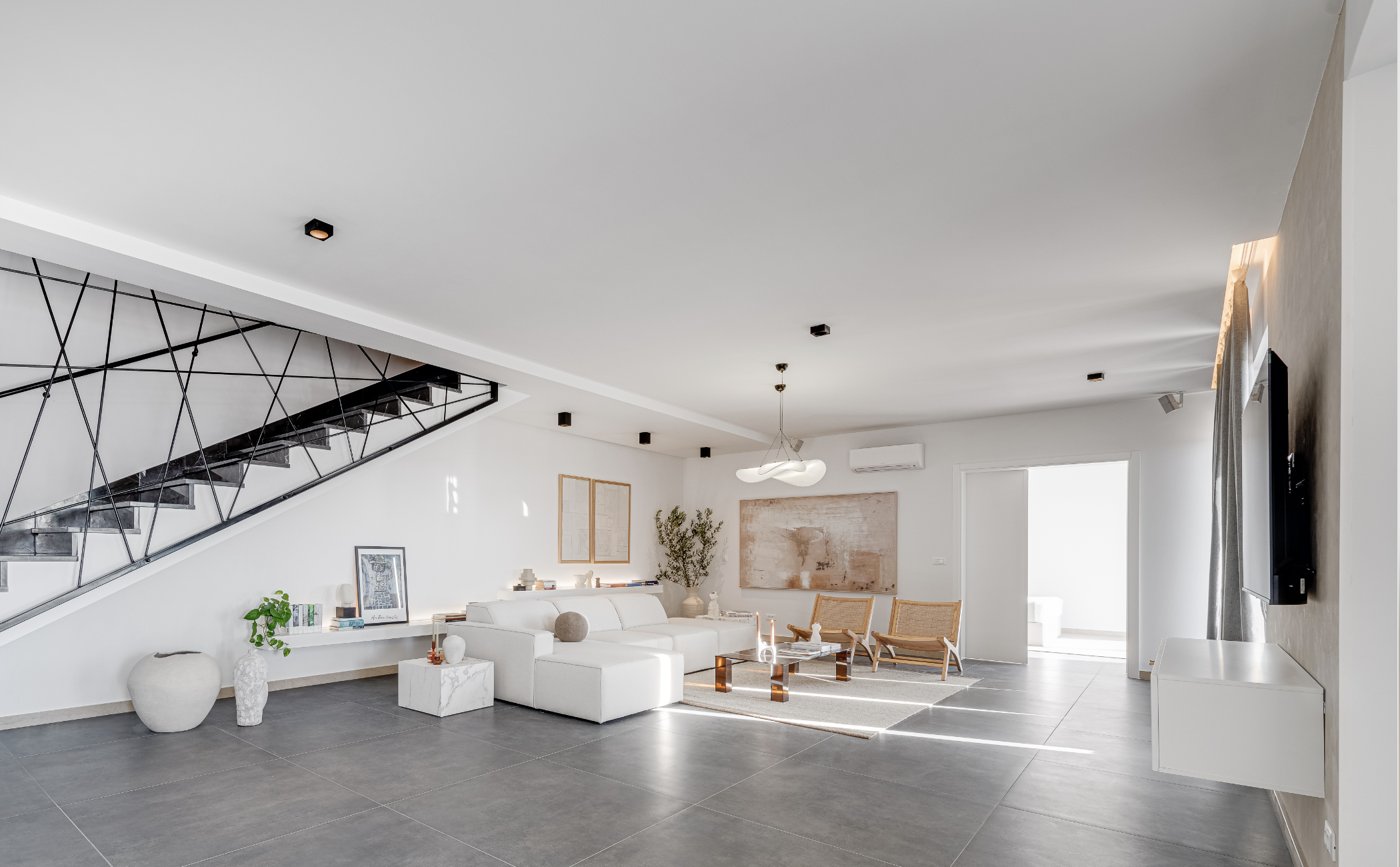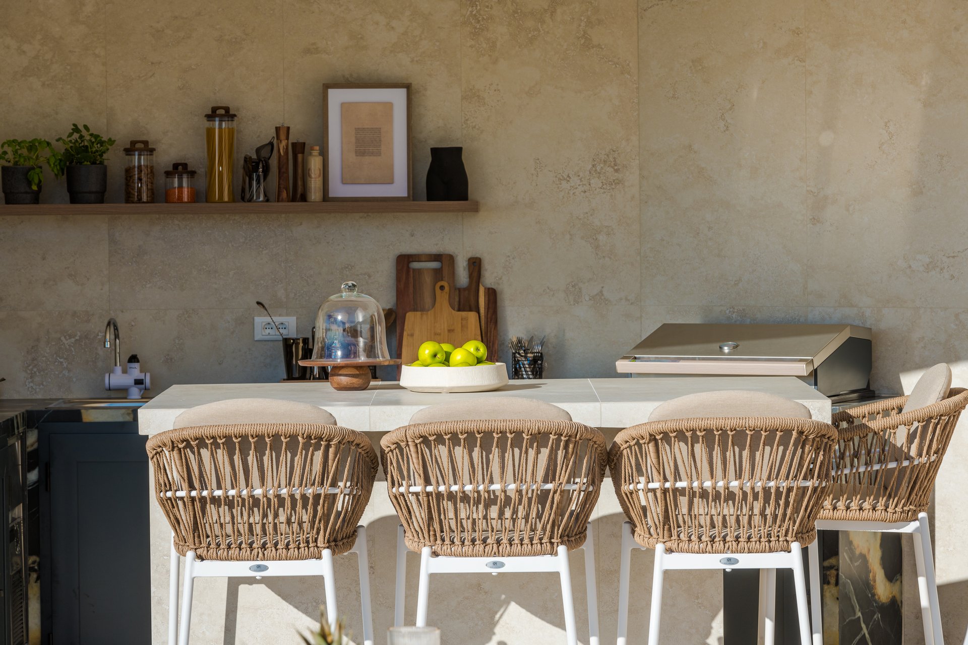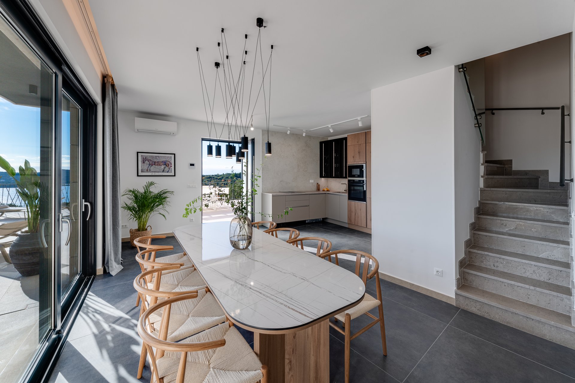 The bedrooms are enhanced with sea-view balconies, with the exception of the ground-floor suite, which features its own private terrace. For added comfort, all rooms are equipped with air conditioning and Wi-Fi, while four bedrooms also include flat-screen TVs for entertainment.
