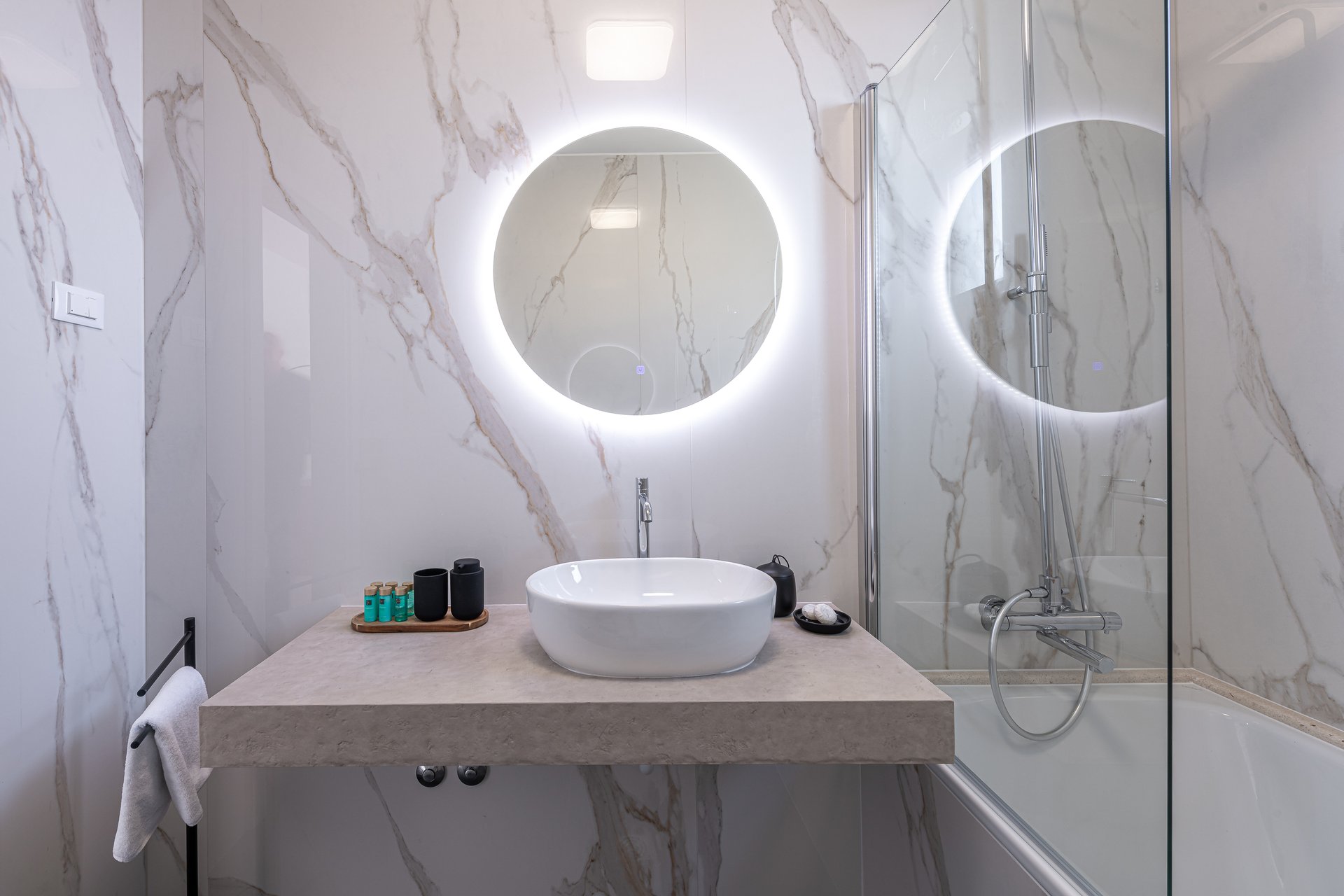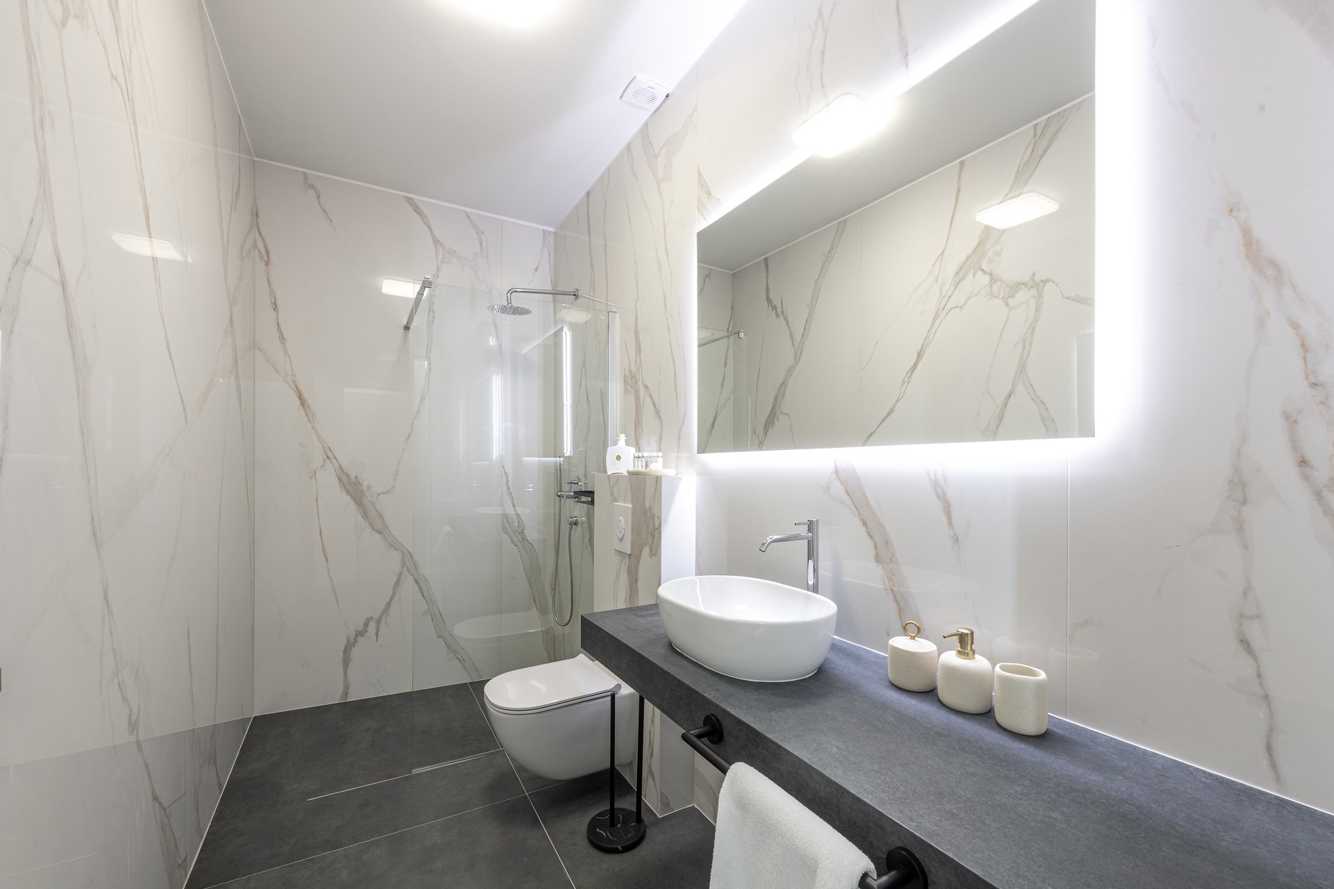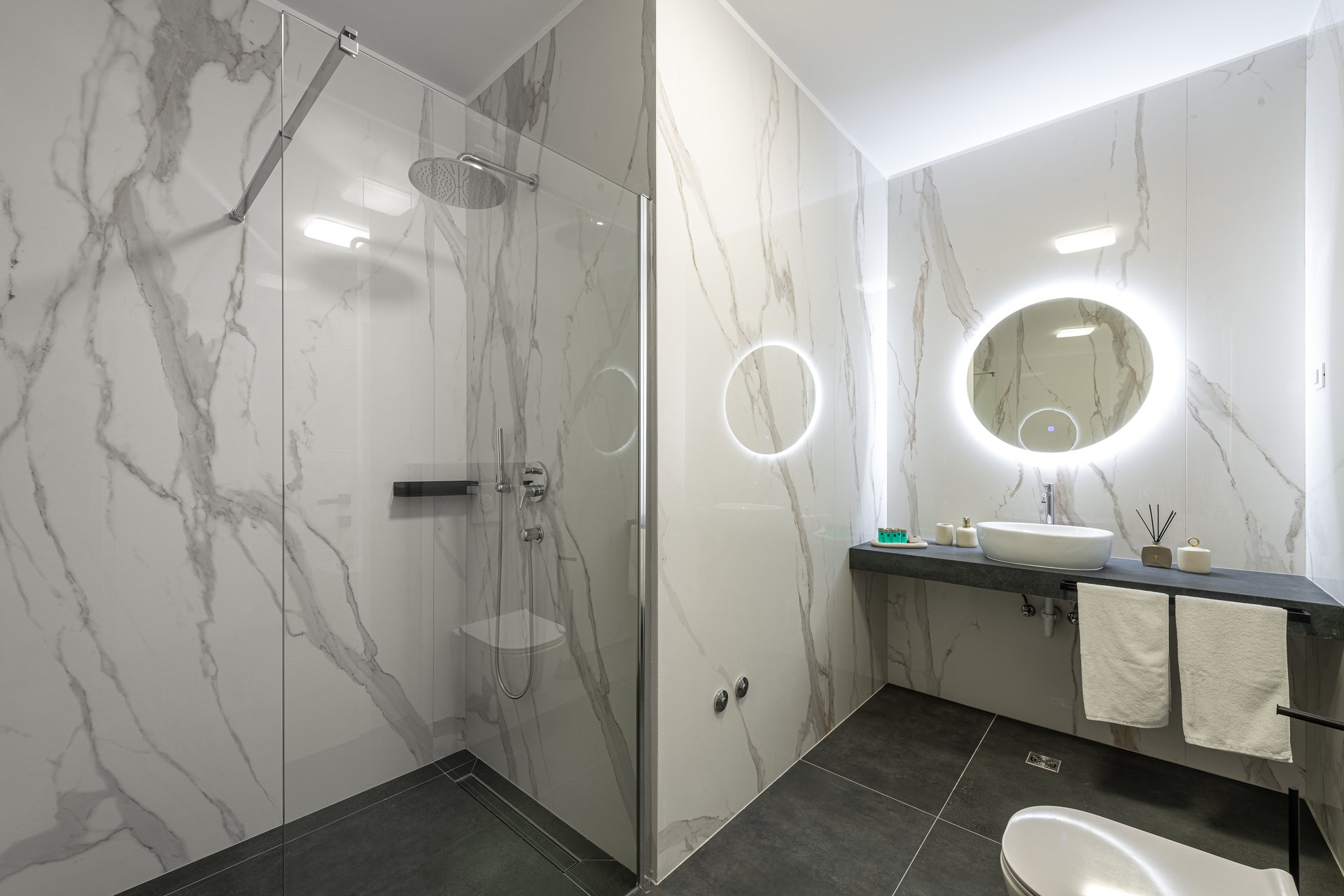 All five bedrooms boast ensuite bathrooms, ensuring the utmost privacy and convenience for guests. Two of the bathrooms include bathtubs, while the others are equipped with modern walk-in showers, combining style with functionality.