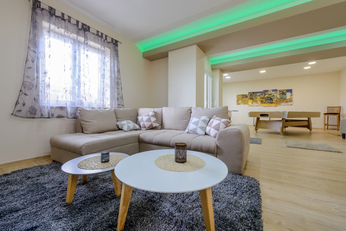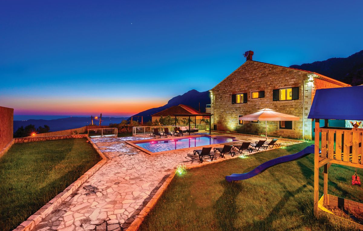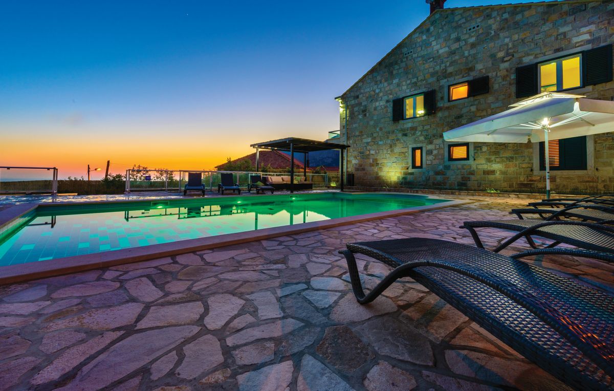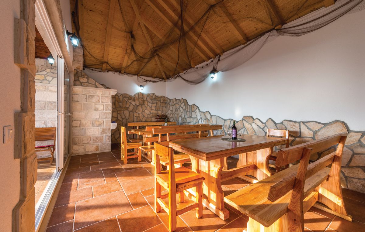 The upper floor also features three double bedrooms and two bathrooms. The fully equipped kitchen with an elegant dining area continues onto a lounge with many entertainment options, from SAT TV and DVD to PlayStation and I-pod dock. The signature of the upper floor is its rustic indoor barbecue with several wooden beer tables, ideal for spending time together enveloped in the traditional Dalmatian dinner preparation – grilling! Some fresh fish of the grill is best served in the adjacent glass-paned terrace featuring a large dining table, just ideal for familial meals over stunning views.