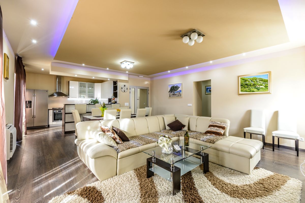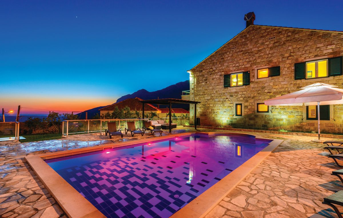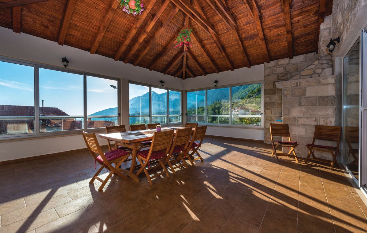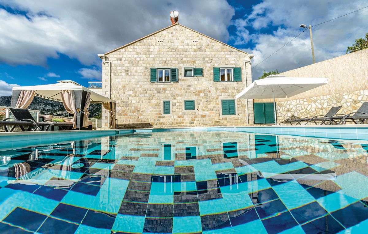 The upper floor also features three double bedrooms and two bathrooms. The fully equipped kitchen with an elegant dining area continues onto a lounge with many entertainment options, from SAT TV and DVD to PlayStation and I-pod dock. The signature of the upper floor is its rustic indoor barbecue with several wooden beer tables, ideal for spending time together enveloped in the traditional Dalmatian dinner preparation – grilling! Some fresh fish of the grill is best served in the adjacent glass-paned terrace featuring a large dining table, just ideal for familial meals over stunning views.