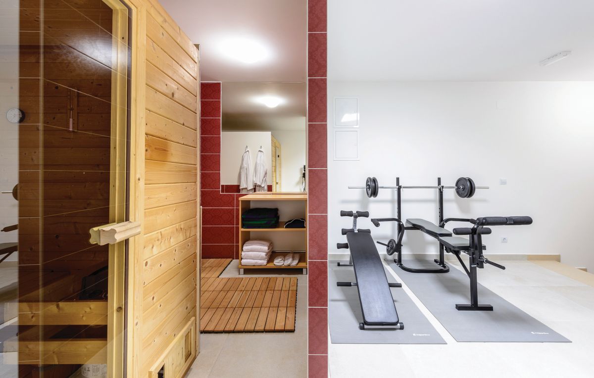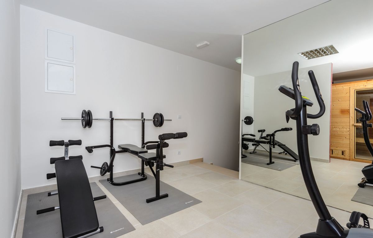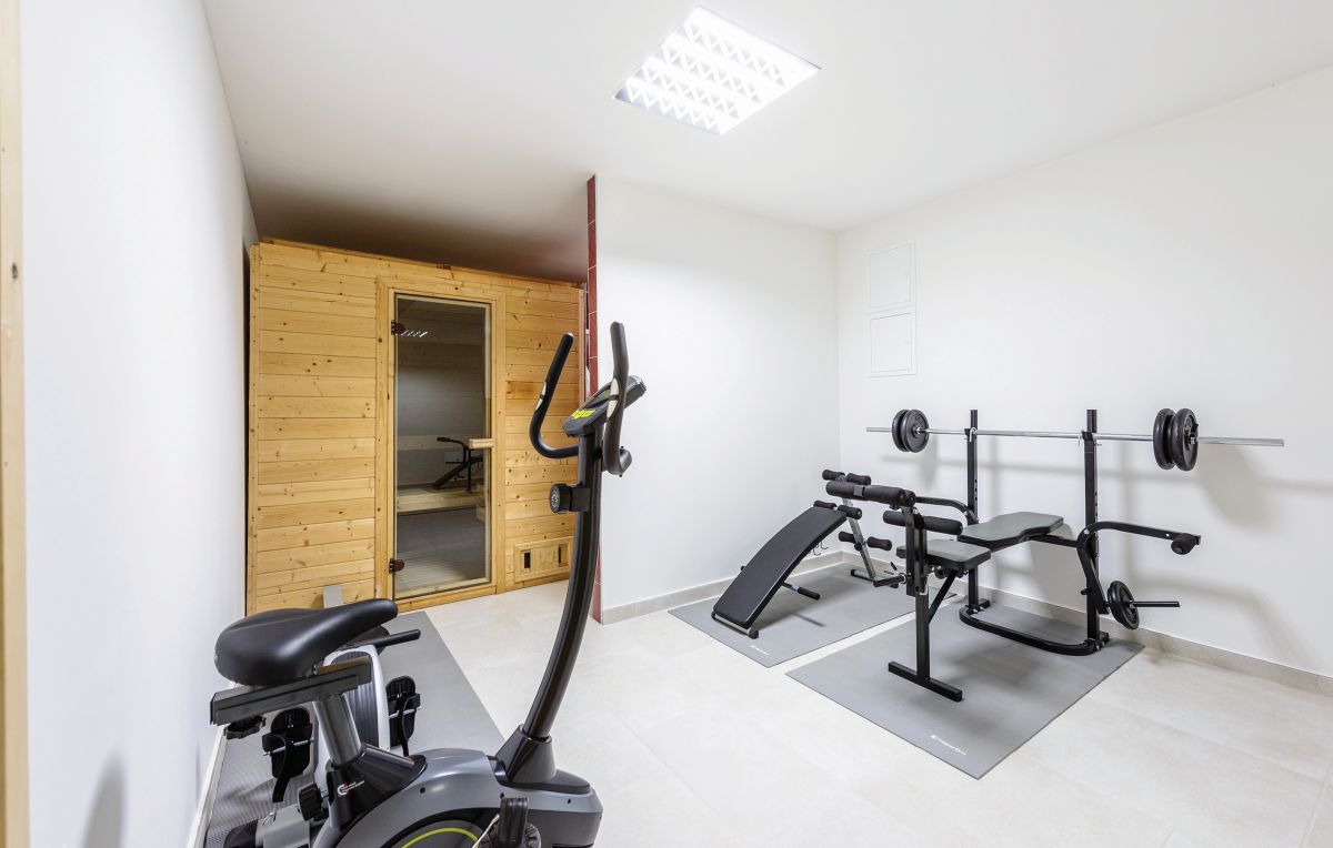 The highlight is by far the expansive stone terrace with a 9x5 meters heated pool, lined with sun loungers but also a shaded gazebo area. There’s a particular charm for parents and guardians here, as the kids play area sits within a glance. Thus, you can at the same time relax around the pool and keep an eye on your playful little ones. To get your blood pumping outside, enjoy a game of table tennis and to keep to your health and fitness regime, enjoy the well-equipped exercise room with a sauna and an adjacent shower room with a Jacuzzi tub.