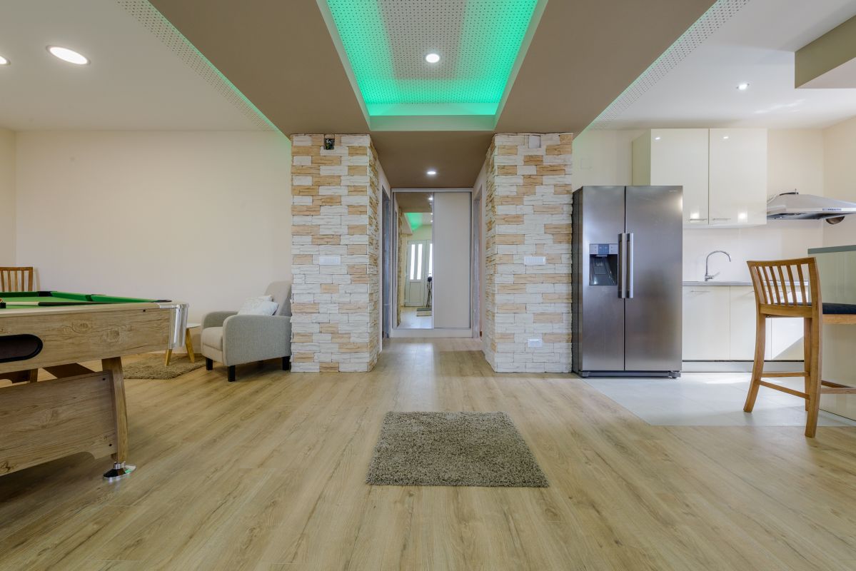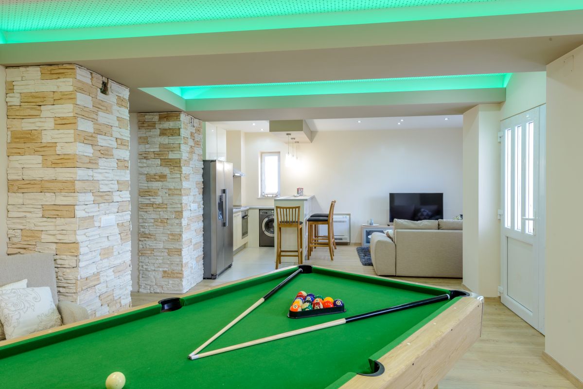 The ground floor consists of three bedrooms, two doubles and a twin, and two bathrooms, one en suite and the other one shared. The open concept area includes a kitchen with a breakfast bar and a comfortable lounge, both connected to the game room with pool and football tables.