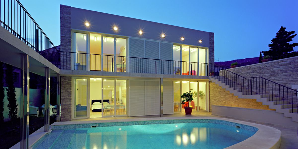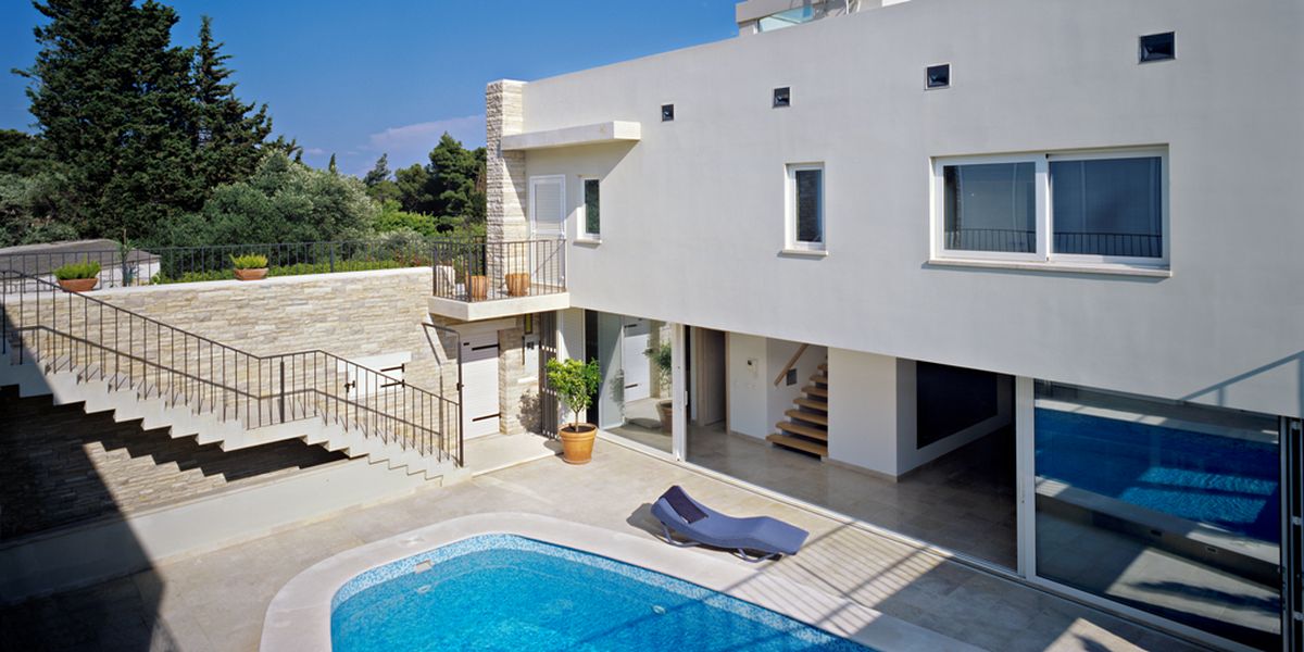 Villa has a modern architectural design, still using local materials like Brač stone. Such a stone path leads to not one but two separate dwellings, each connected by an inner courtyard. Nestled in between and hidden from views there is a beautiful swimming pool and surrounding terrace paved with local Brač stone.