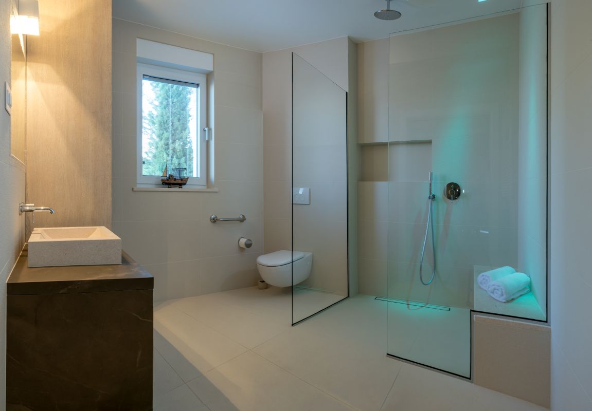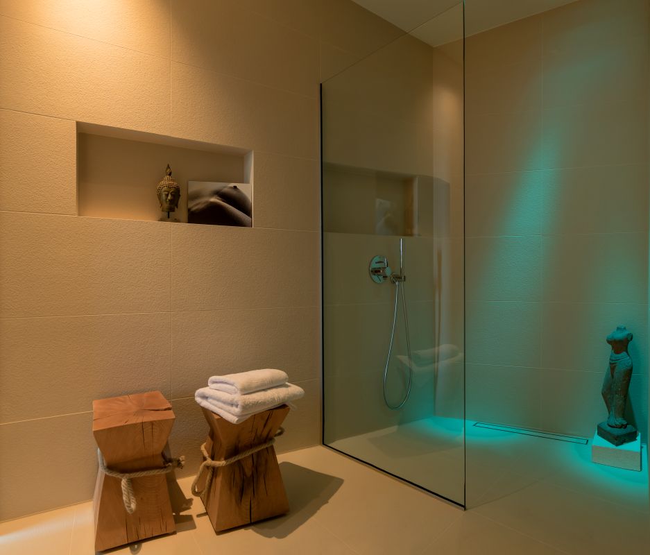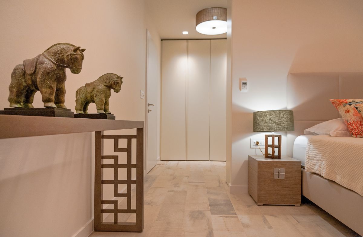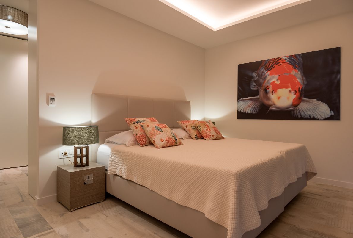 This modern 6 bedrooms, 7 bathrooms villa can conveniently accommodate up to 12 guests. Each room has its own terrace, a king size bed (of which 4 are separable), an ensuite bathroom and highspeed internet. One bathroom is suitable for disabled people, it has an enlarged showering area with a bench. Every room was thoughtfully designed in its own unique style.