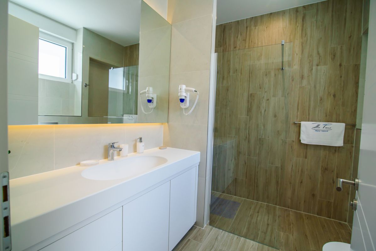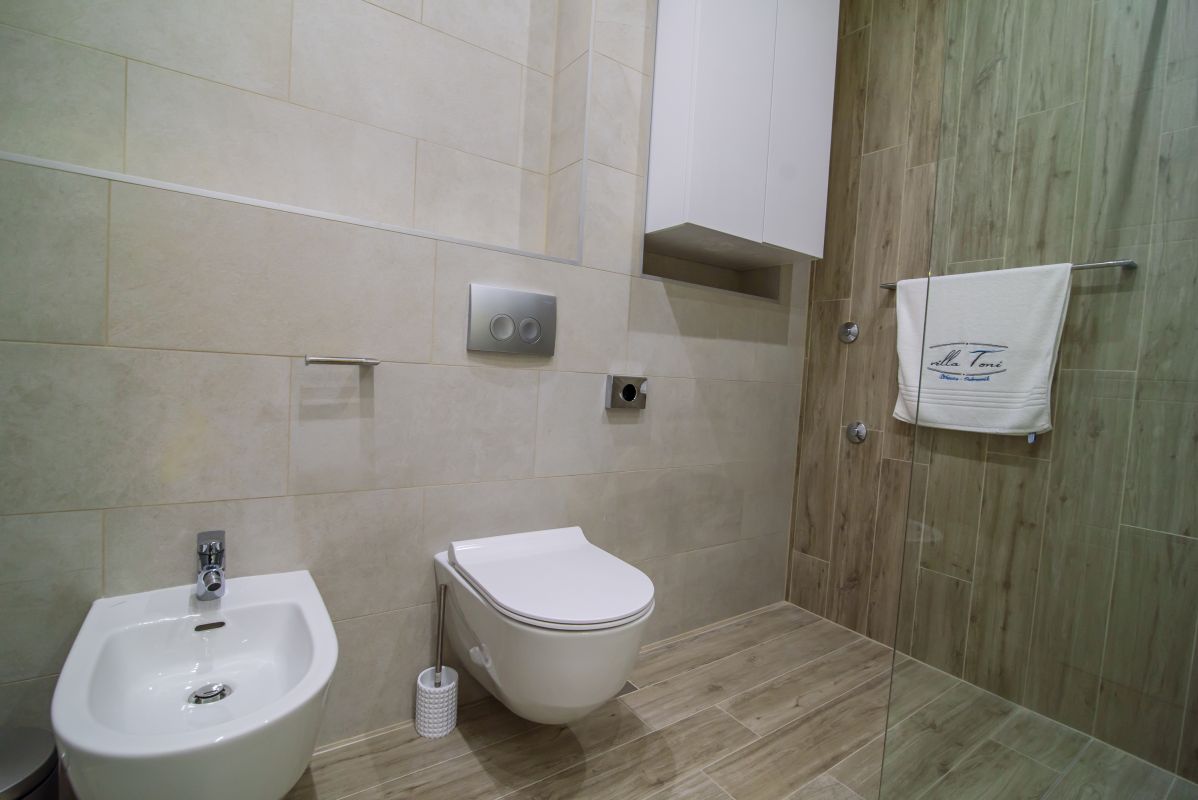Villa Toni has five bedrooms. One sits behind a discreet passage which backs the kitchen and conceals a small service area with a laundry room and a guest toilette.