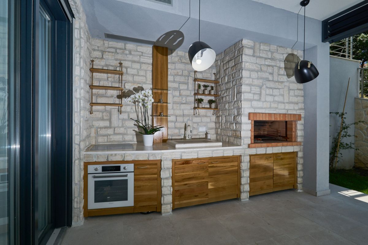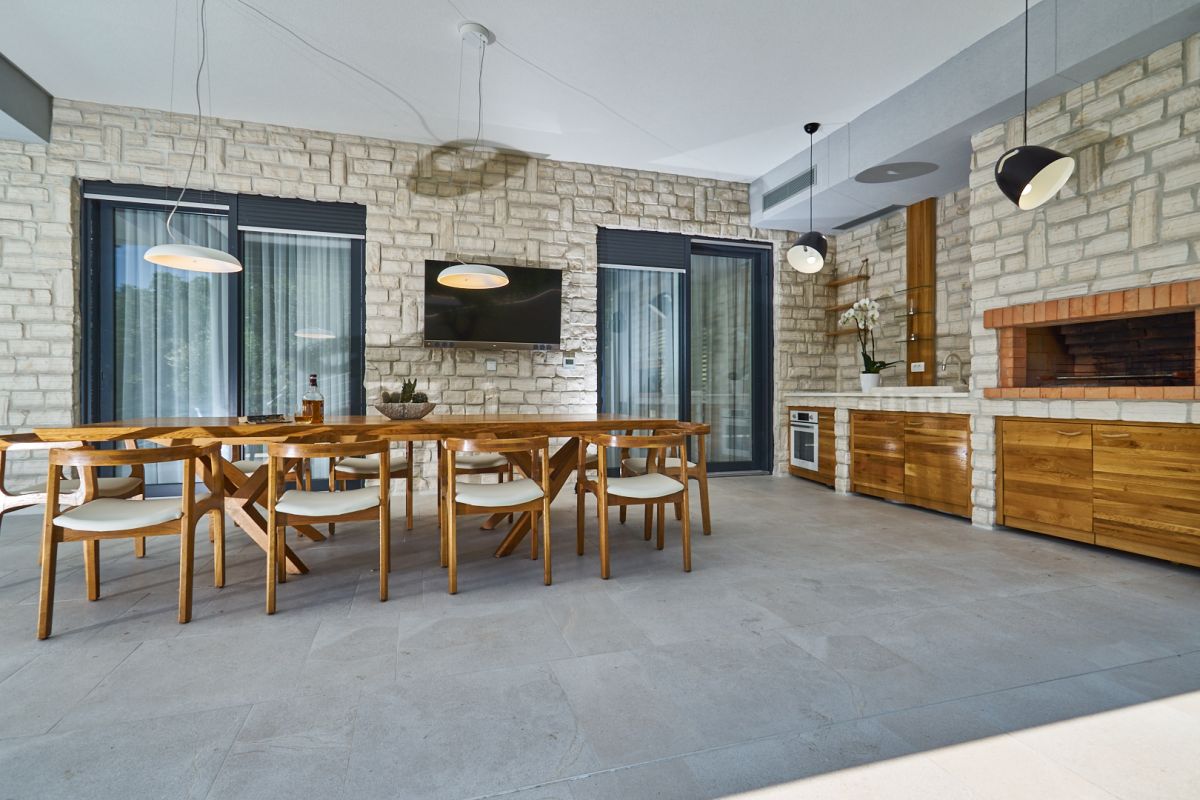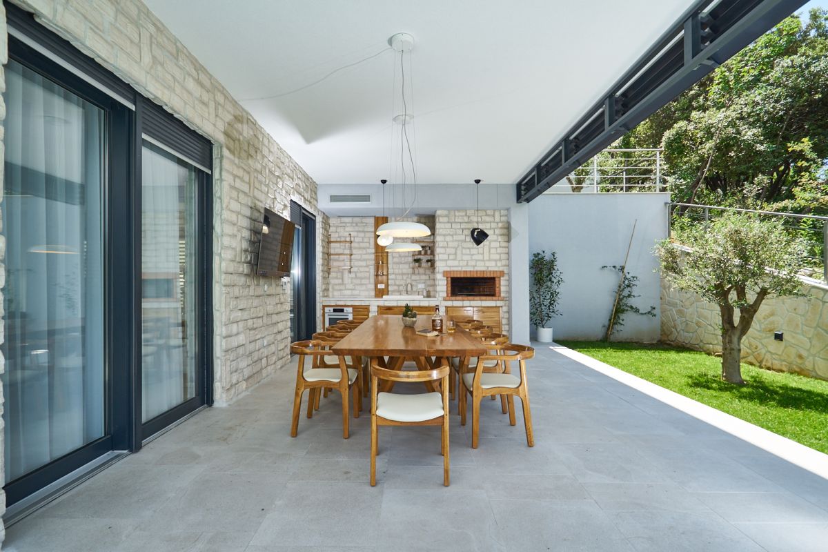 Cooking and eating together is a very local thing to do, so to the side of the living room, a shaded terrace features an open kitchen with a fireplace, outdoor stove and lavatory, and a dining table for 10. Another large screen TV here ensures that nothing important goes missed. Facing a wall of carob and olive trees, the quality time on this terrace is to be enjoyed in complete privacy.
