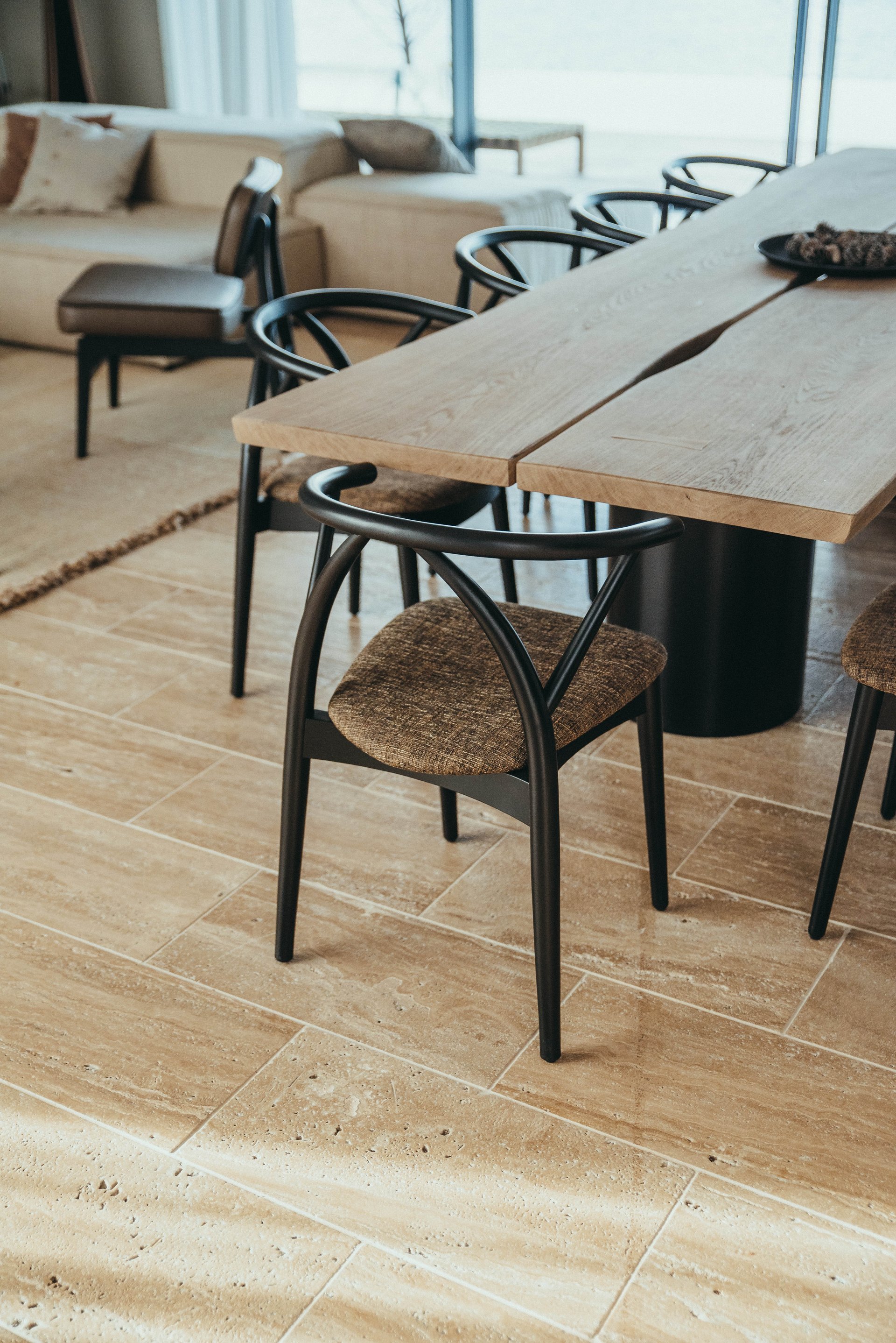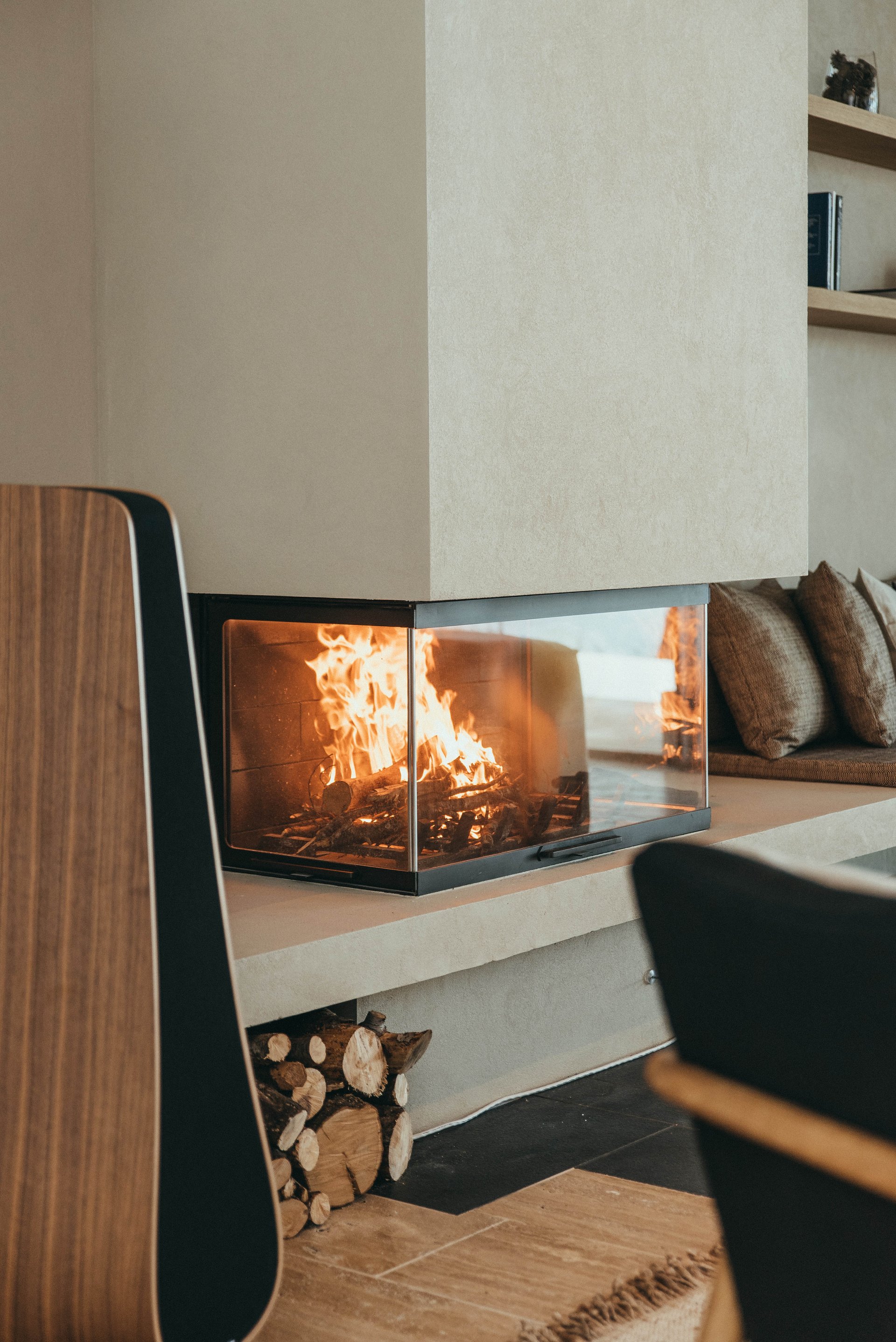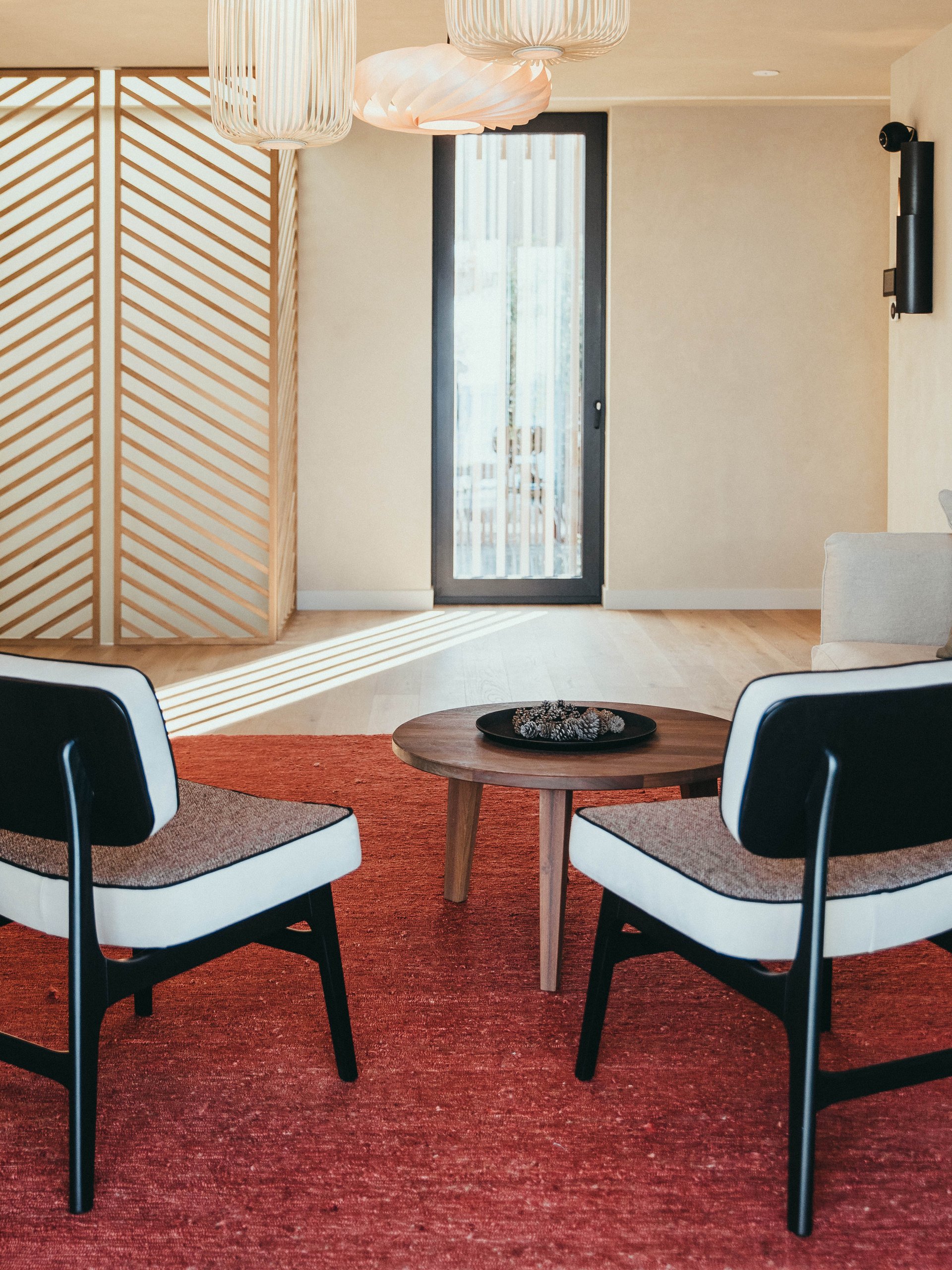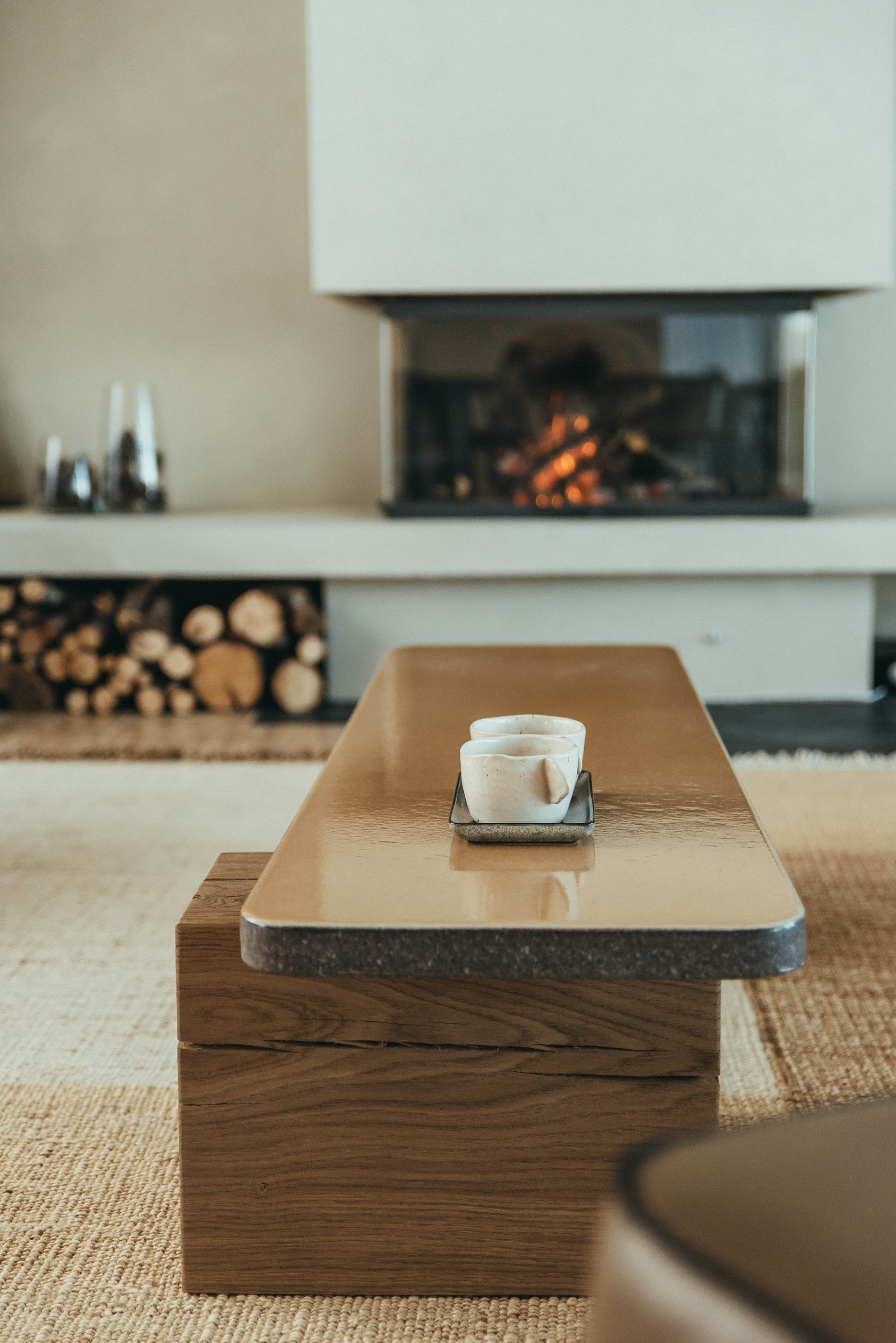 The minimalistic interiors draw influences from Japanese and French design for a unique, modern feel. The open-plan living area comprises a lounge area with fireplace for cozy nights in and a wooden dining table for elegant meals. Glass doors on either side open to the villa’s private grounds, allowing cool summer breezes to flow through the space. A terrace stretches across the property, offering space to relax and appreciate the breathtaking views. Sun beds line a 55-metre heated infinity pool, and a cozy outdoor seating area surrounds a relaxing Jacuzzi. There is also an al fresco dining area with direct access to the kitchen and an outdoor shower room.