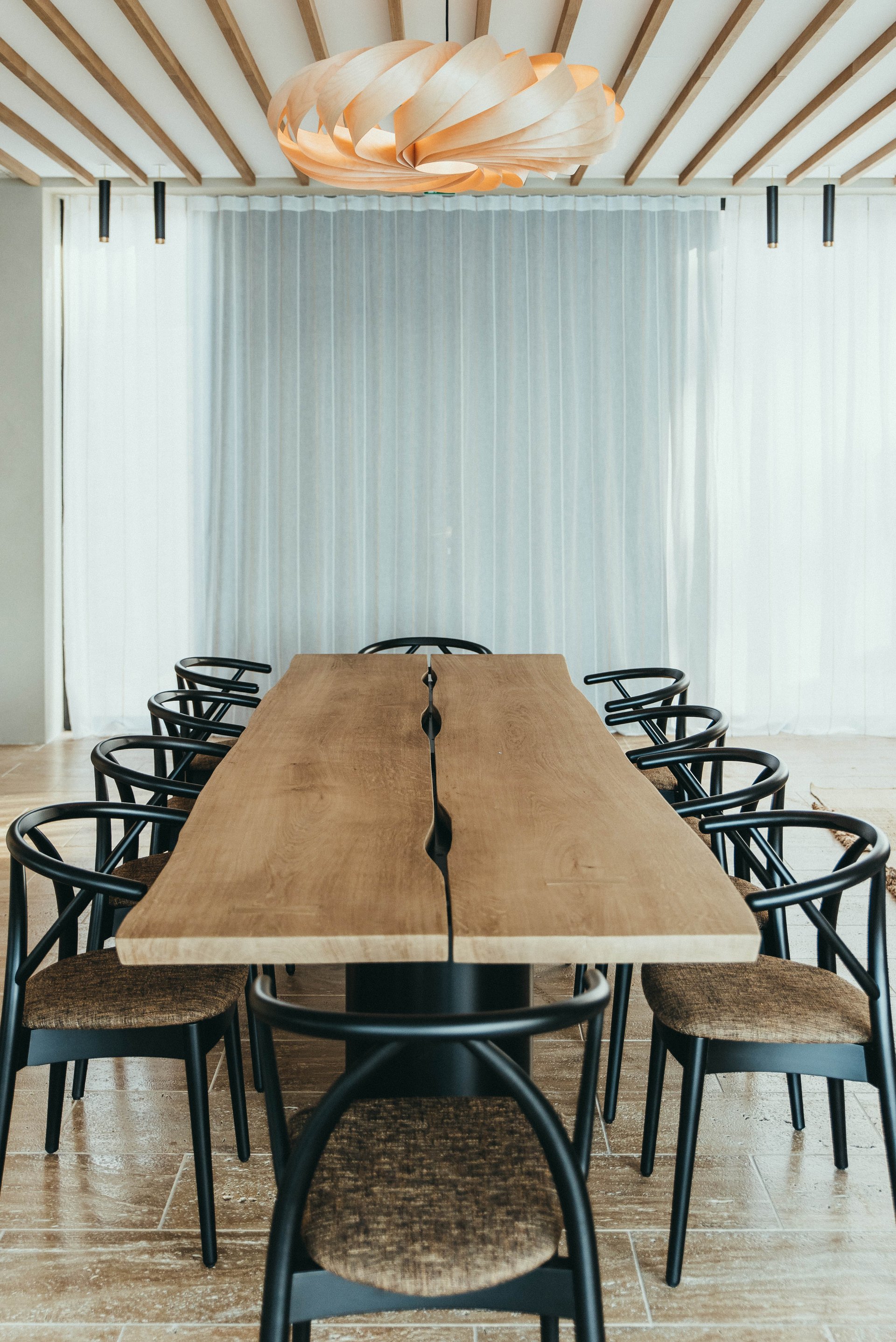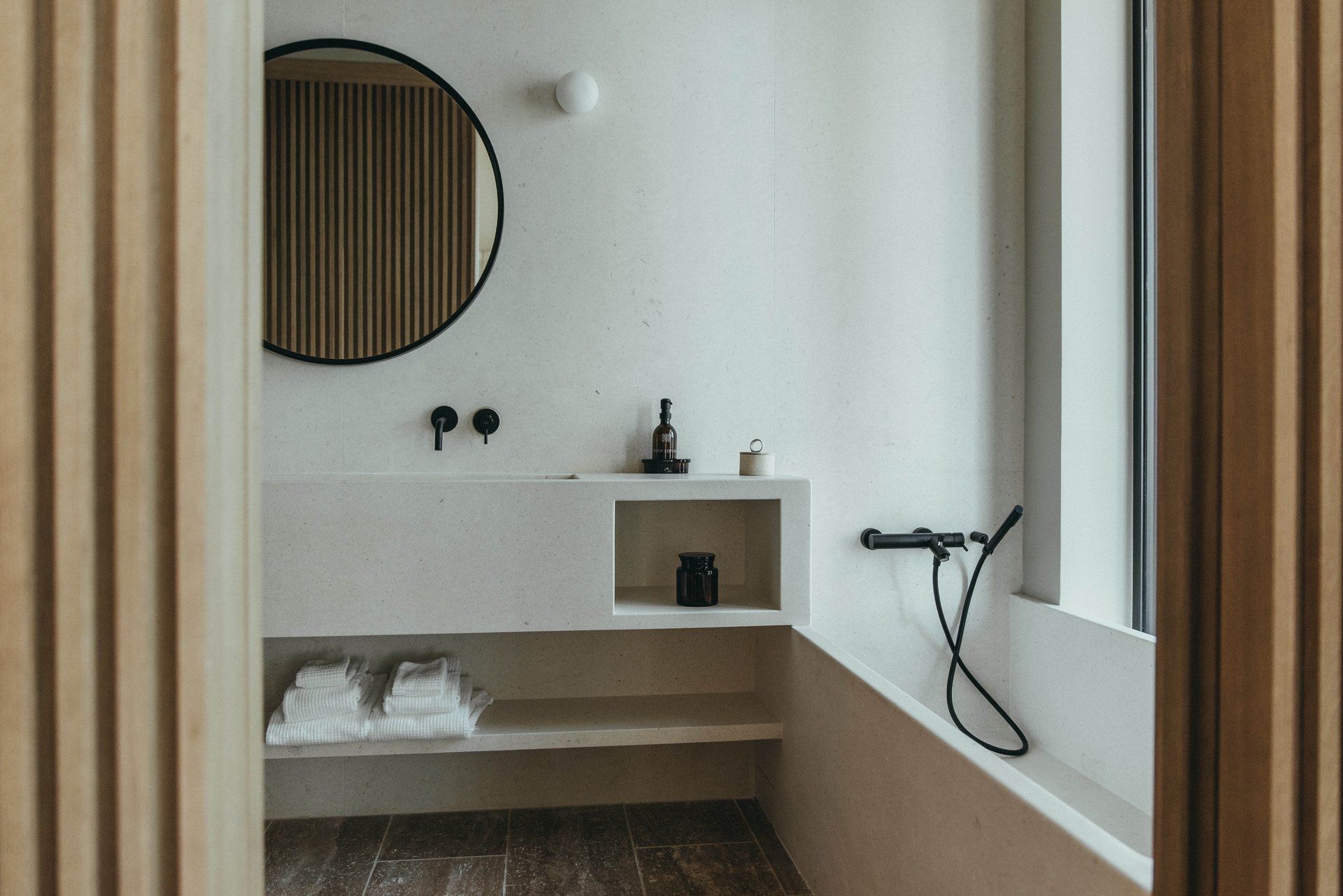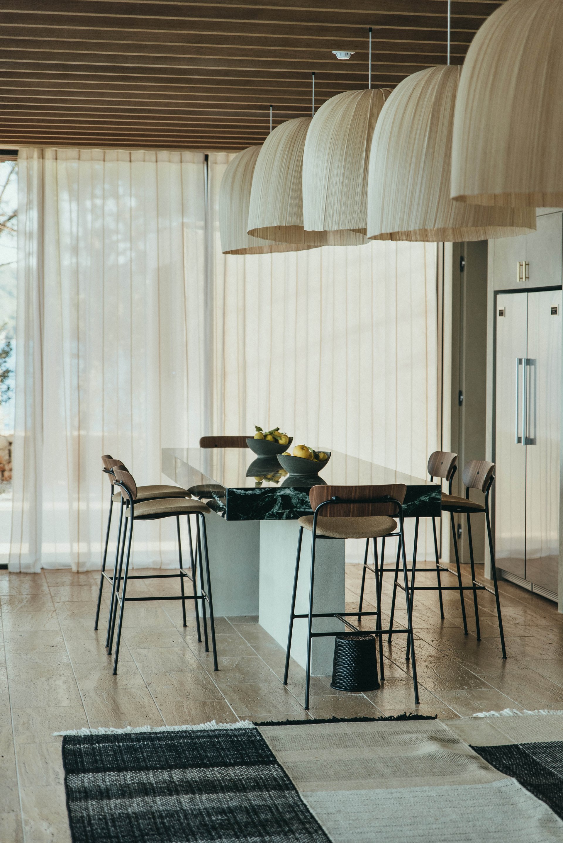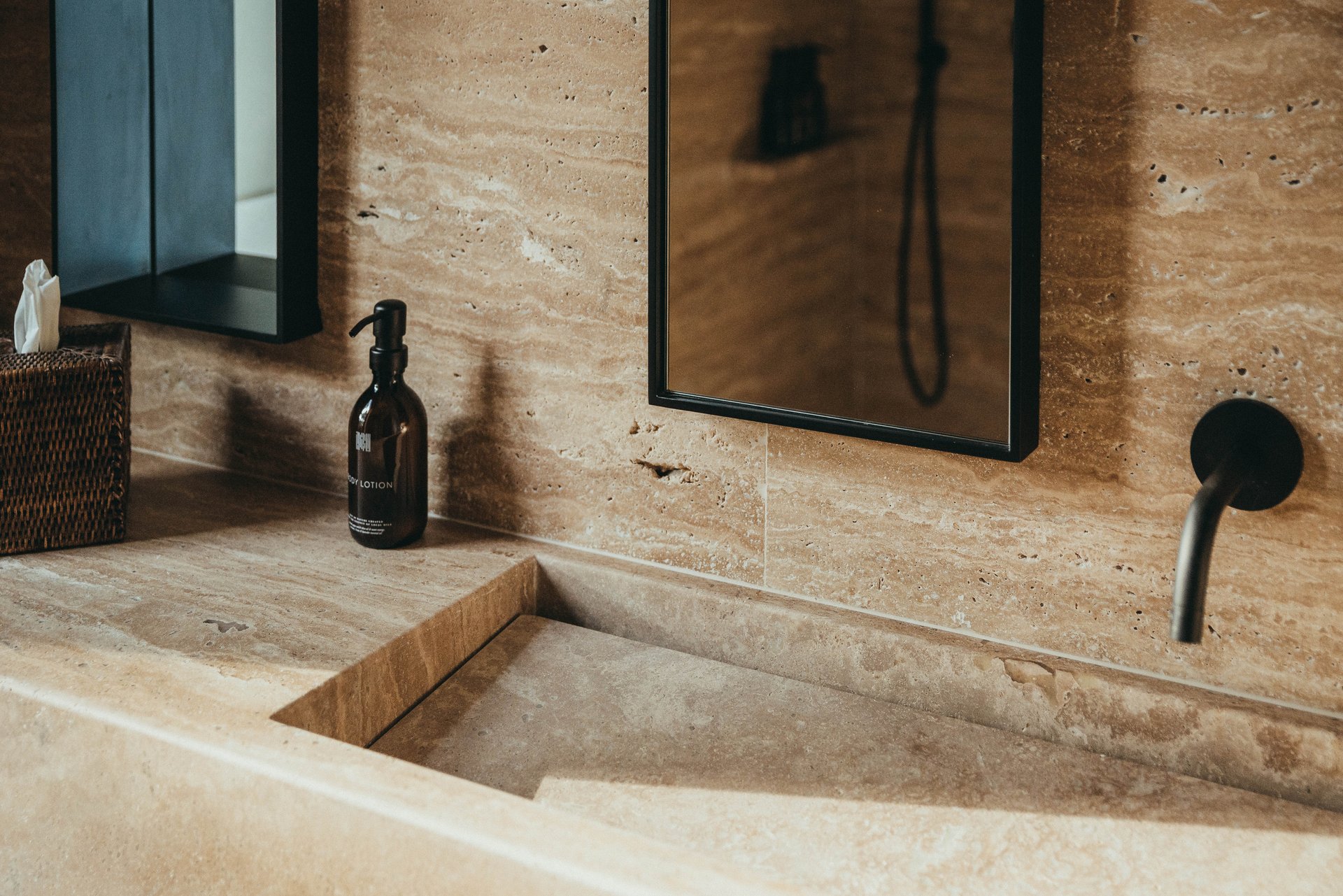 The minimalistic interiors draw influences from Japanese and French design for a unique, modern feel. The open-plan living area comprises a lounge area with fireplace for cozy nights in and a wooden dining table for elegant meals. Glass doors on either side open to the villa’s private grounds, allowing cool summer breezes to flow through the space. A terrace stretches across the property, offering space to relax and appreciate the breathtaking views. Sun beds line a 55-metre heated infinity pool, and a cozy outdoor seating area surrounds a relaxing Jacuzzi. There is also an al fresco dining area with direct access to the kitchen and an outdoor shower room.